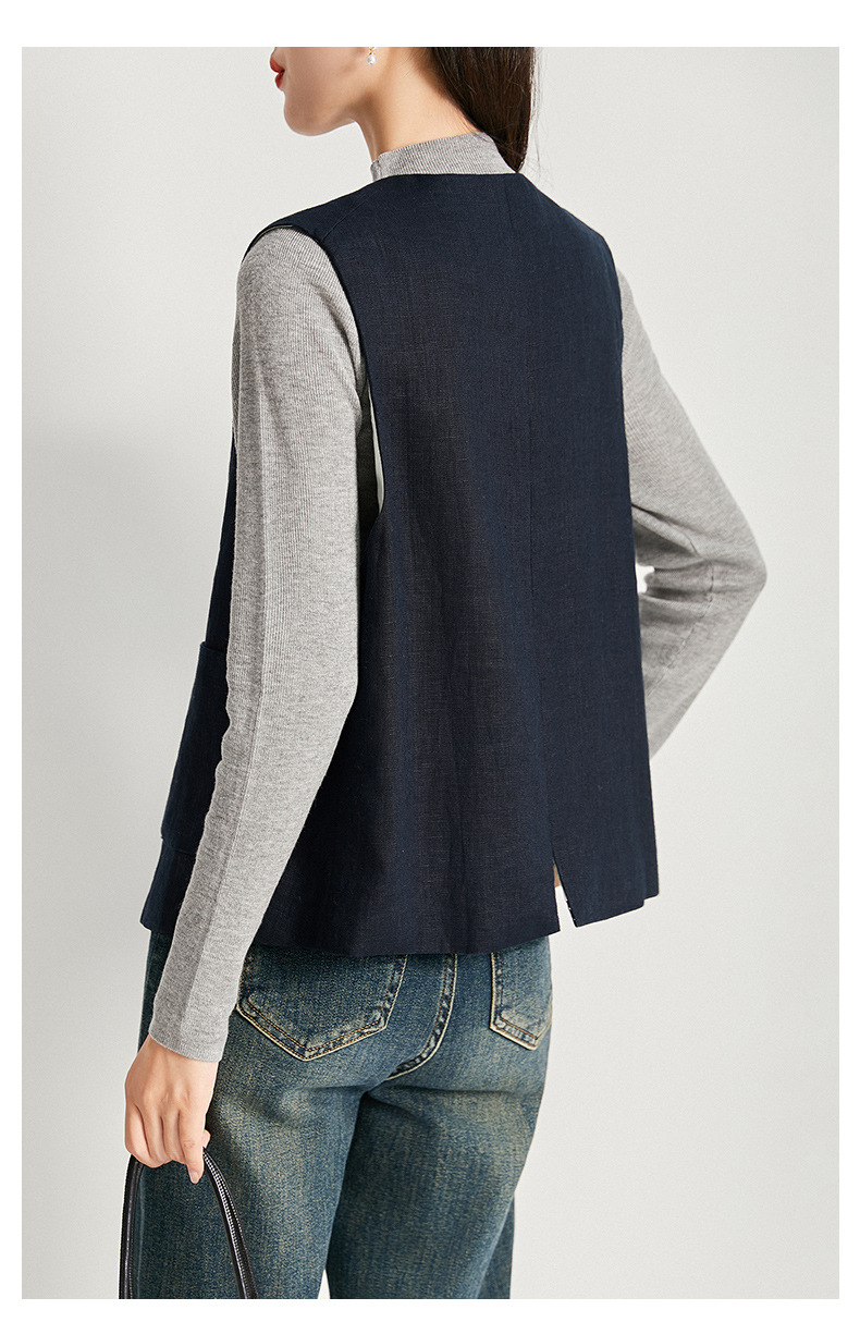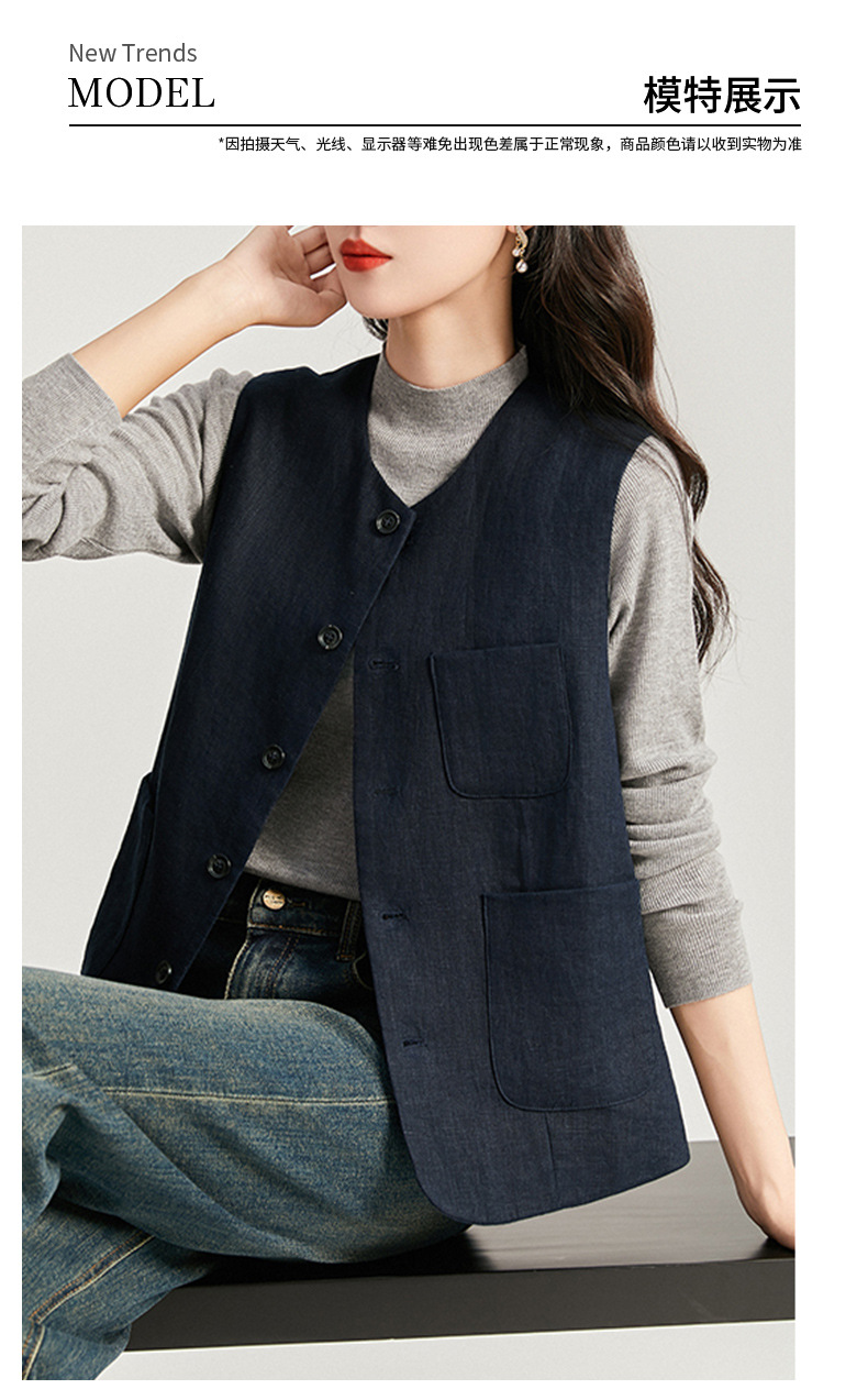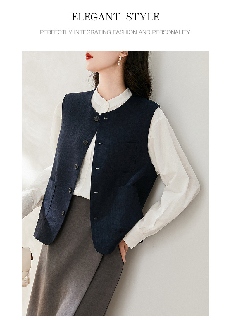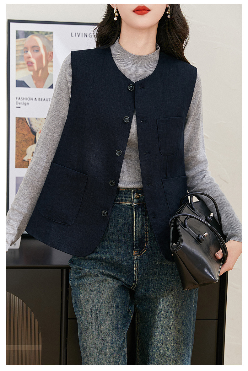 여성을위한 레트로 하이 엔드 모시 라운드 넥 민소매 조끼 재킷 가을 2025 새로운 기질 연령 감소 다목적 조끼