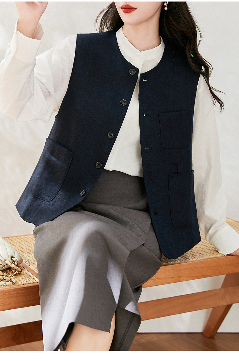 여성을위한 레트로 하이 엔드 모시 라운드 넥 민소매 조끼 재킷 가을 2025 새로운 기질 연령 감소 다목적 조끼스토어 가기