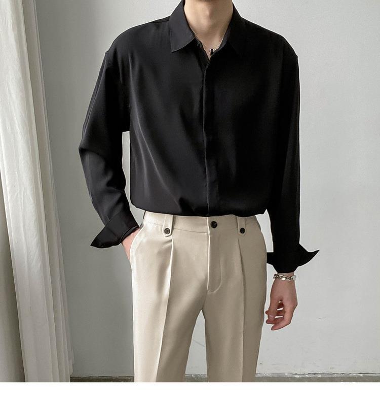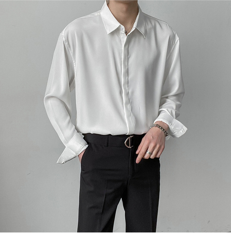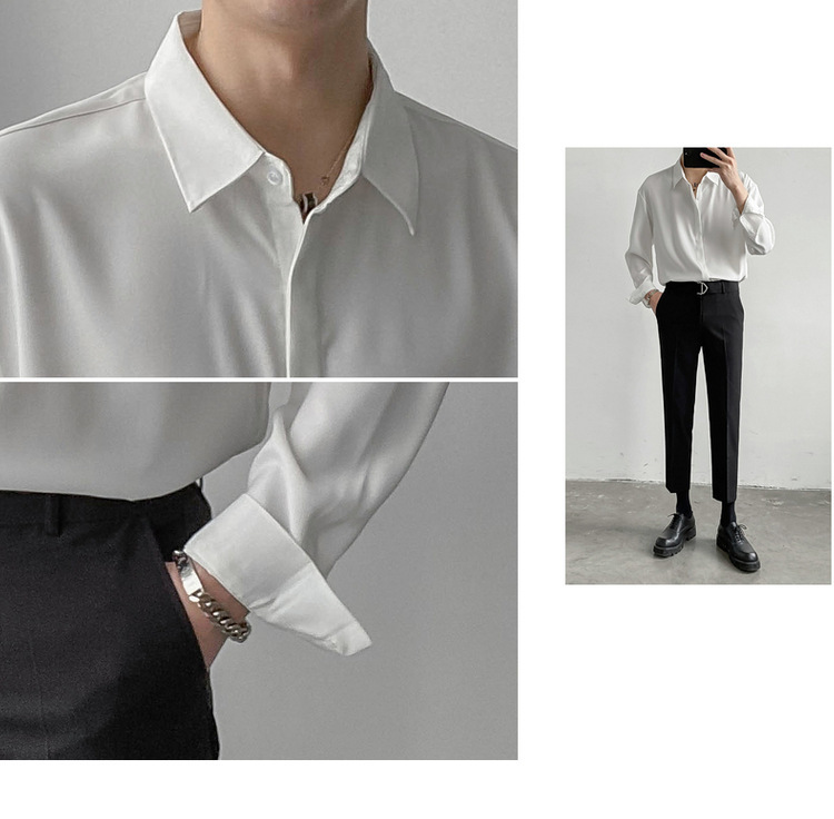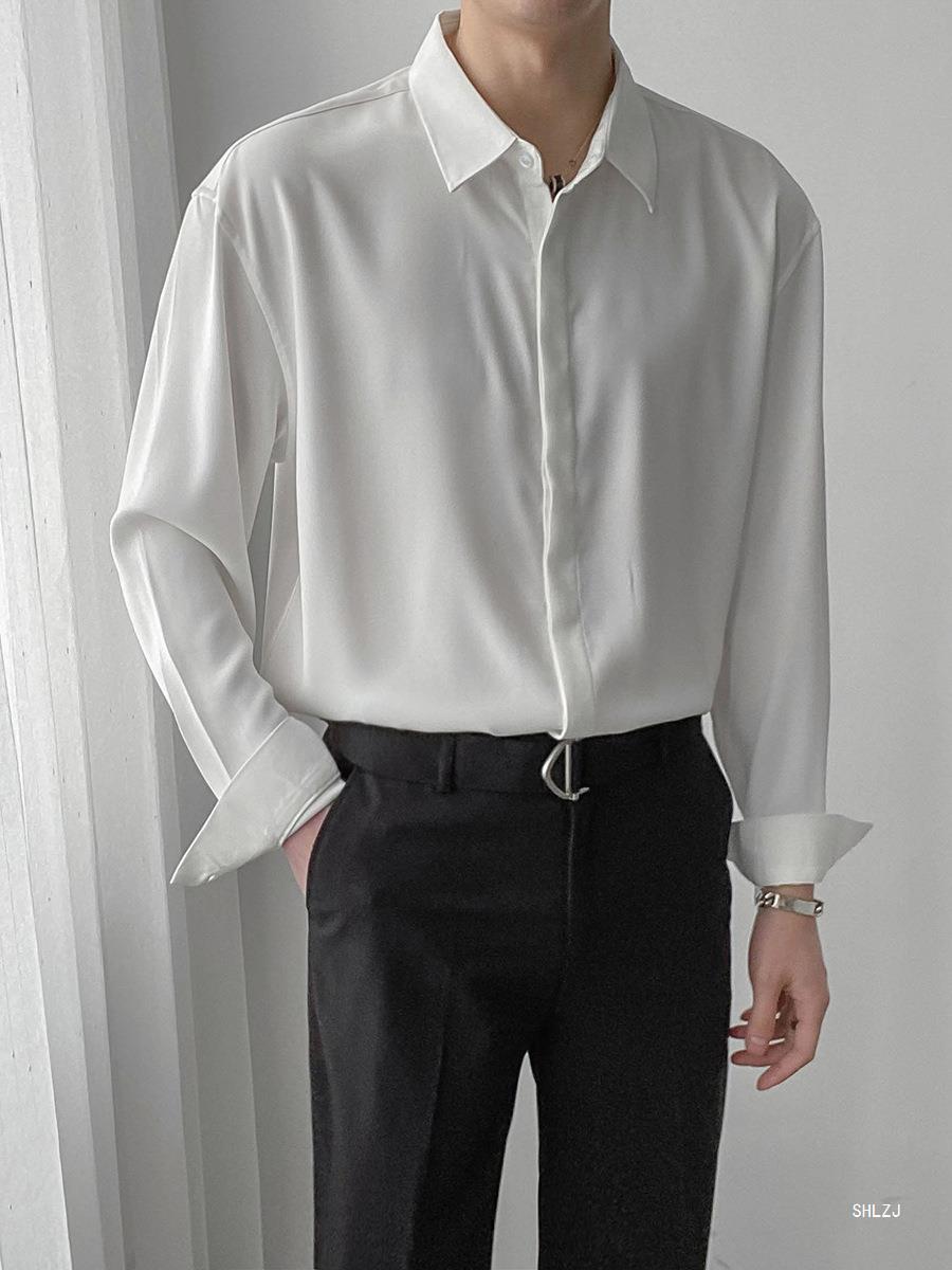 봄, 가을 남성용 가볍고 성숙한 한국식 루즈한 긴팔 셔츠, 새로운 상의, 트렌디하고 패셔너블한 드레이프 솔리드 컬러 노아이론 셔츠스토어 가기