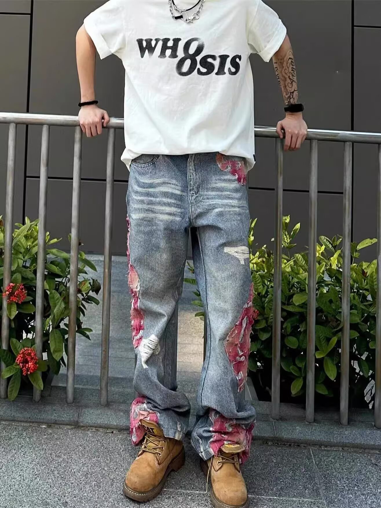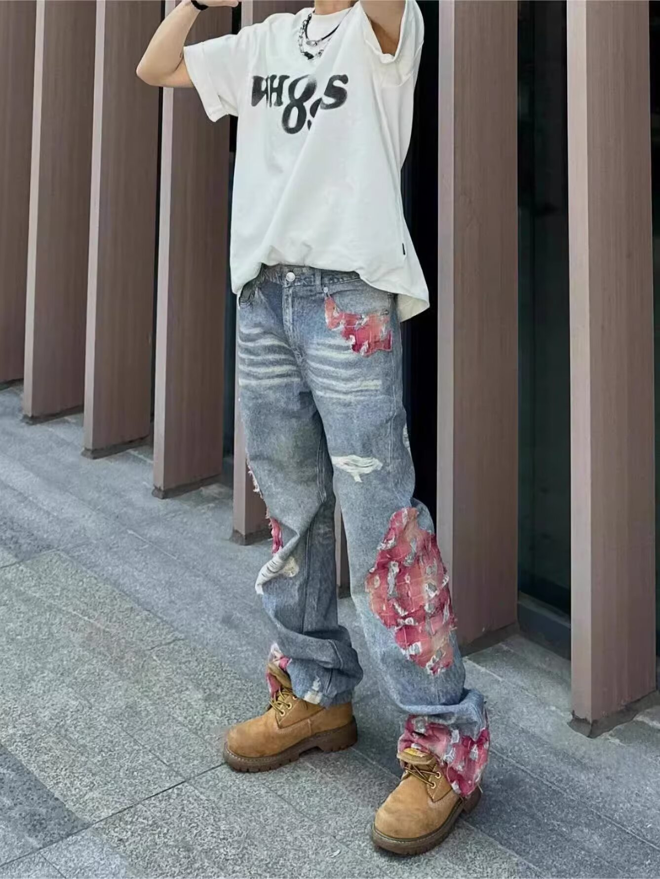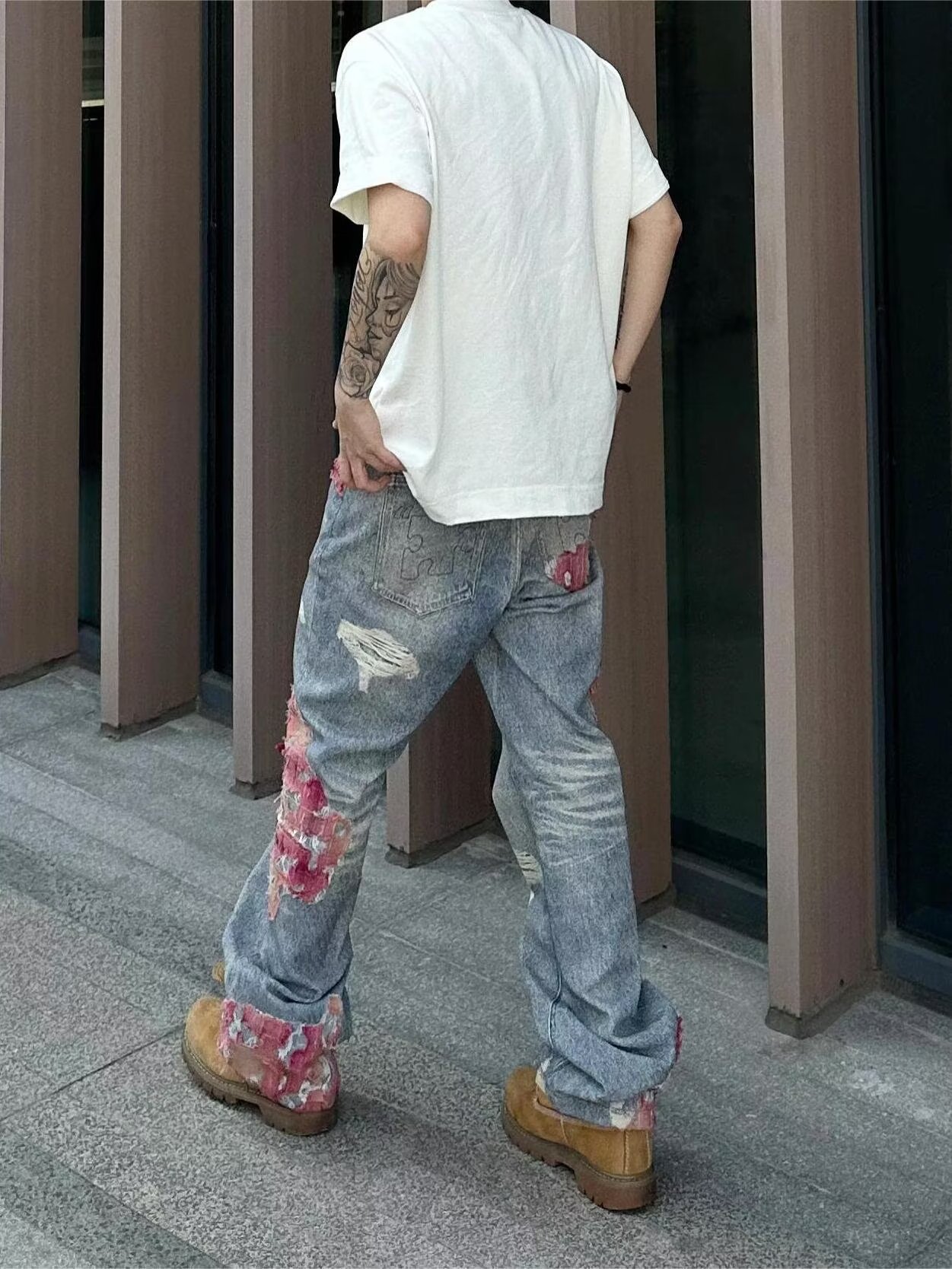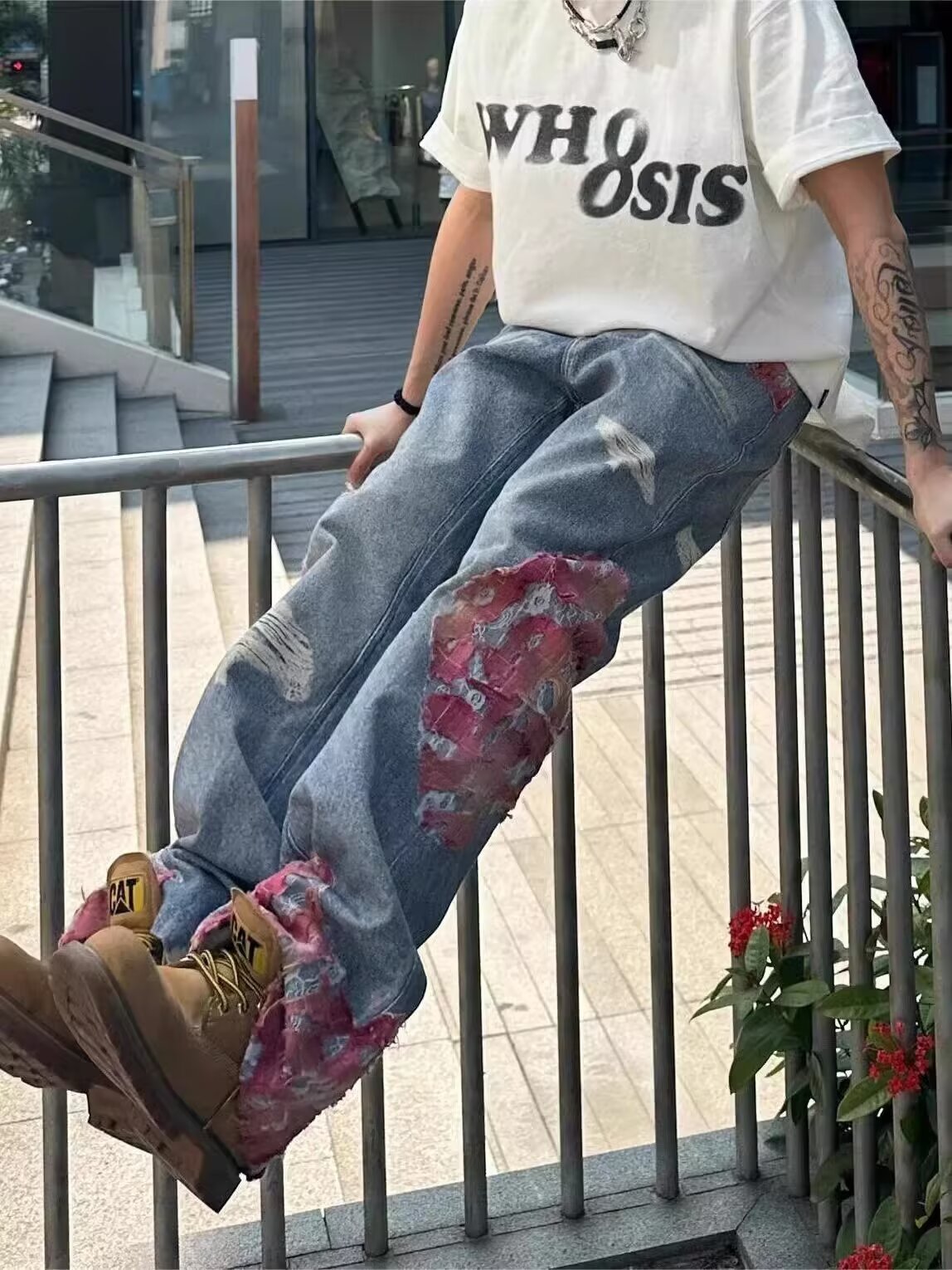 미국 스타일 하이 스트리트 스티칭 디자인 센스 청바지 트렌디 브랜드 인쇄 마이크로 플레어 느슨한 와이드 레그 캐주얼 바지스토어 가기
