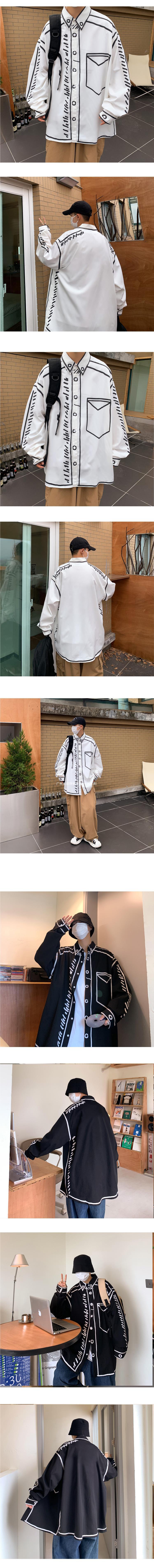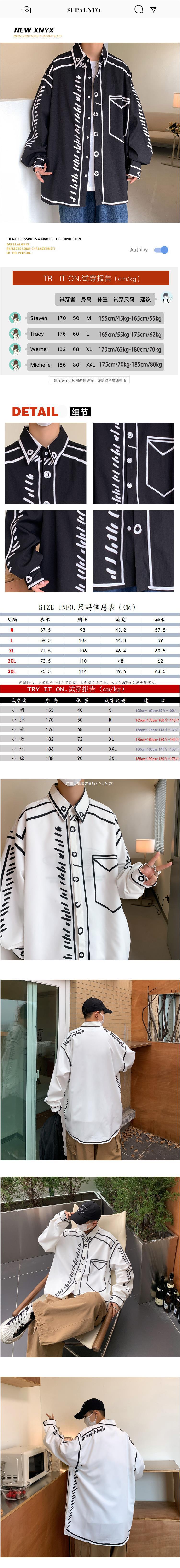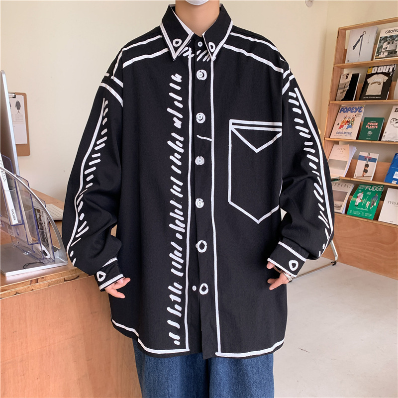 春季新款港风ins设计涂鸦线条长袖衬衫男士宽松衬衣运动上衣外套스토어 가기