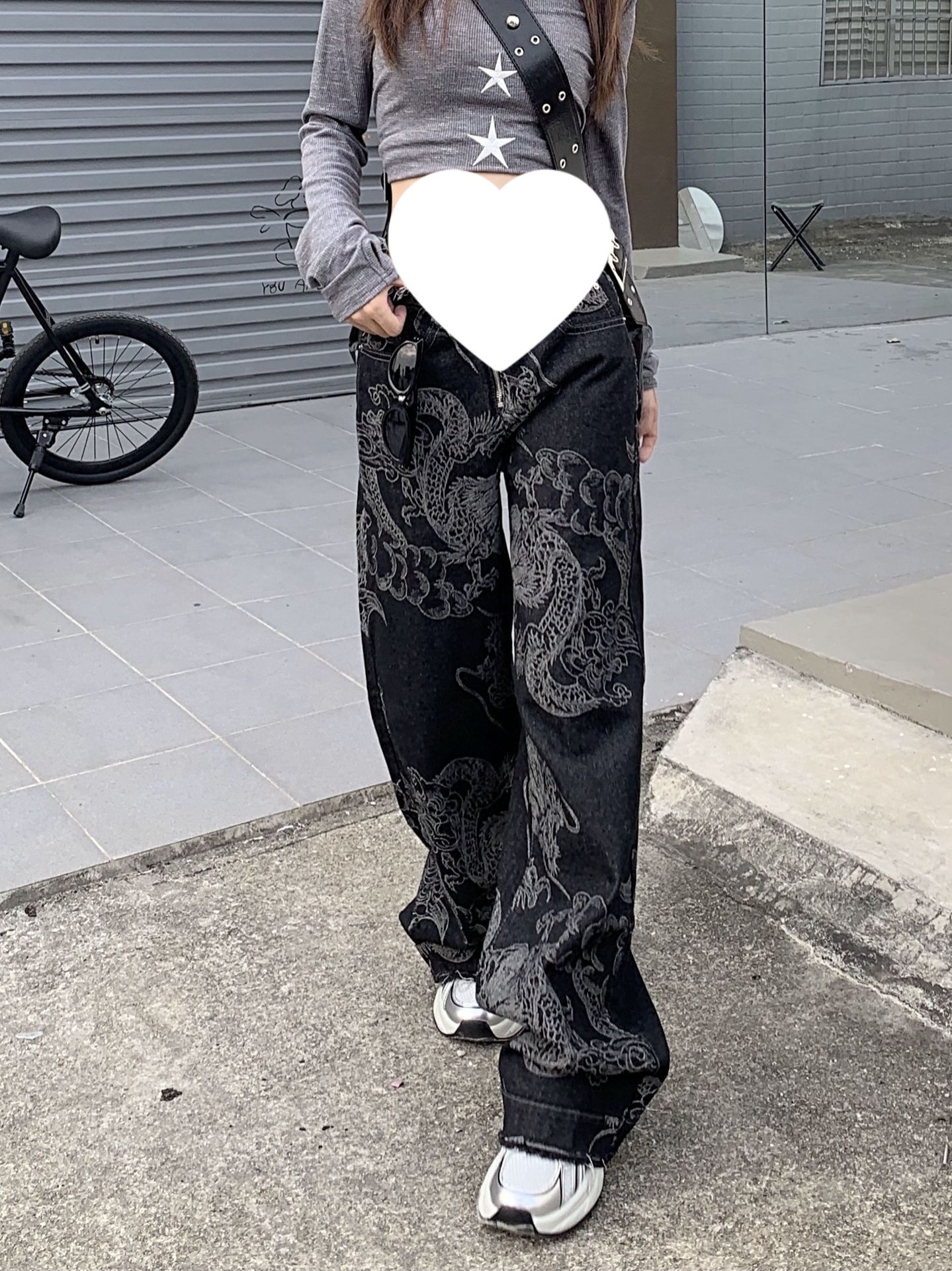 미국 스타일 유행 드래곤 패턴 인쇄 패션 디자인 센스 원시 가장자리 넓은 다리 청바지 여성의 높은 허리 느슨한 슬림 찾고 바지스토어 가기