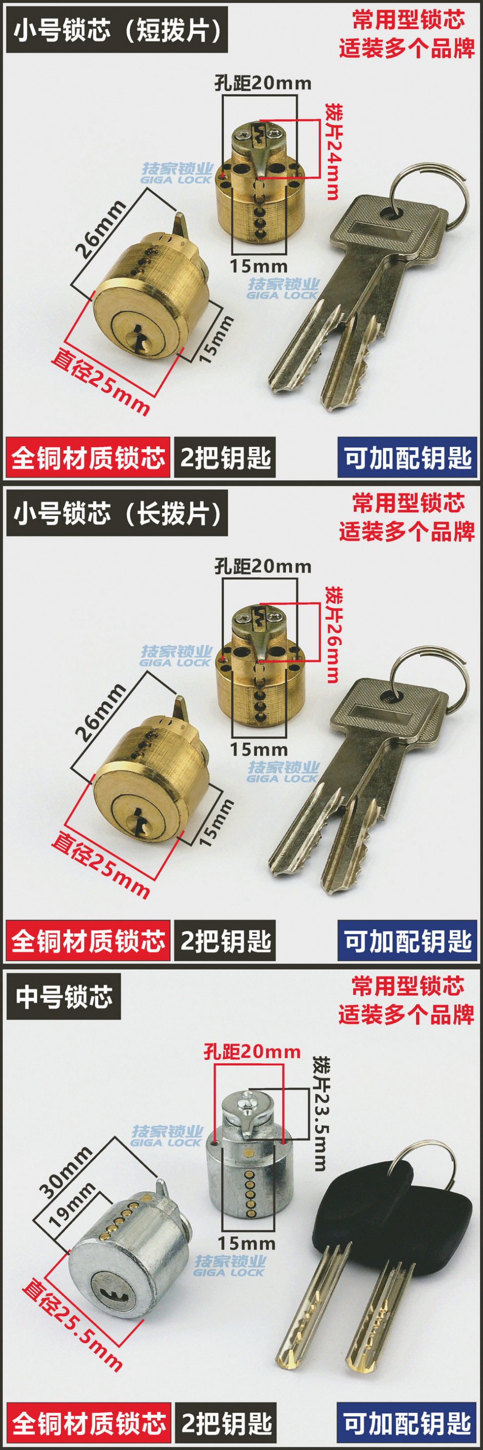 • 소형 호텔 잠금 실린더(26mm 픽)-35-50mm-범용 유형-키 포함