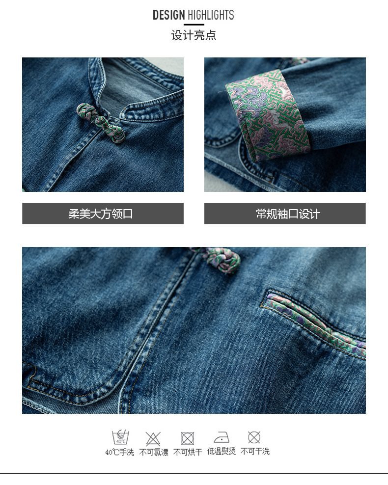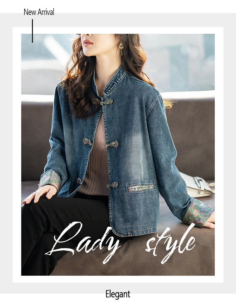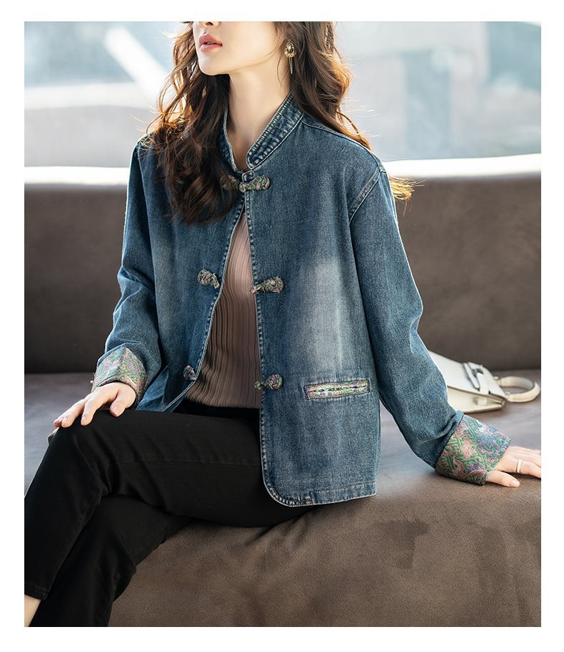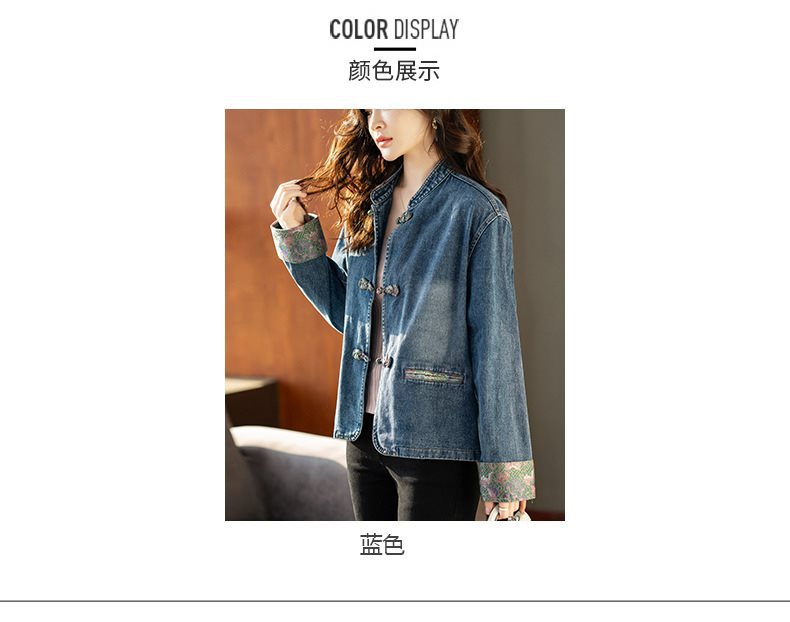 Guofeng 수직 칼라 버클 데님 코트 여성의 짧은 가을 2024 새로운 느슨한 외부 봄 및 가을 재킷 카디건스토어 가기
