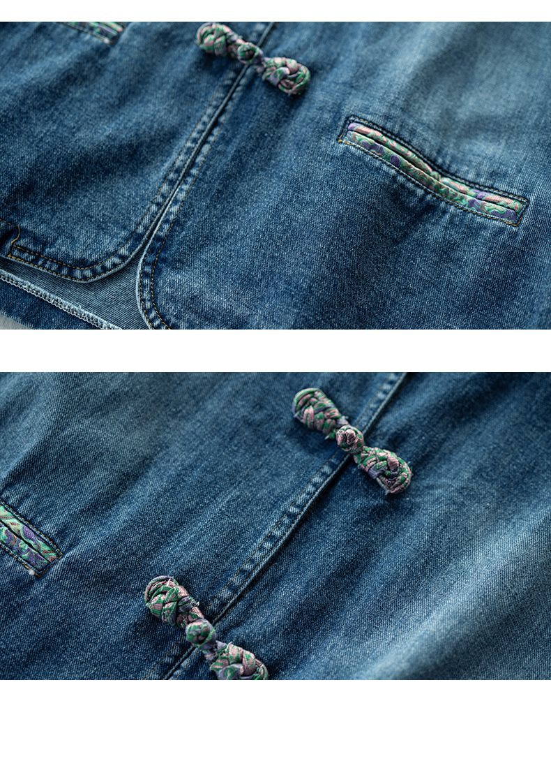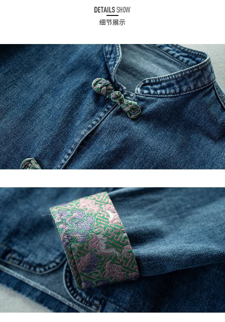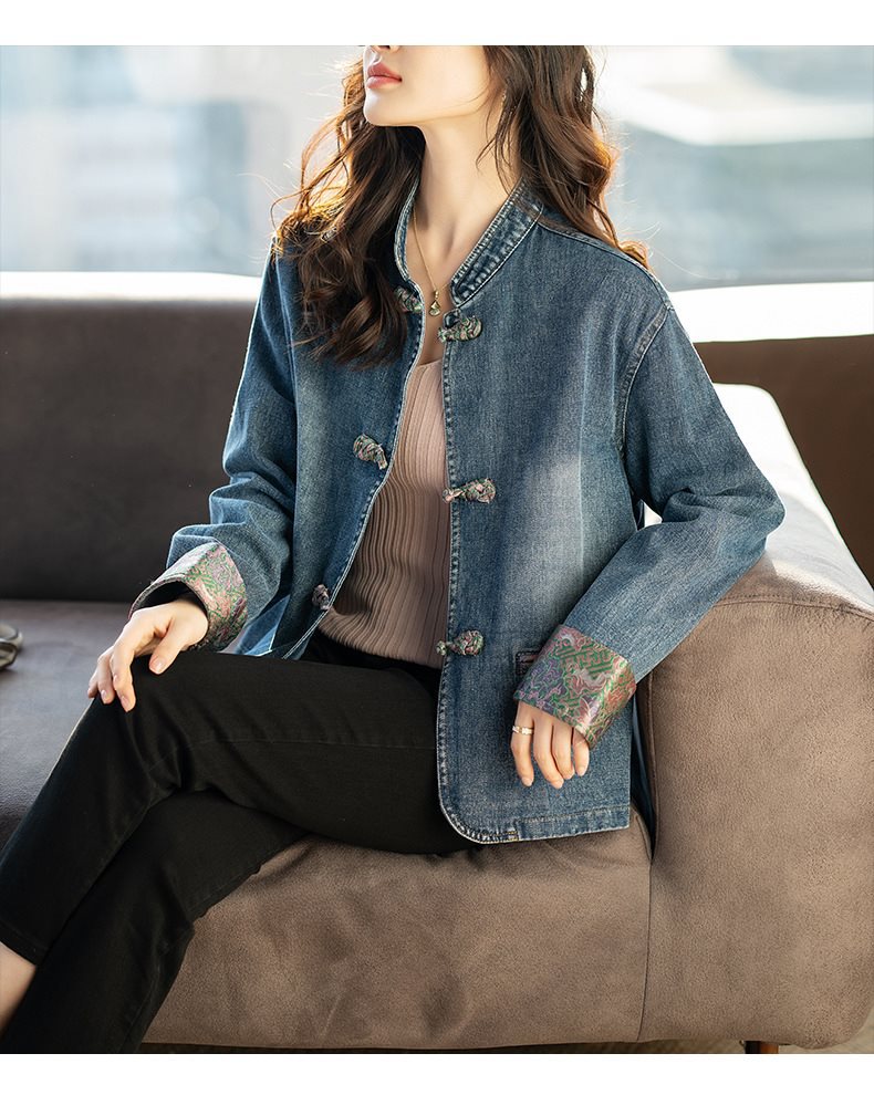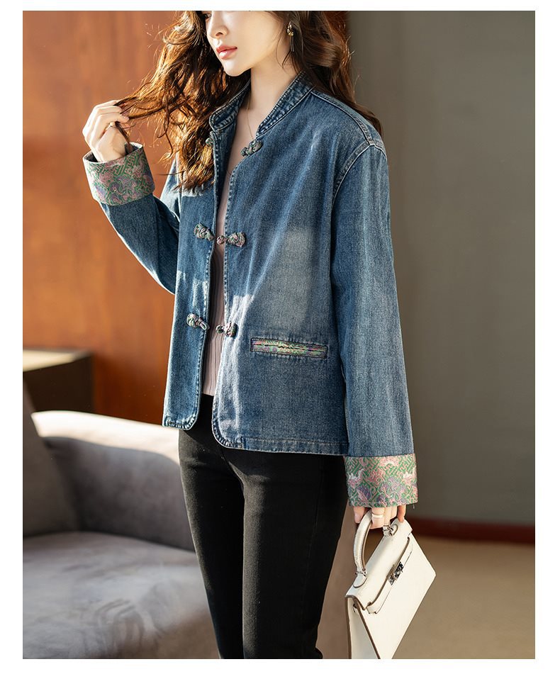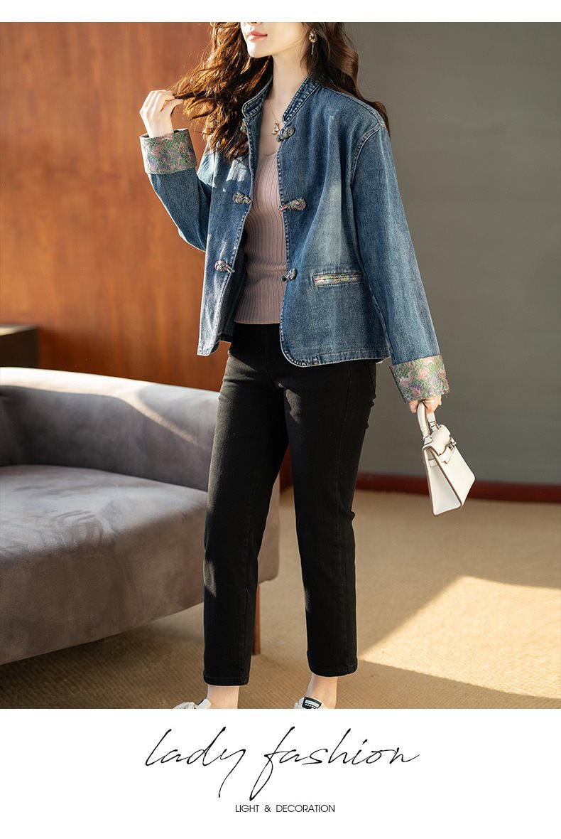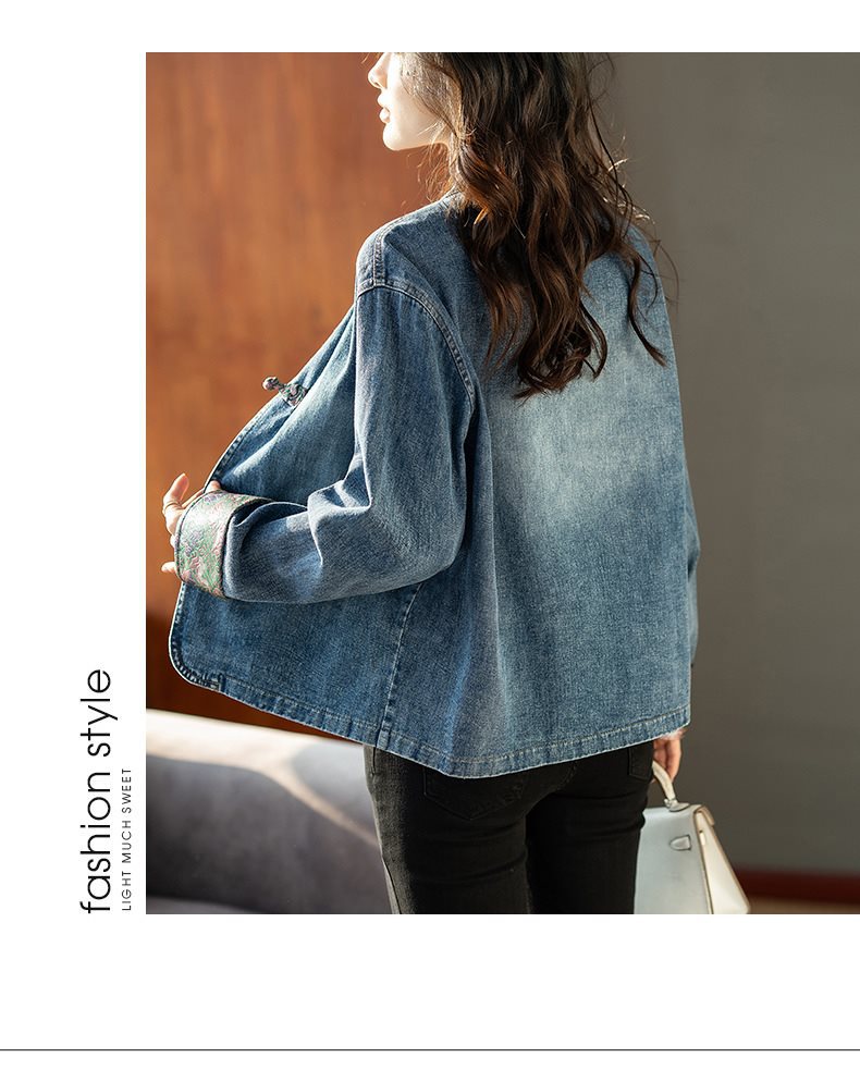 Guofeng 수직 칼라 버클 데님 코트 여성의 짧은 가을 2024 새로운 느슨한 외부 봄 및 가을 재킷 카디건