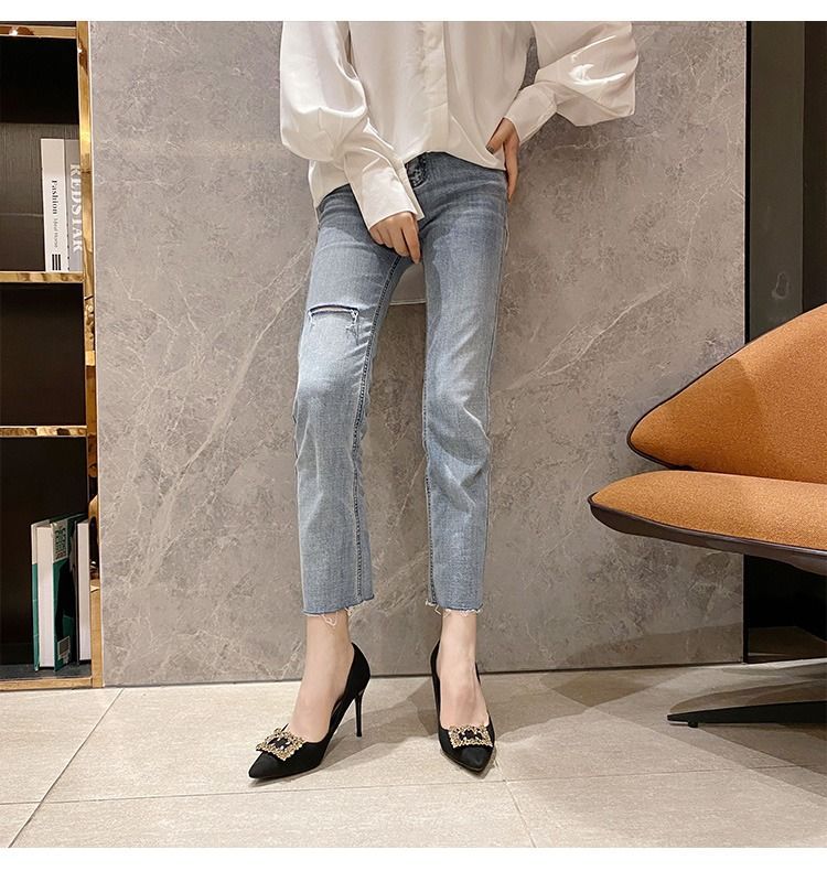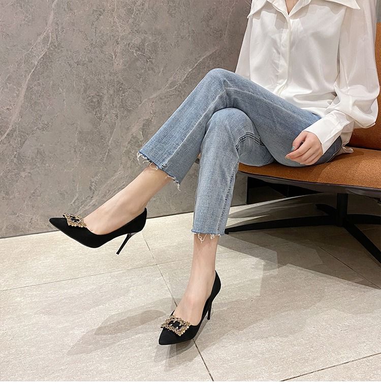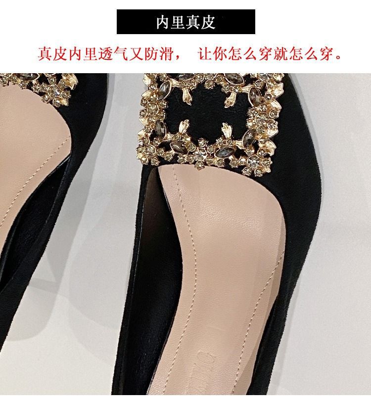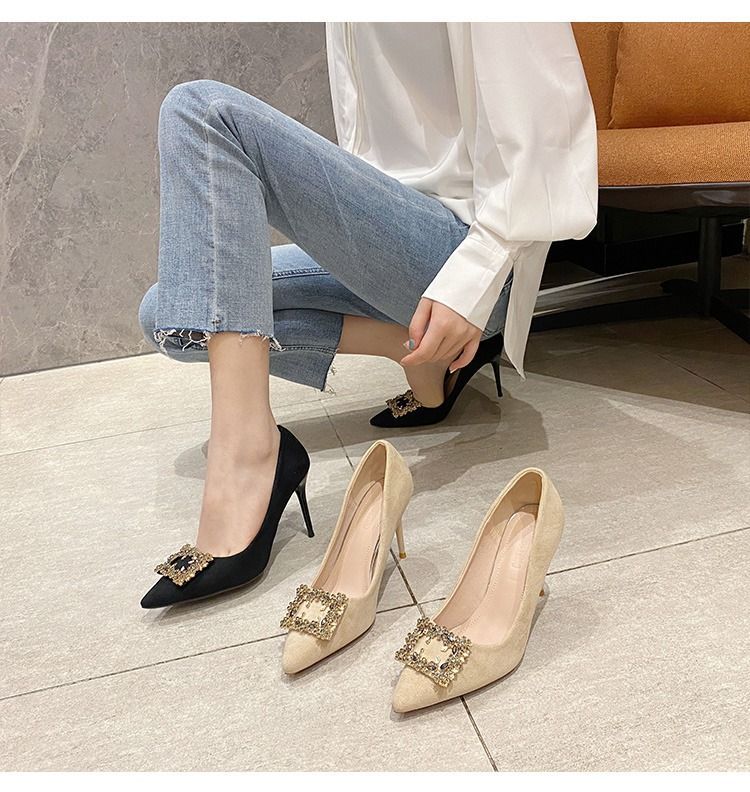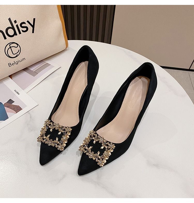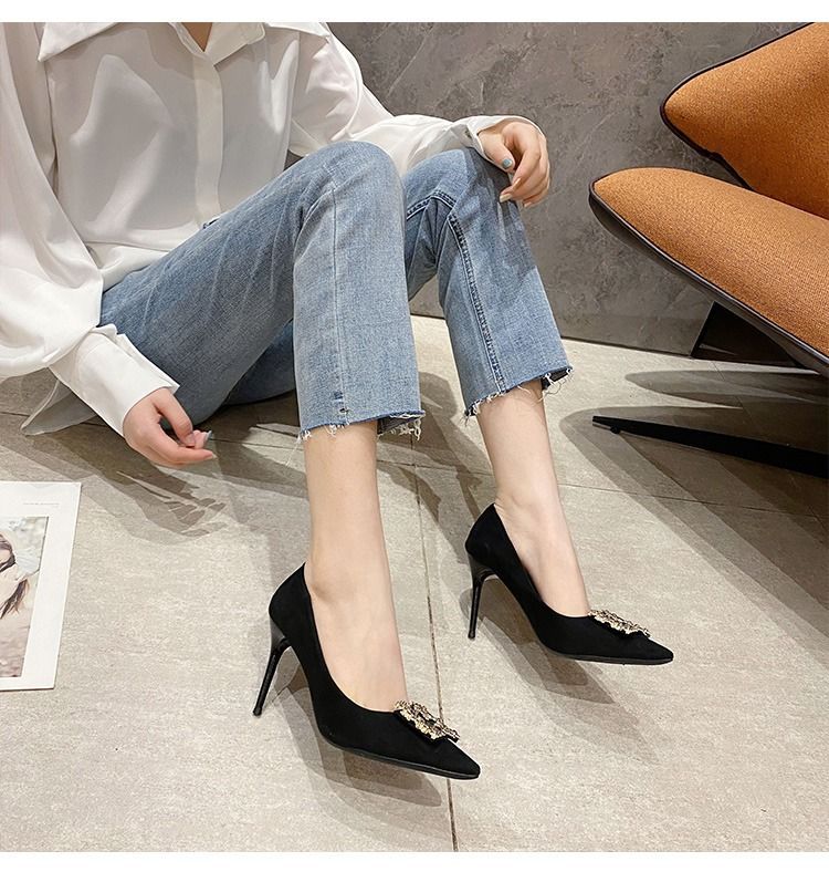 하이힐 스웨이드 뾰족한 발가락 슬립 온 로우 탑 슈즈 싱글 레이어 슈즈 얇은 굽 여성용 워크 슈즈 포시즌 여성 슈즈 샤넬 스타일스토어 가기