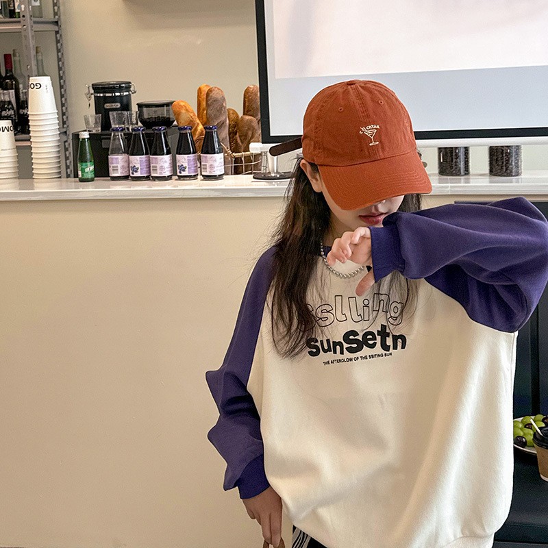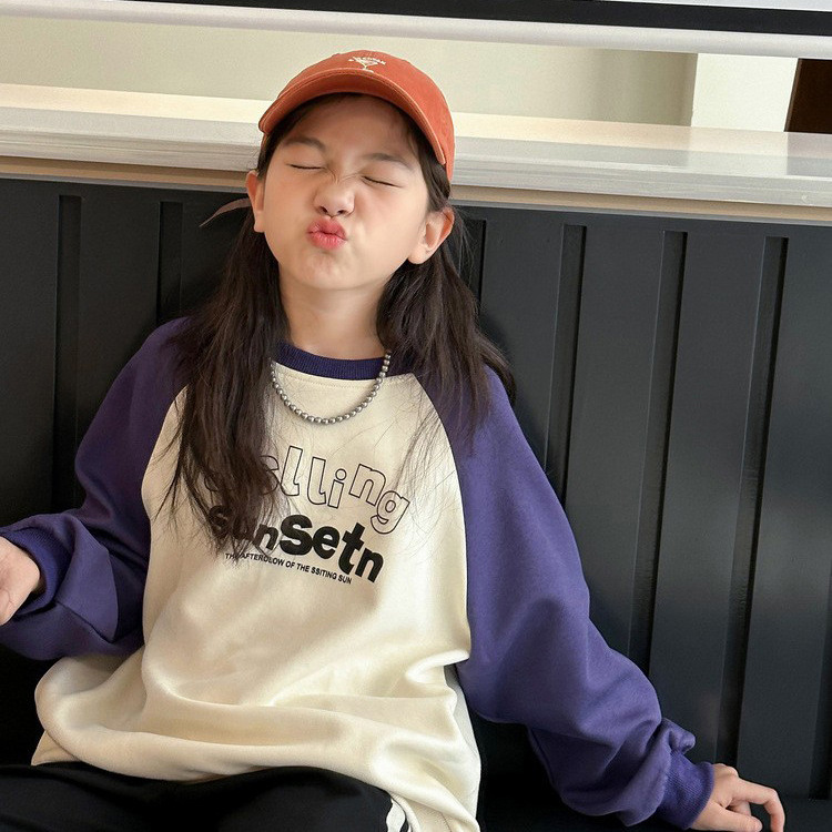 봄과 가을 소녀 유행 편지 인쇄 컬러 블록 느슨한 캐주얼 스웨터 대형 어린이 라글란 소매 긴 소매 탑 티셔츠스토어 가기