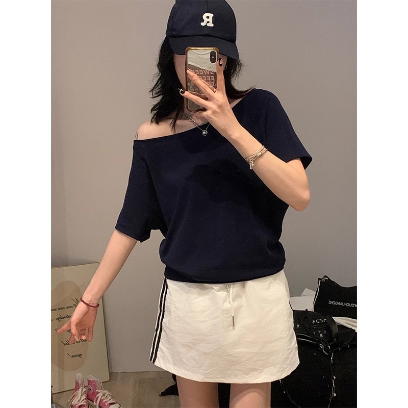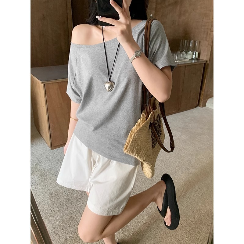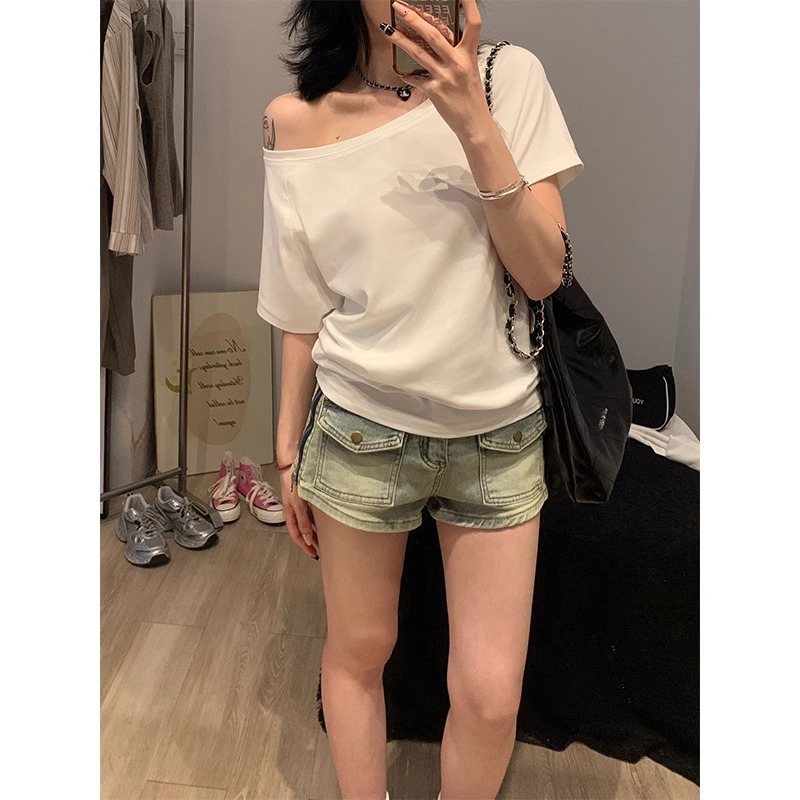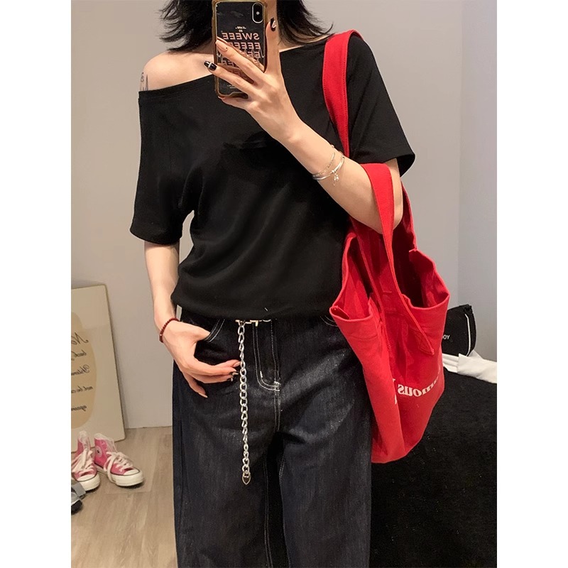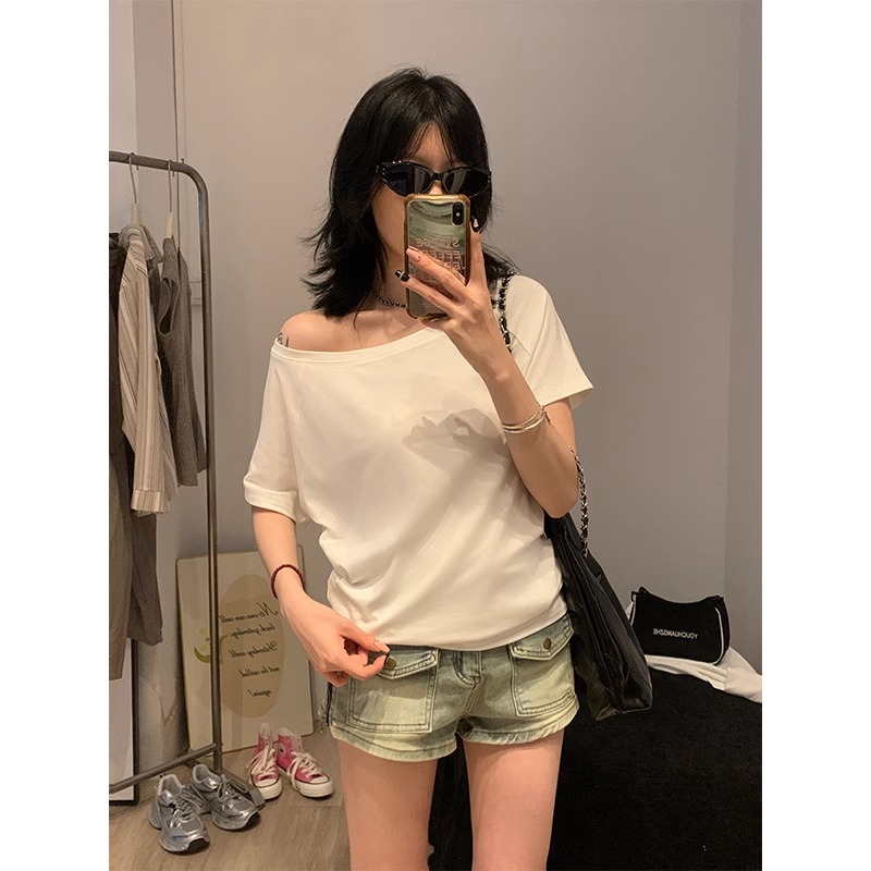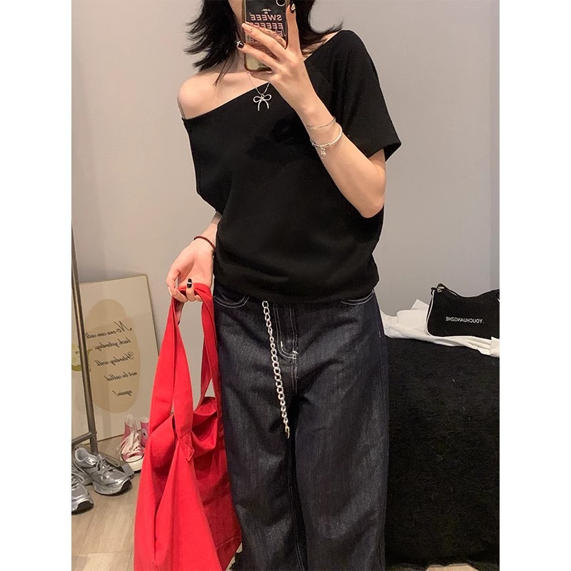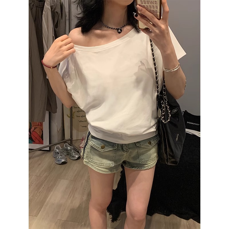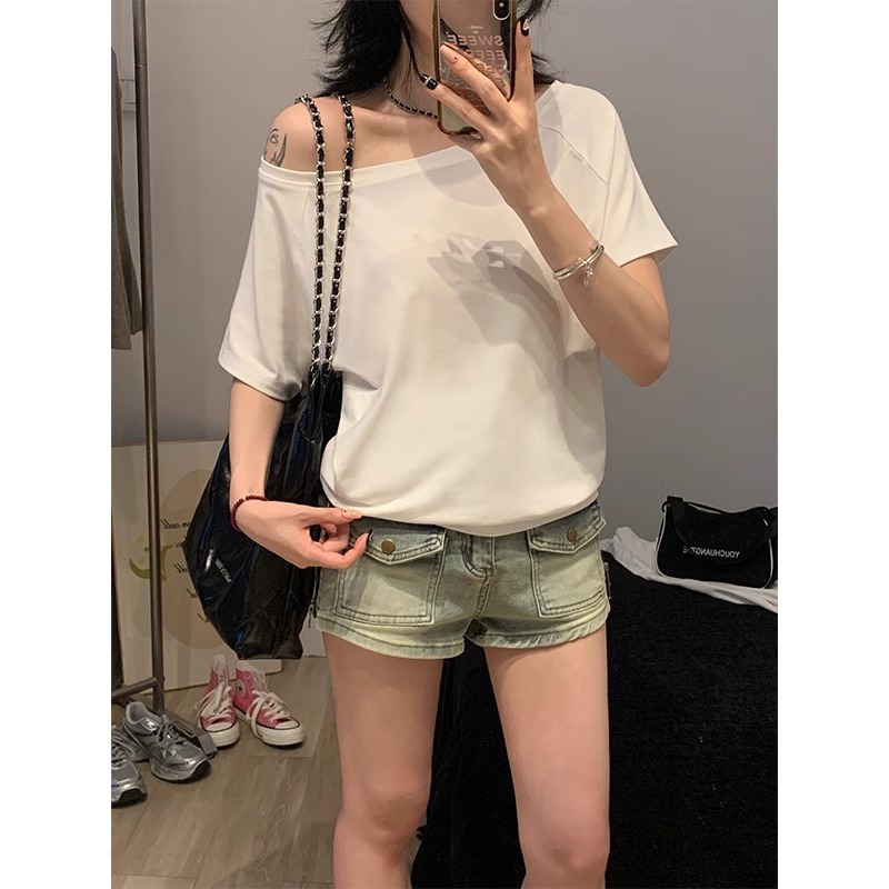 한국 스타일 스파이스 걸스 순수한 욕망 반팔 티셔츠 여성 여름 디자인 센스 틈새 느슨한 게으른 섹시한 어깨 탑