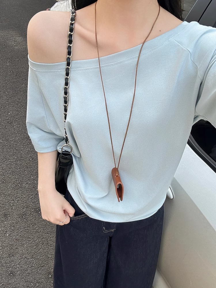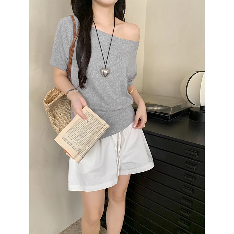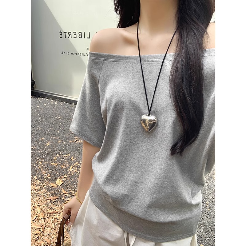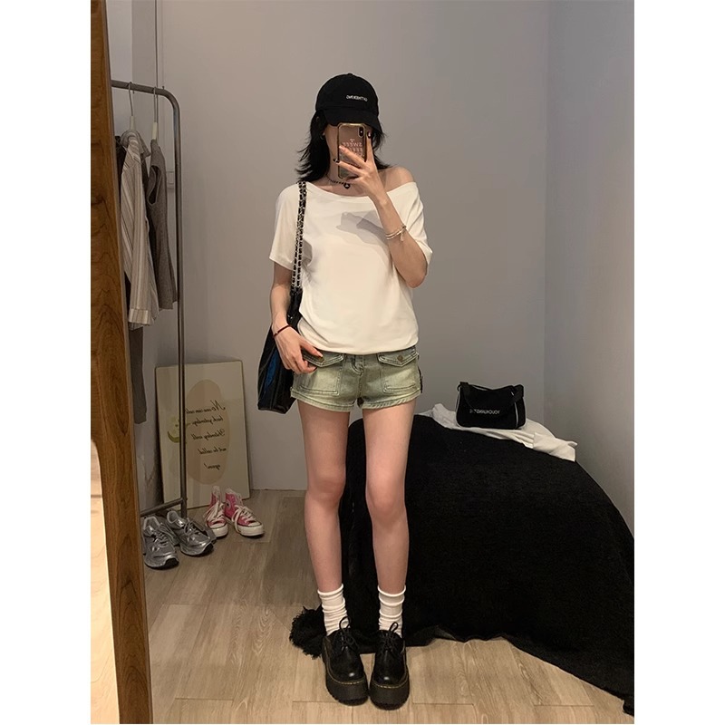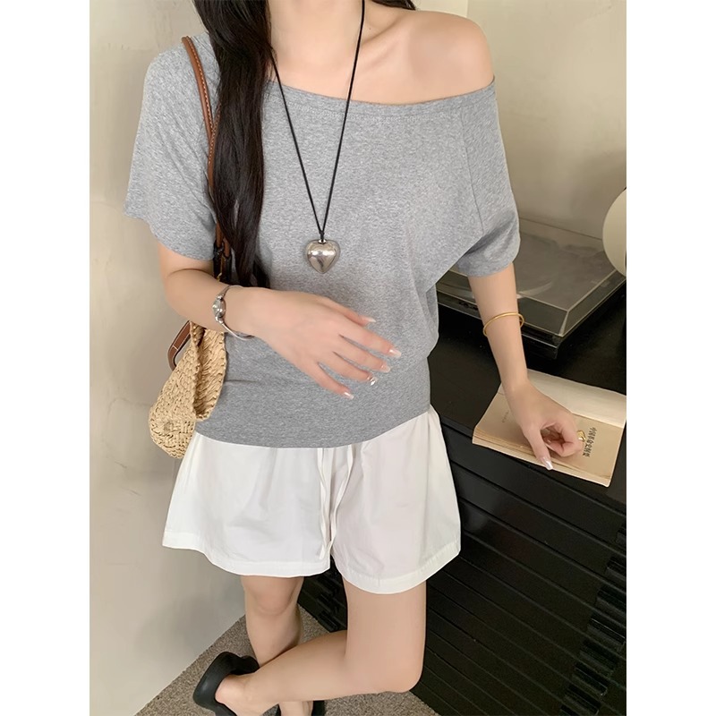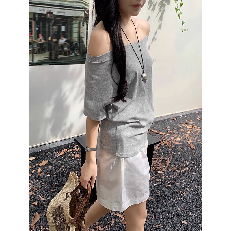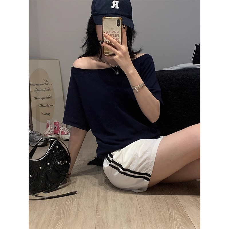 한국 스타일 스파이스 걸스 순수한 욕망 반팔 티셔츠 여성 여름 디자인 센스 틈새 느슨한 게으른 섹시한 어깨 탑