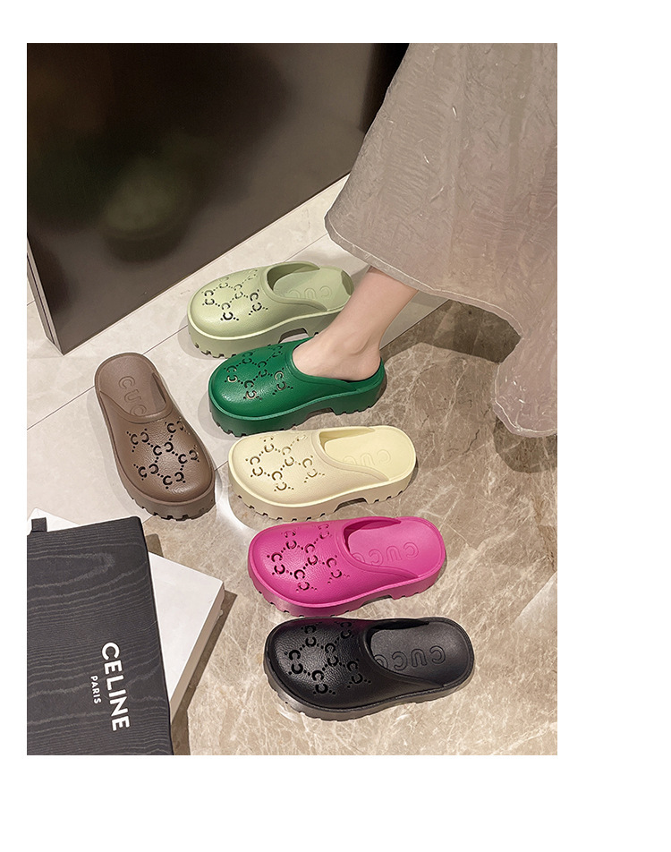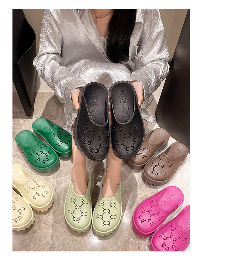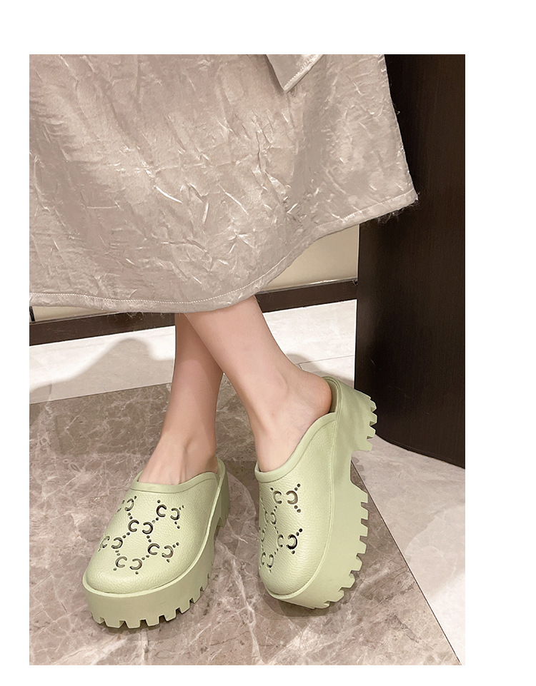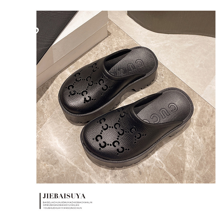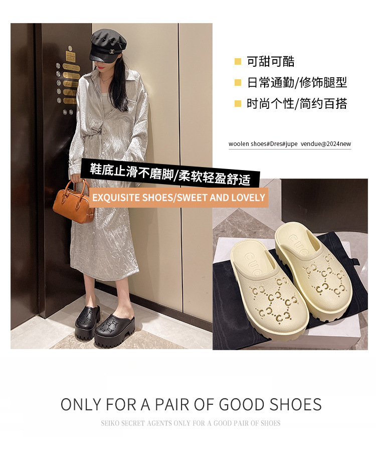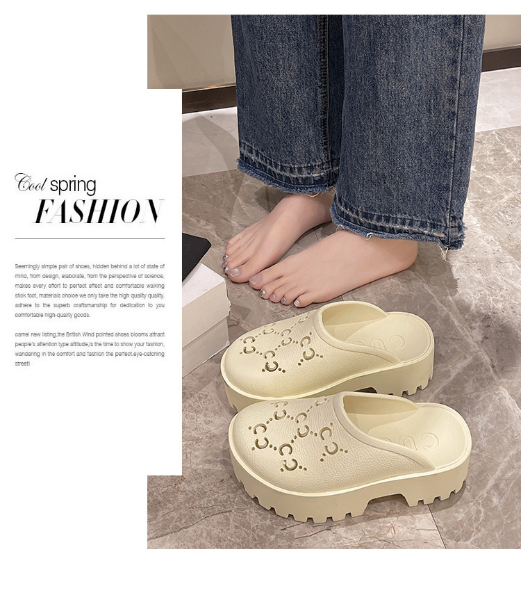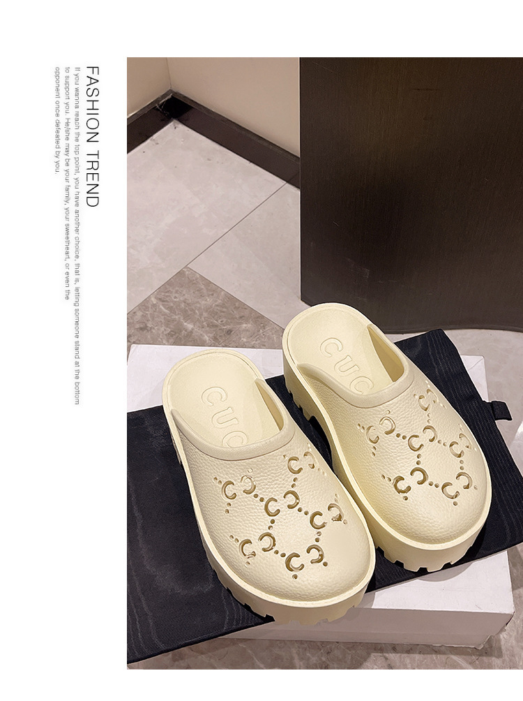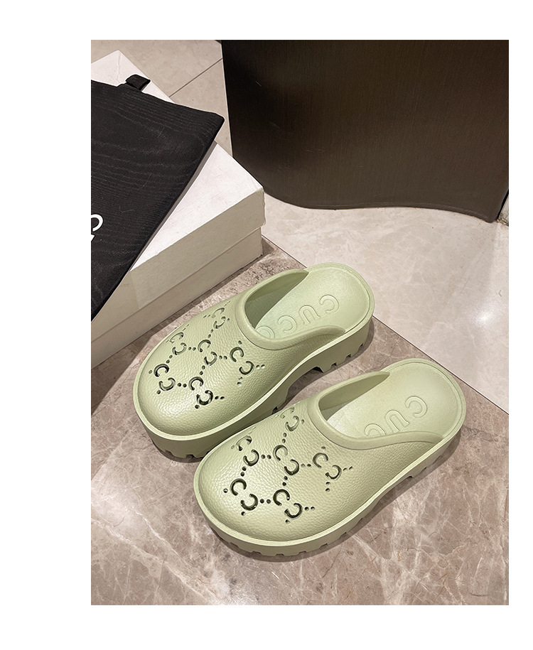 G 브랜드 2024 봄/여름 레터링 컷아웃 무광 조각 장식 앞코가 둥근 두꺼운 밑창 슬리퍼 여성용 낮은 굽스토어 가기