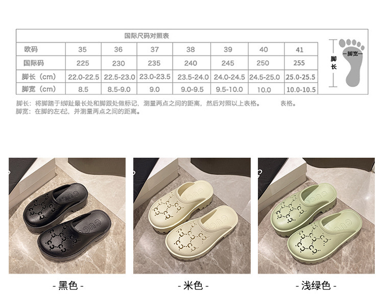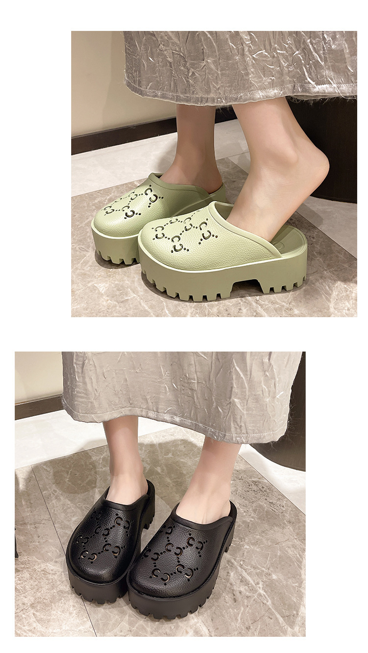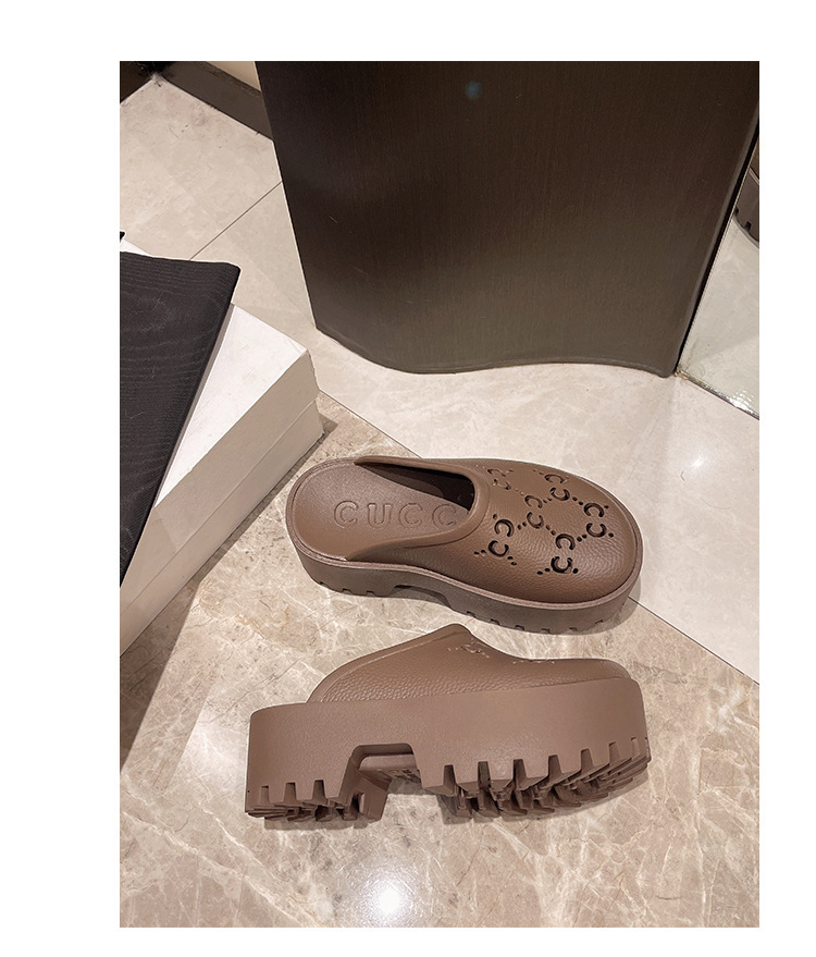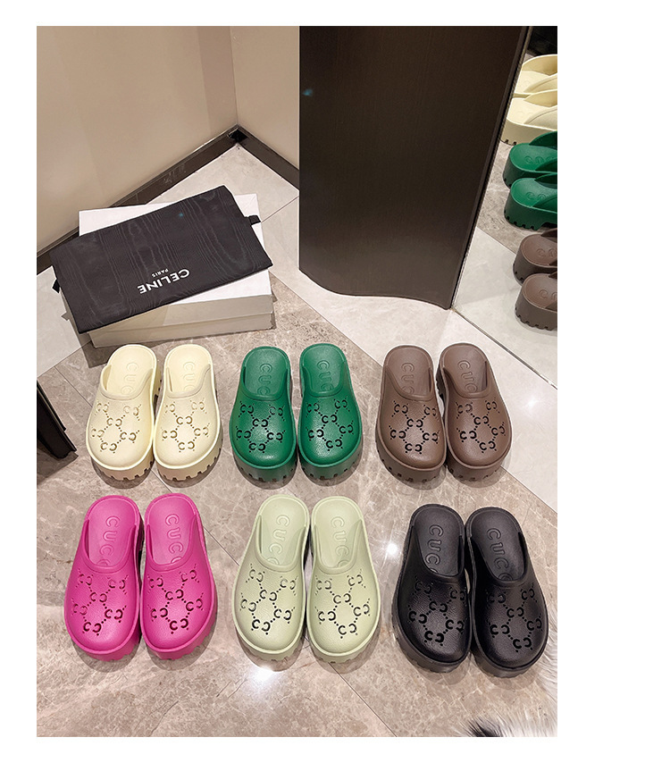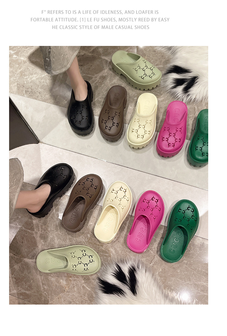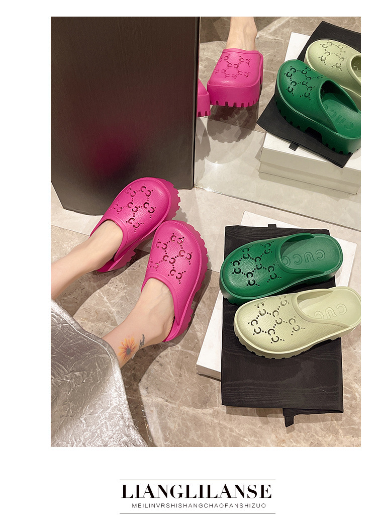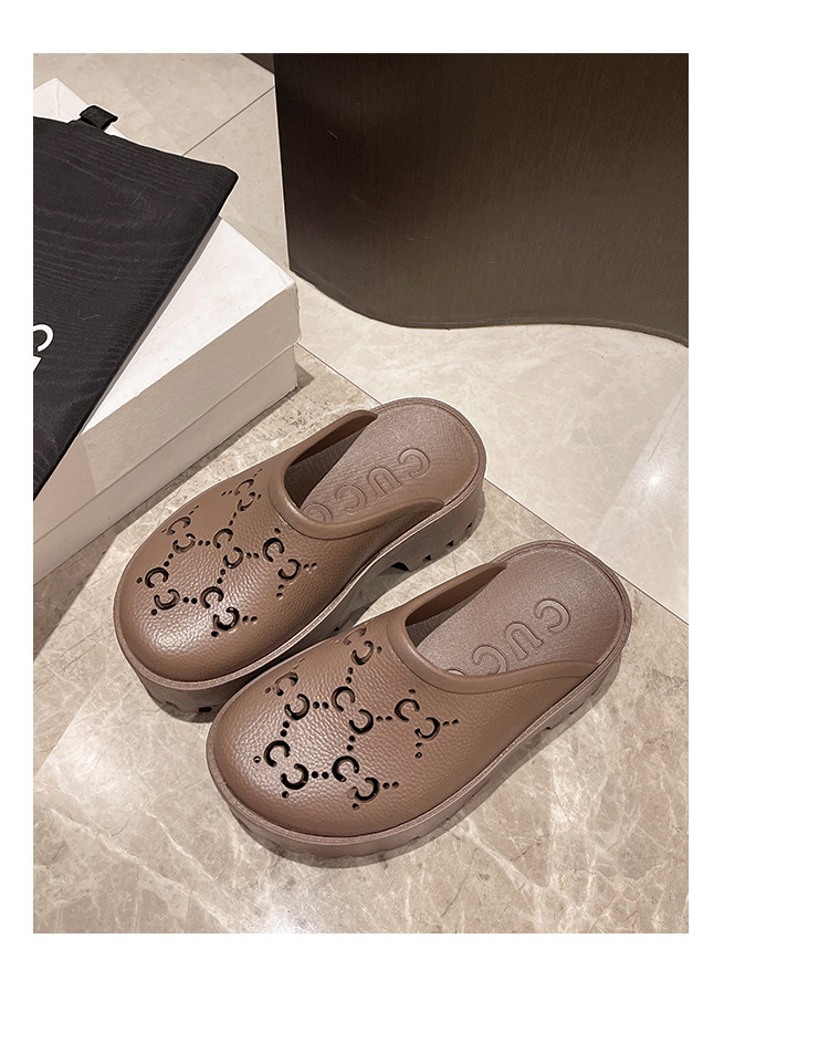 G 브랜드 2024 봄/여름 레터링 컷아웃 무광 조각 장식 앞코가 둥근 두꺼운 밑창 슬리퍼 여성용 낮은 굽스토어 가기