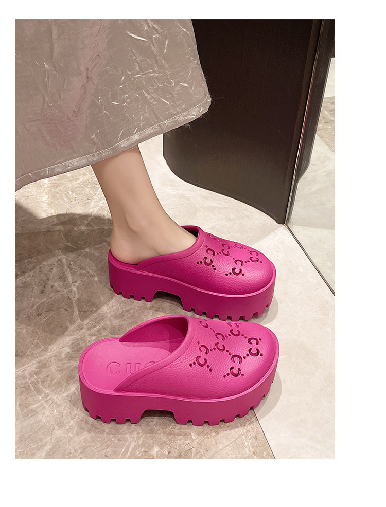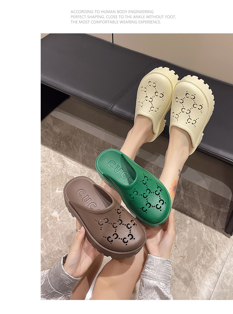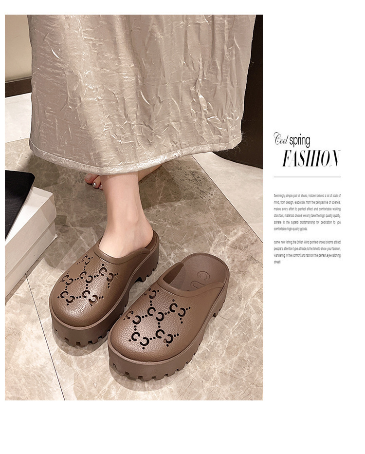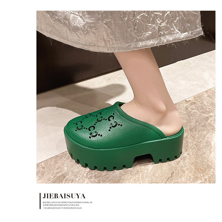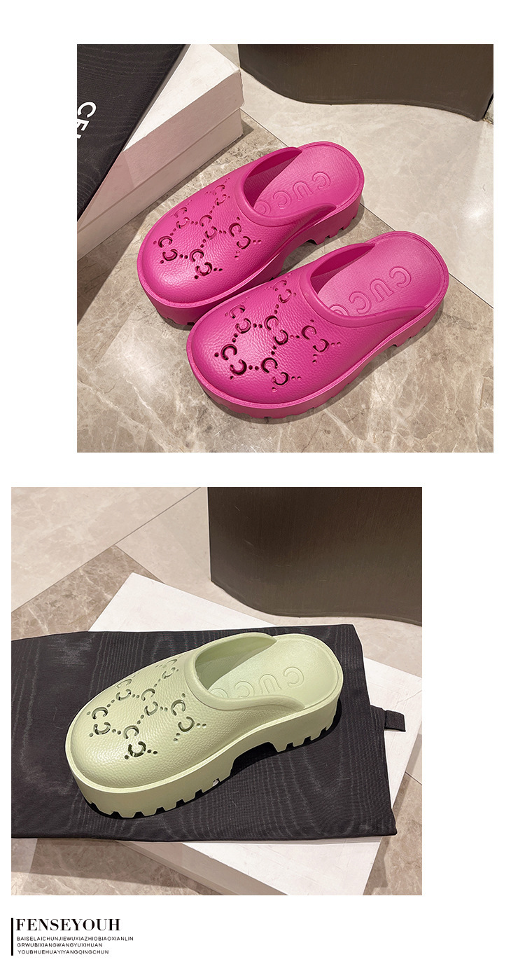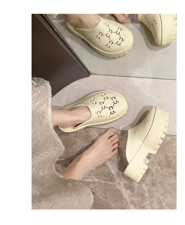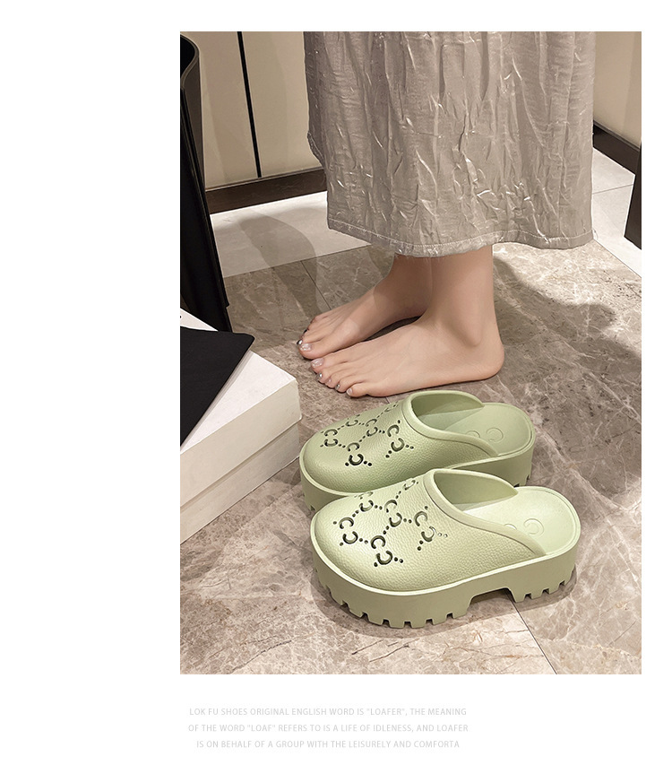 G 브랜드 2024 봄/여름 레터링 컷아웃 무광 조각 장식 앞코가 둥근 두꺼운 밑창 슬리퍼 여성용 낮은 굽스토어 가기