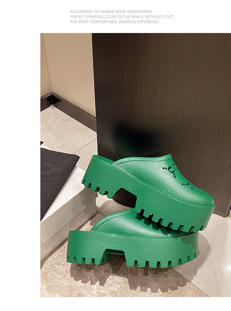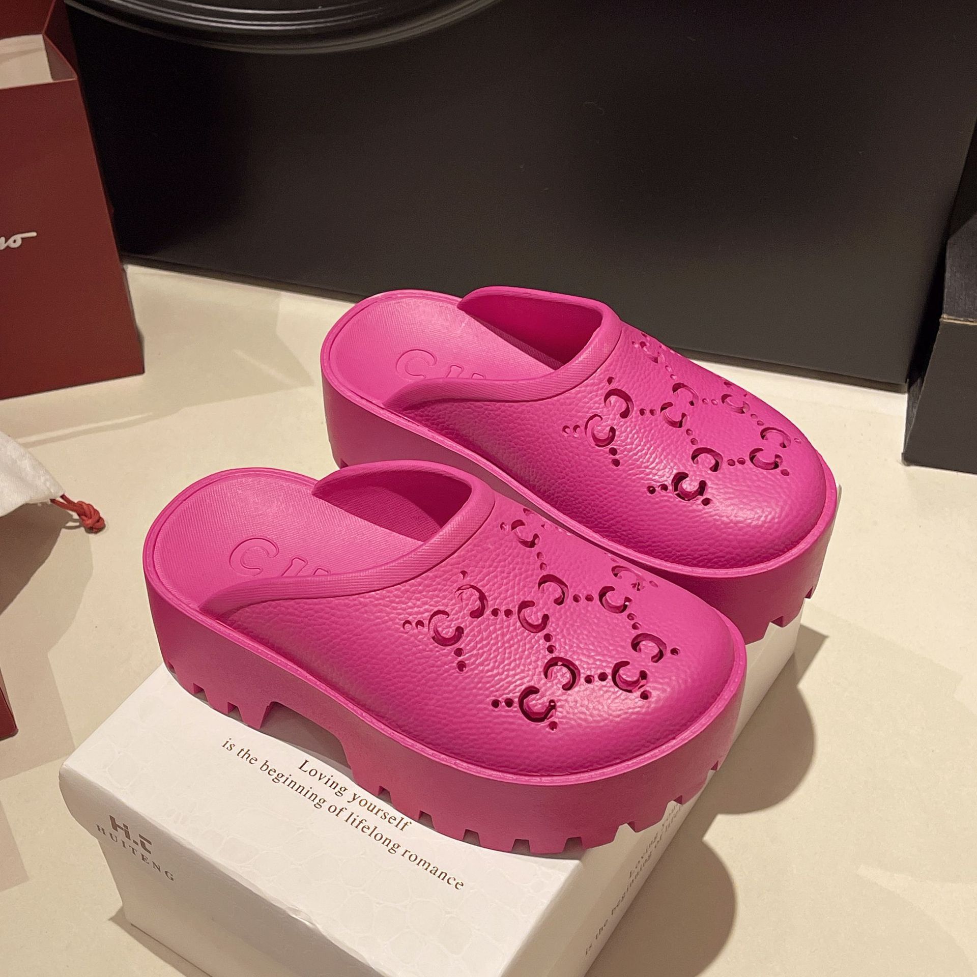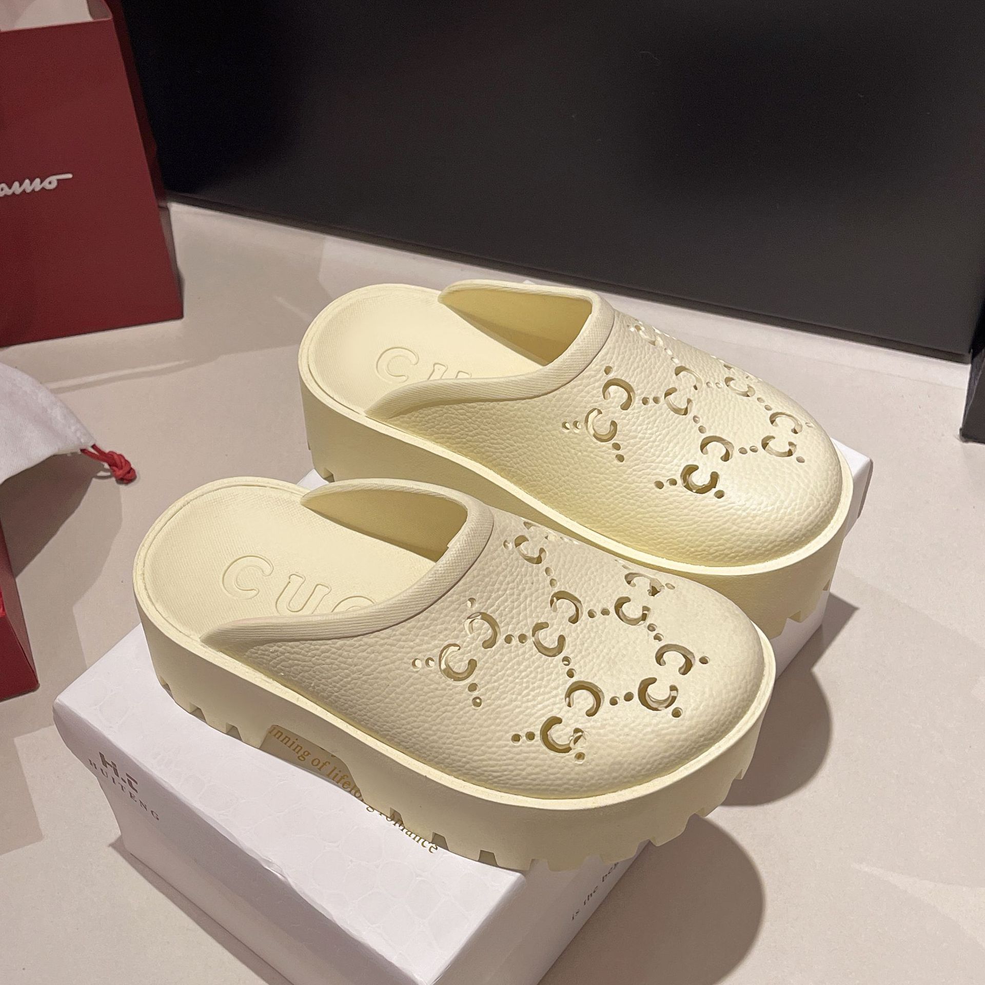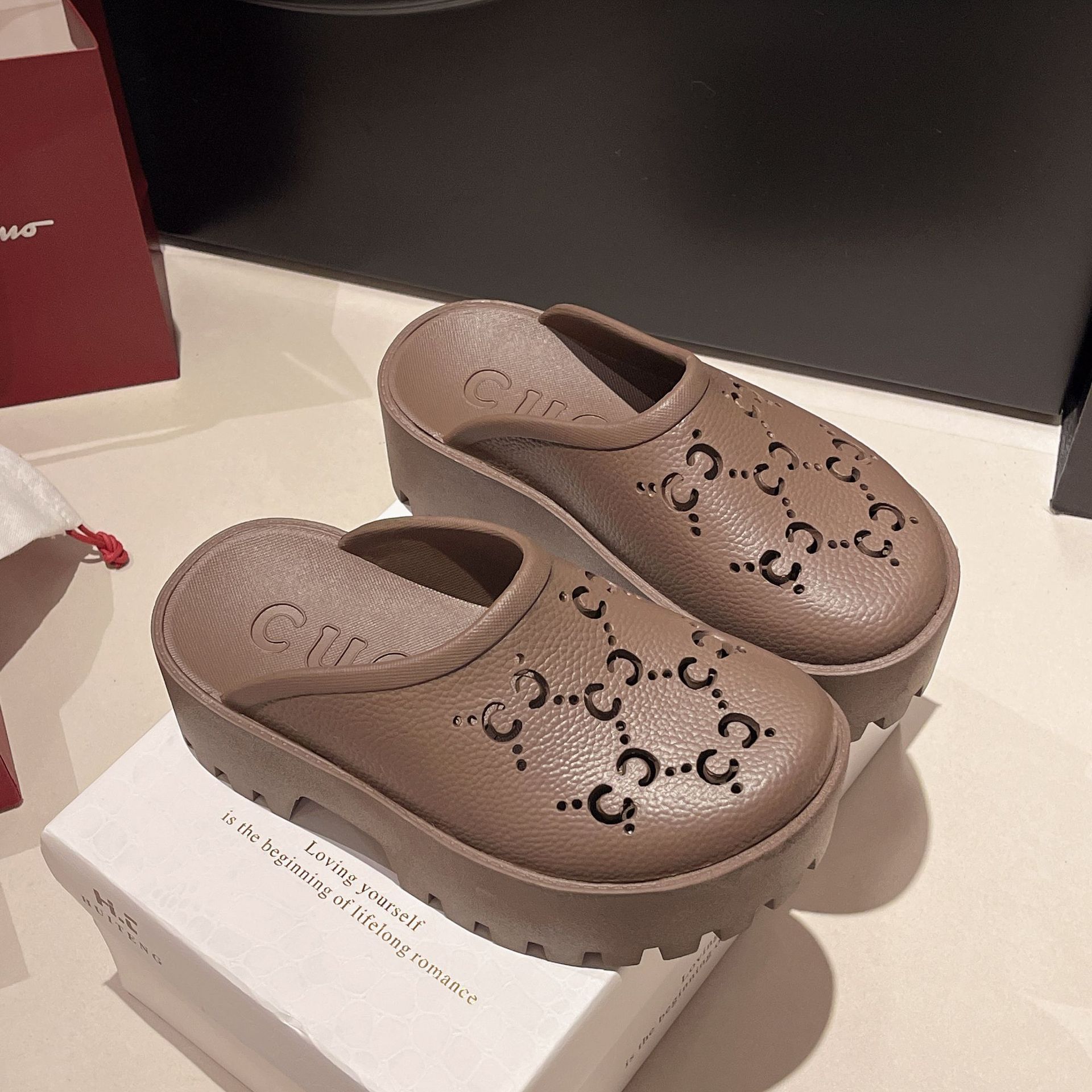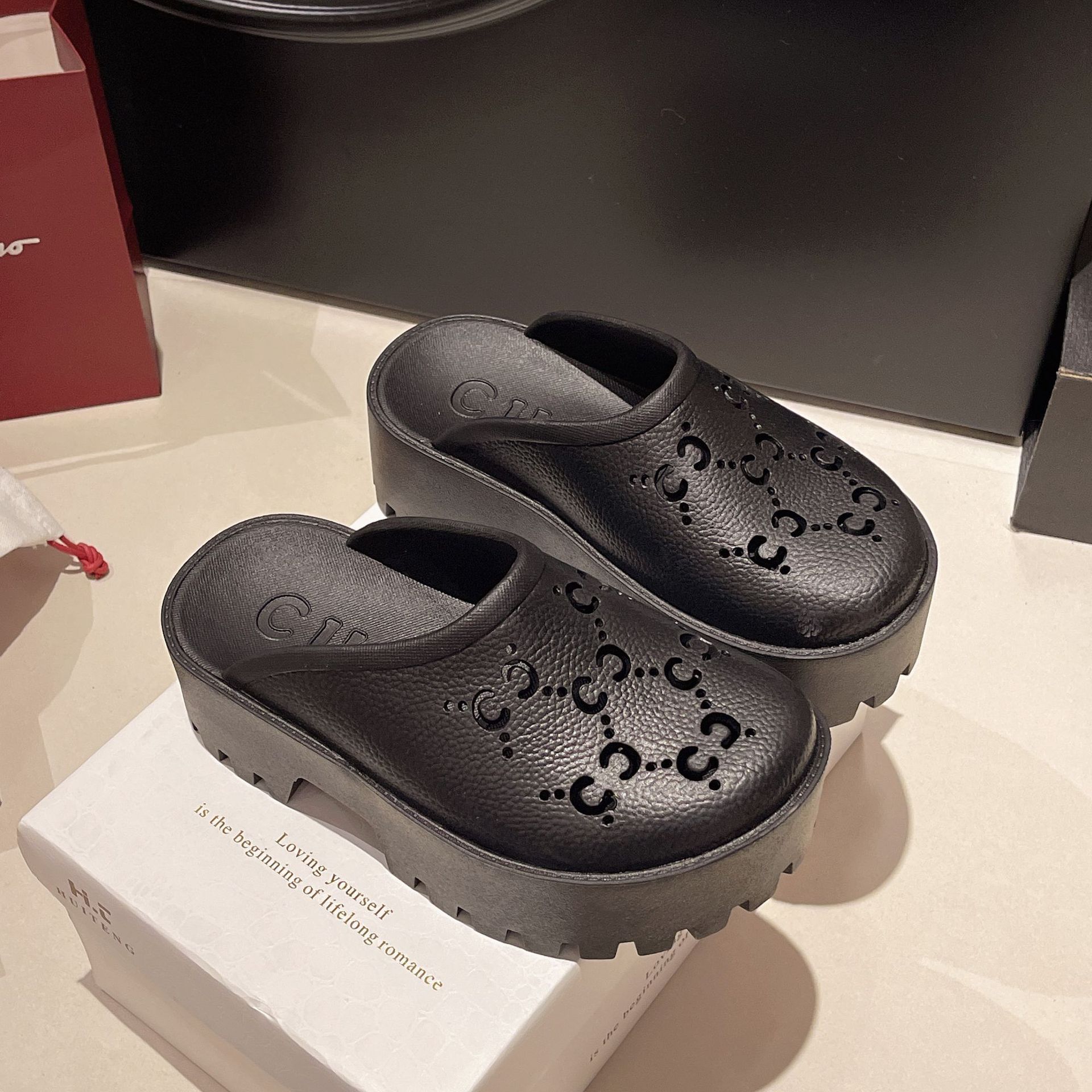 G 브랜드 2024 봄/여름 레터링 컷아웃 무광 조각 장식 앞코가 둥근 두꺼운 밑창 슬리퍼 여성용 낮은 굽스토어 가기