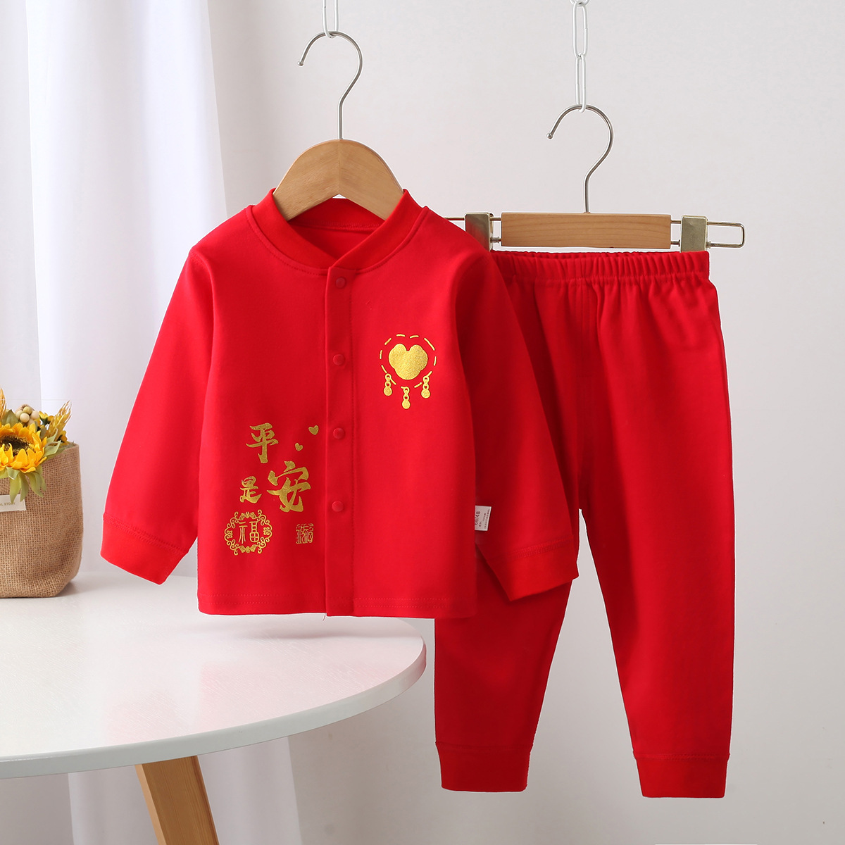 가을과 겨울 새로운 어린이 빨간 속옷 세트 소년 소녀 아기 겉옷 투피스 레드 스플릿 탈착식 가랑이 바지