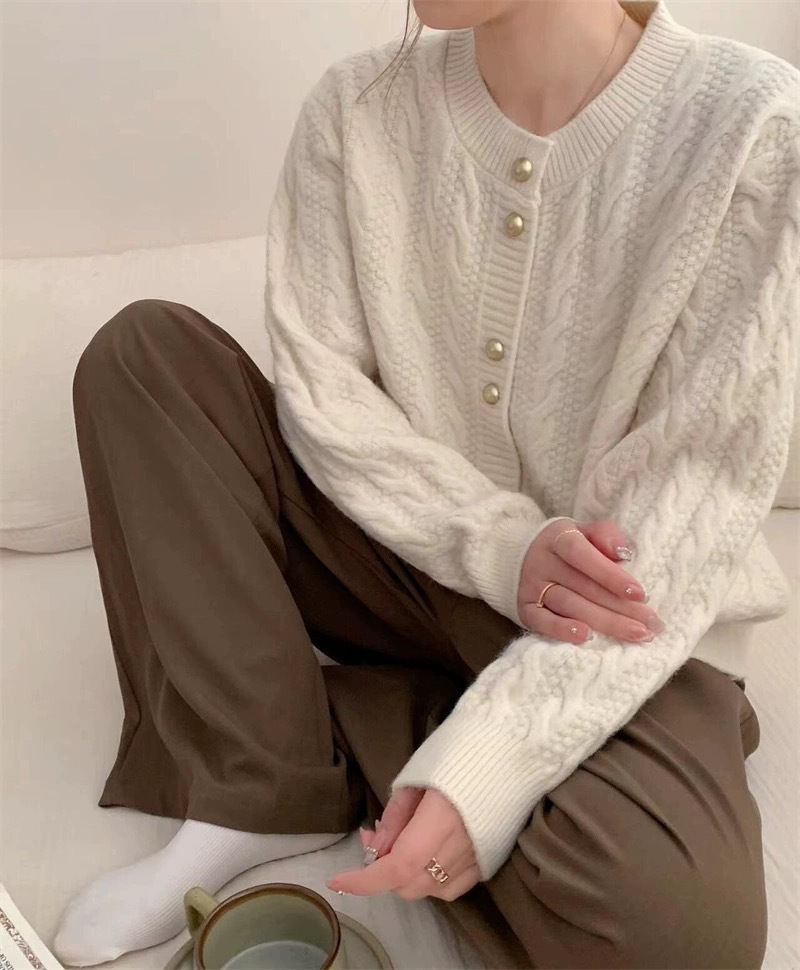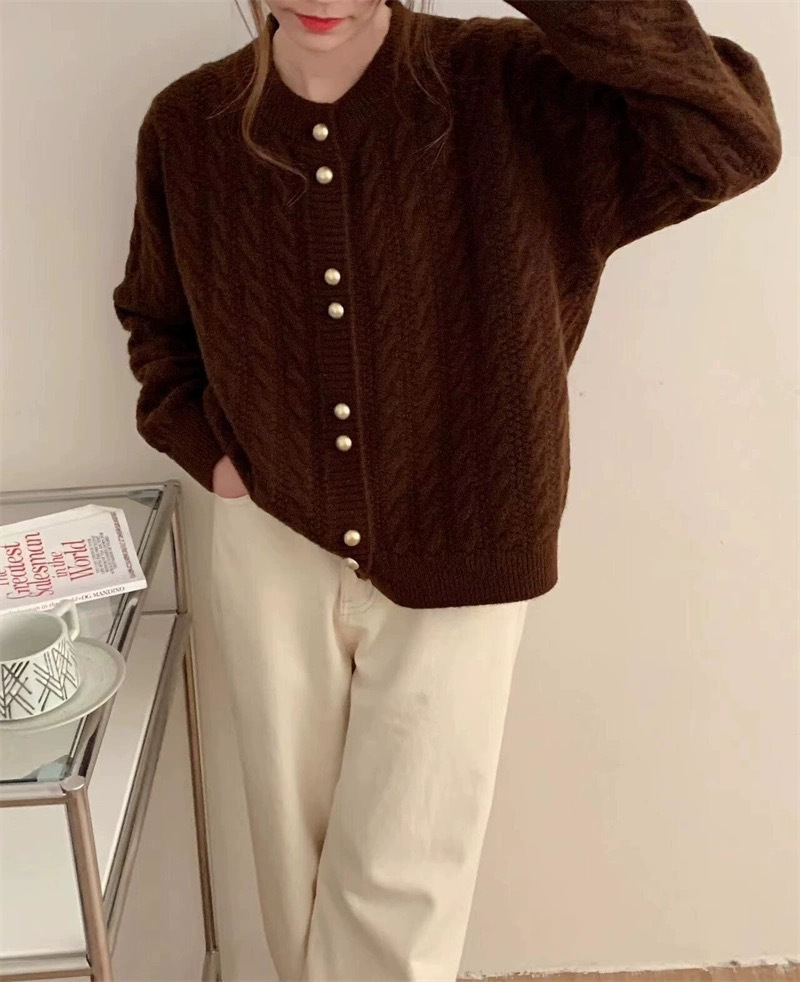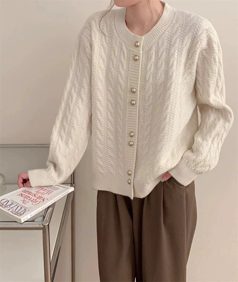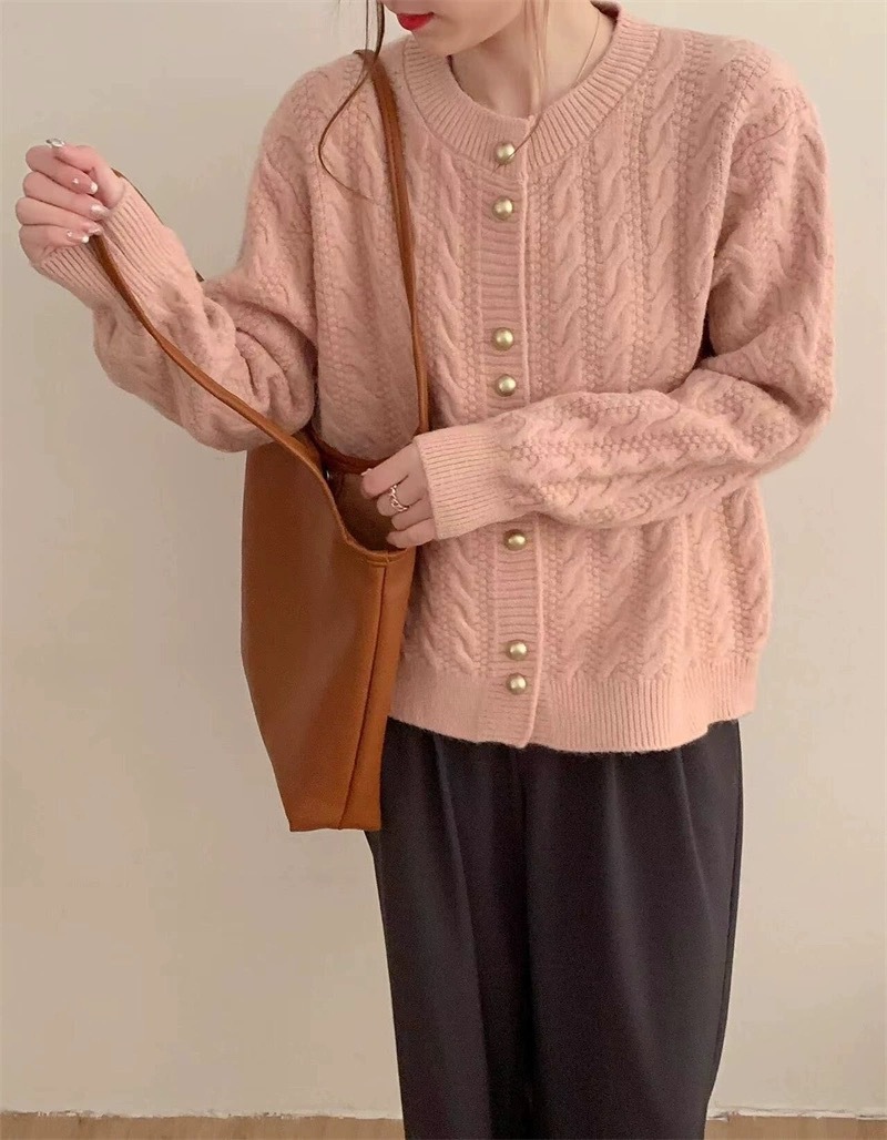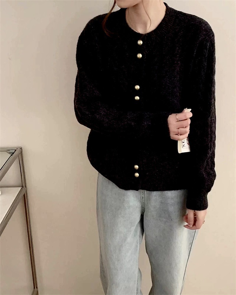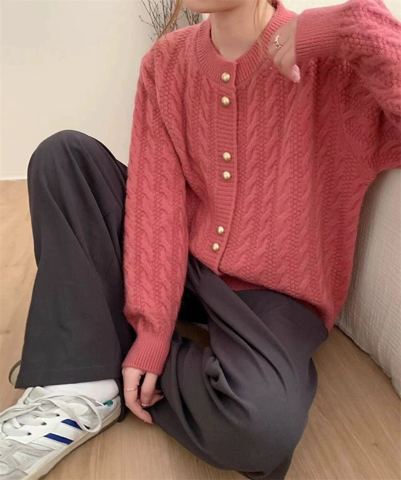 가을 2024 새로운 빈티지 트위스트 골드 버튼 부드러운 스타일 니트 카디건 라운드 넥 솔리드 컬러 디자인 스웨터 탑스토어 가기