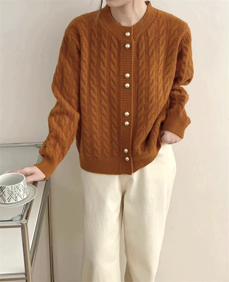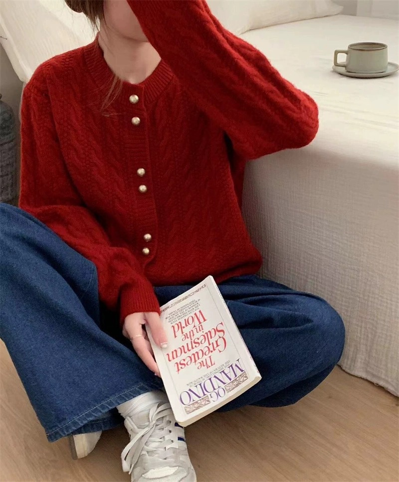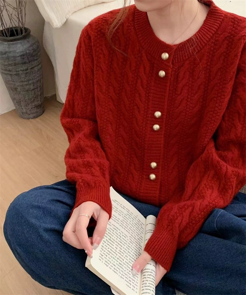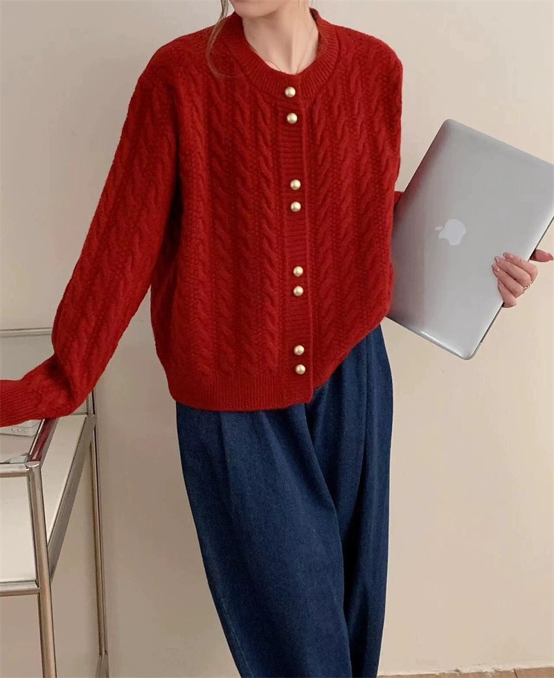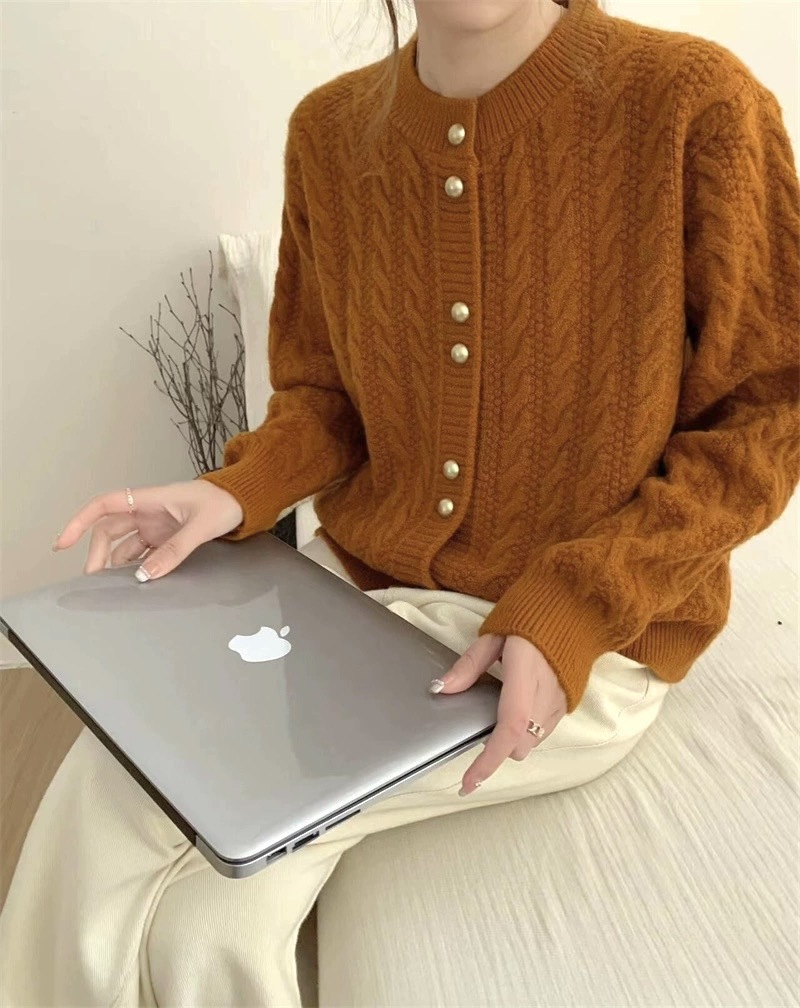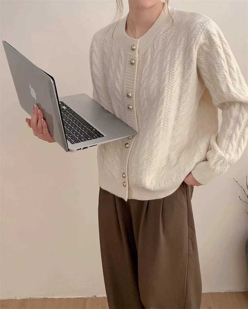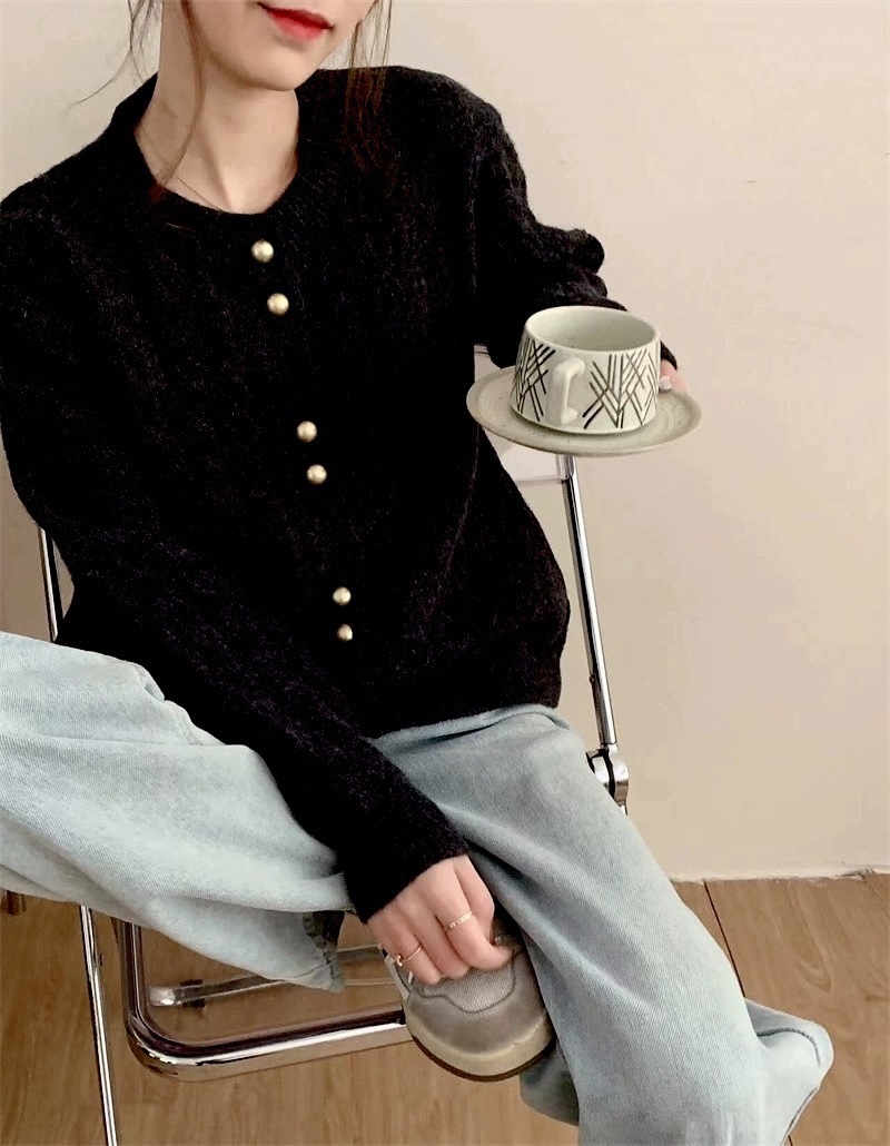 가을 2024 새로운 빈티지 트위스트 골드 버튼 부드러운 스타일 니트 카디건 라운드 넥 솔리드 컬러 디자인 스웨터 탑스토어 가기