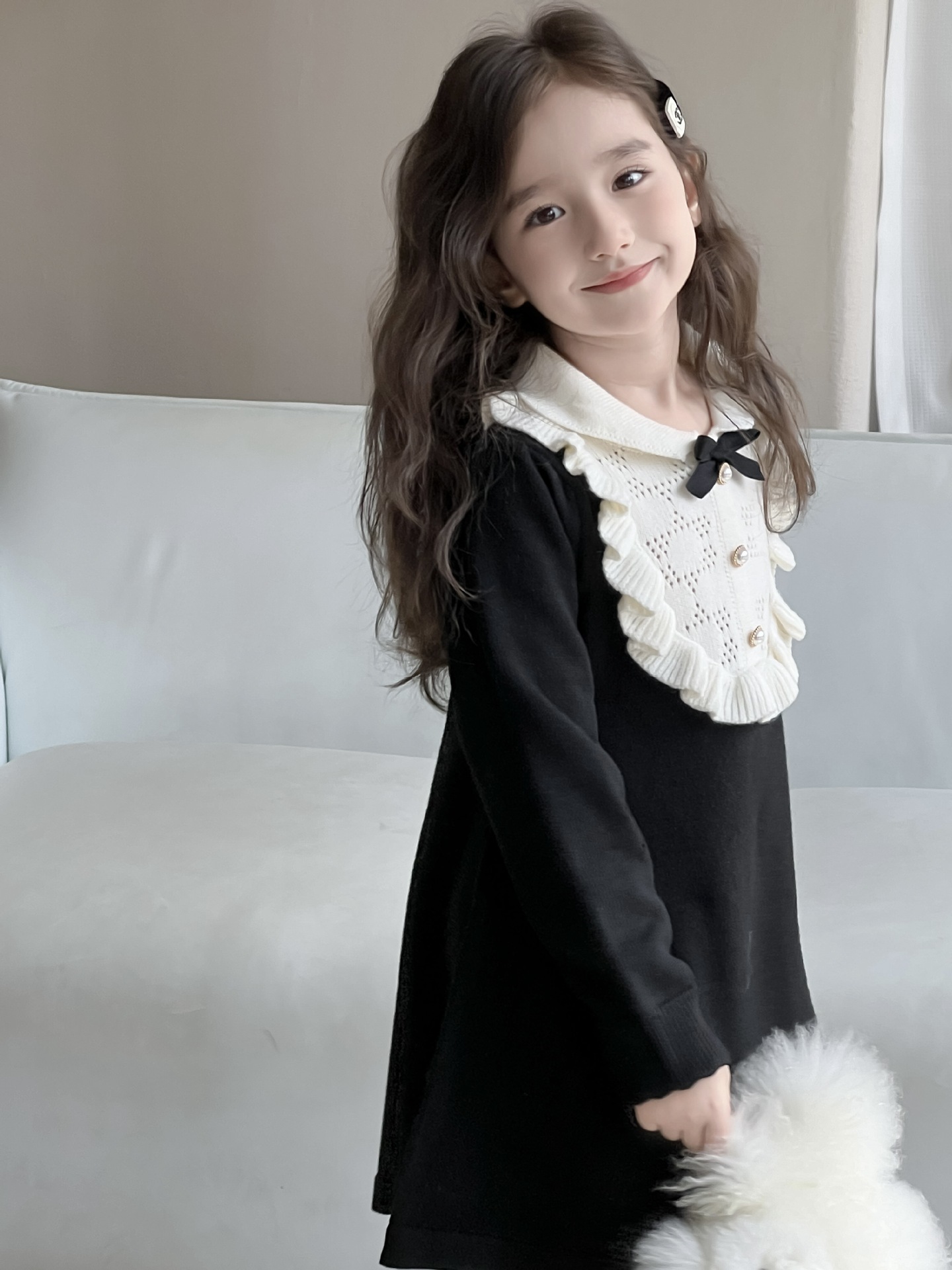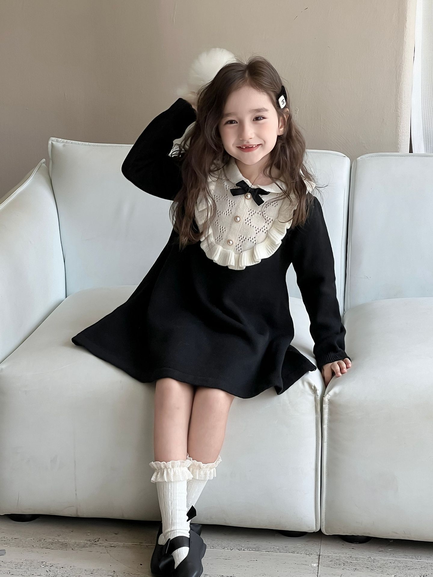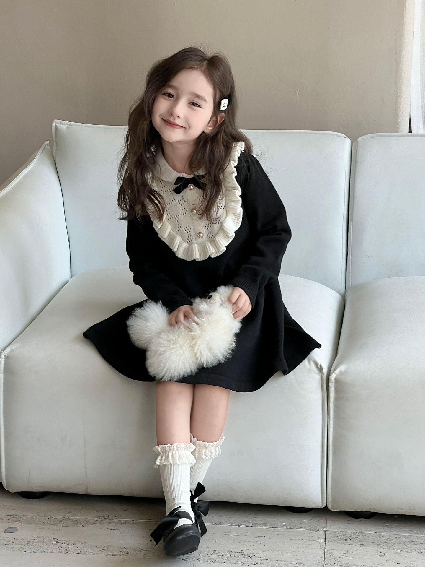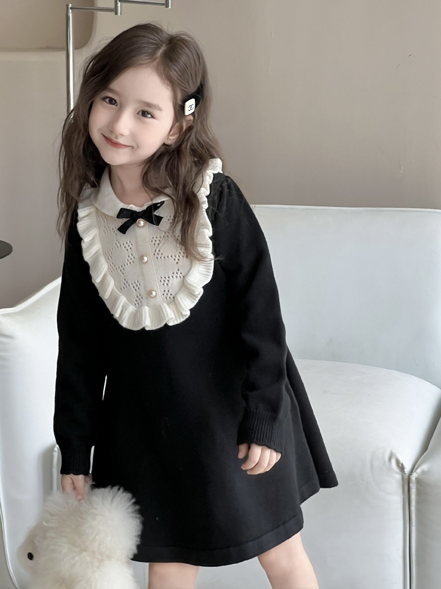여자 니트 드레스 2024 가을, 겨울 새로운 프랑스 햅번 스타일 모직 스커트 어린이 스타일 중공업 바닥 스커트