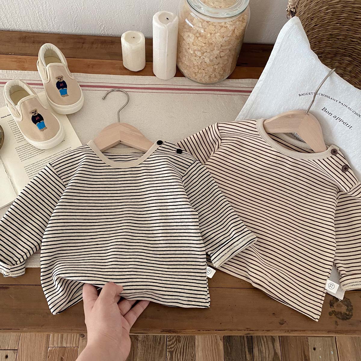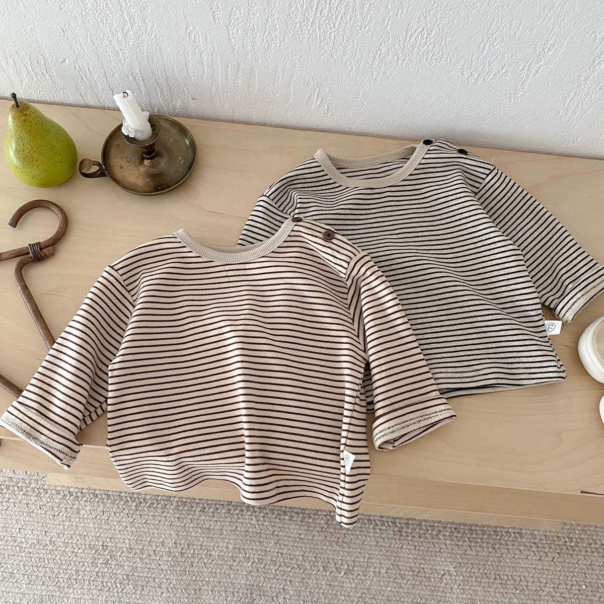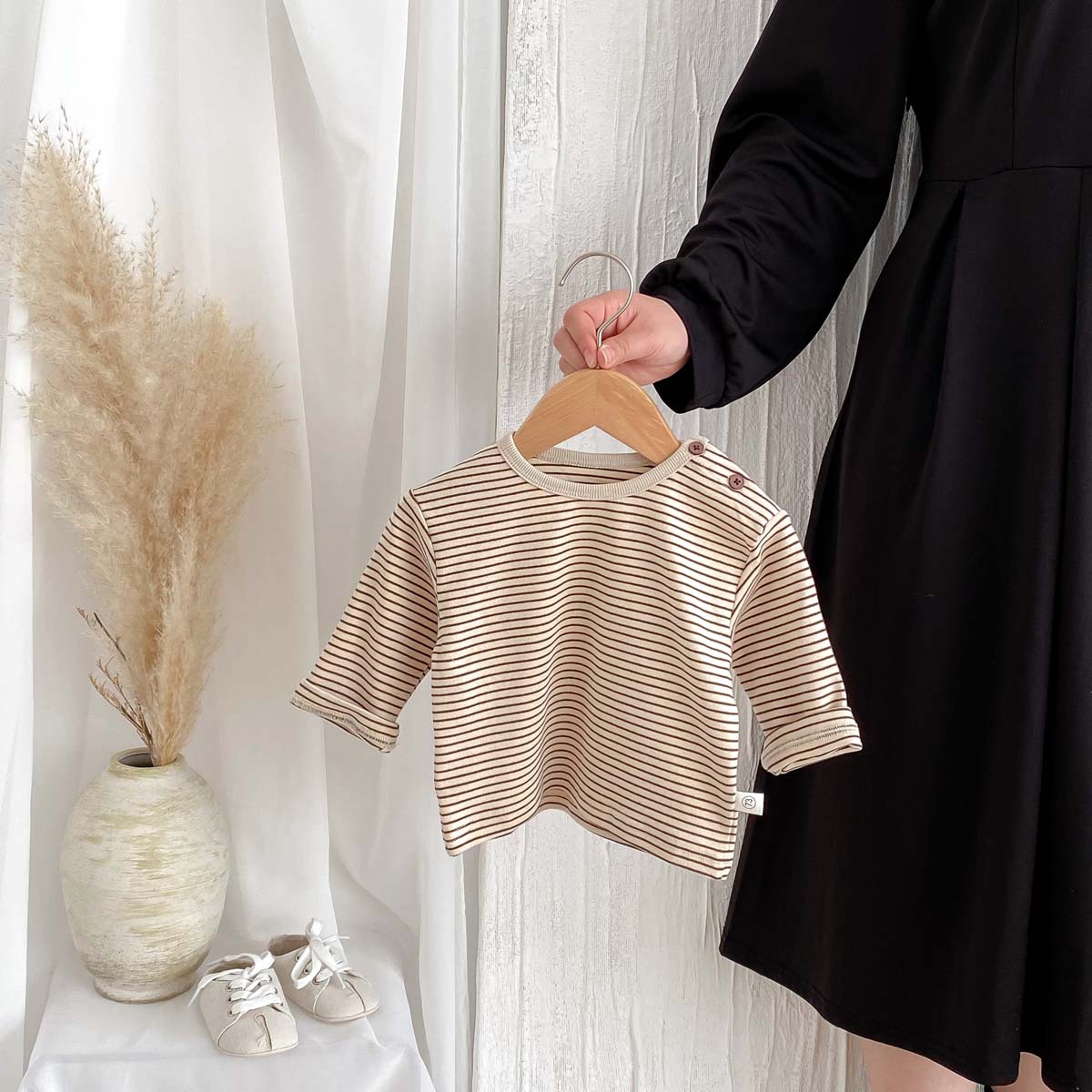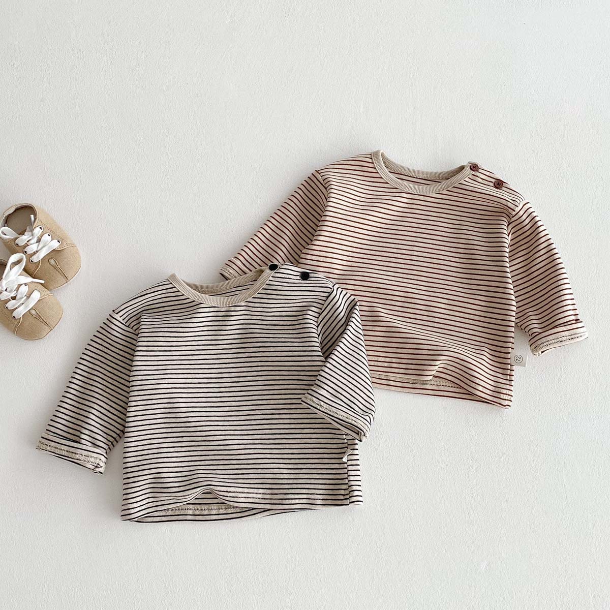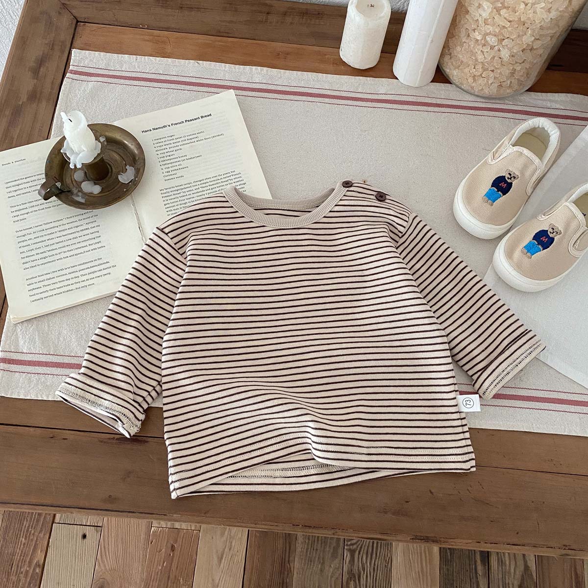 봄가을 남아 스트라이프 오프숄더 버튼 긴팔 상의 유아 한국 스타일 이너웨어 여아 다용도 아우터 티셔츠스토어 가기