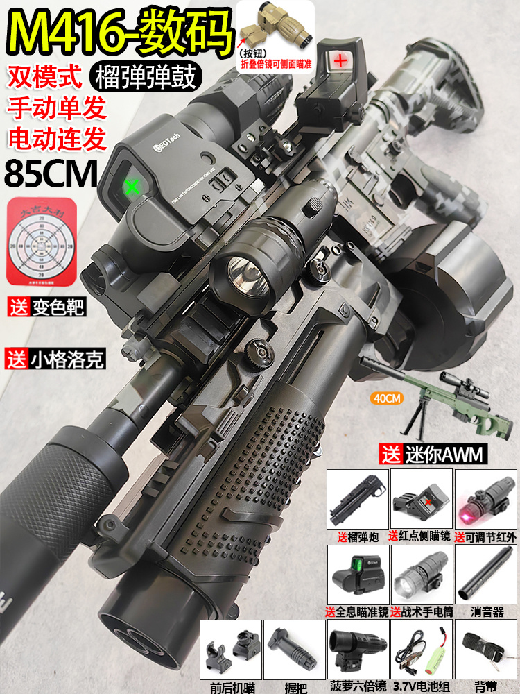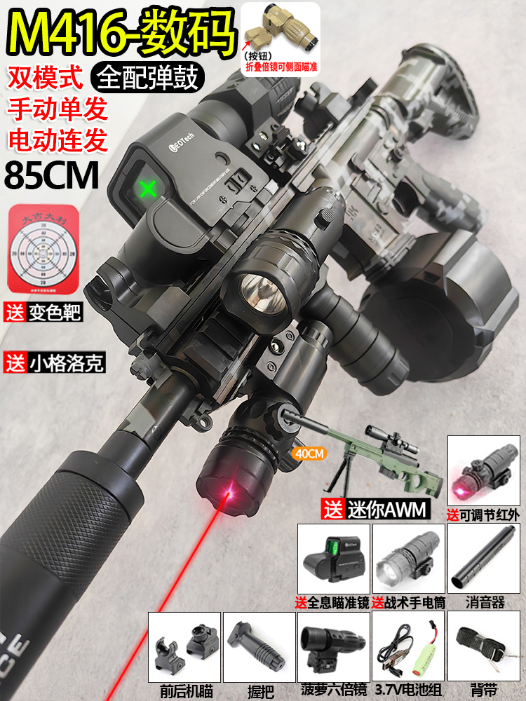• [완전 구성 + 적외선 손전등 홀로그램 + 드럼 연주] 대형 M416 디지털(조정 가능한 파인애플 돋보기) - 수동 단일/전기 버스트(85cm)