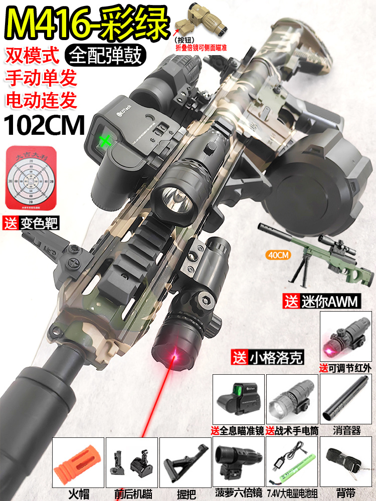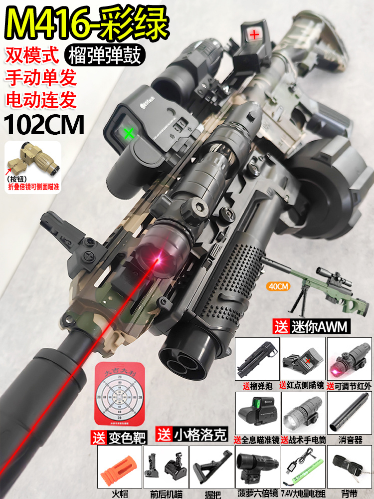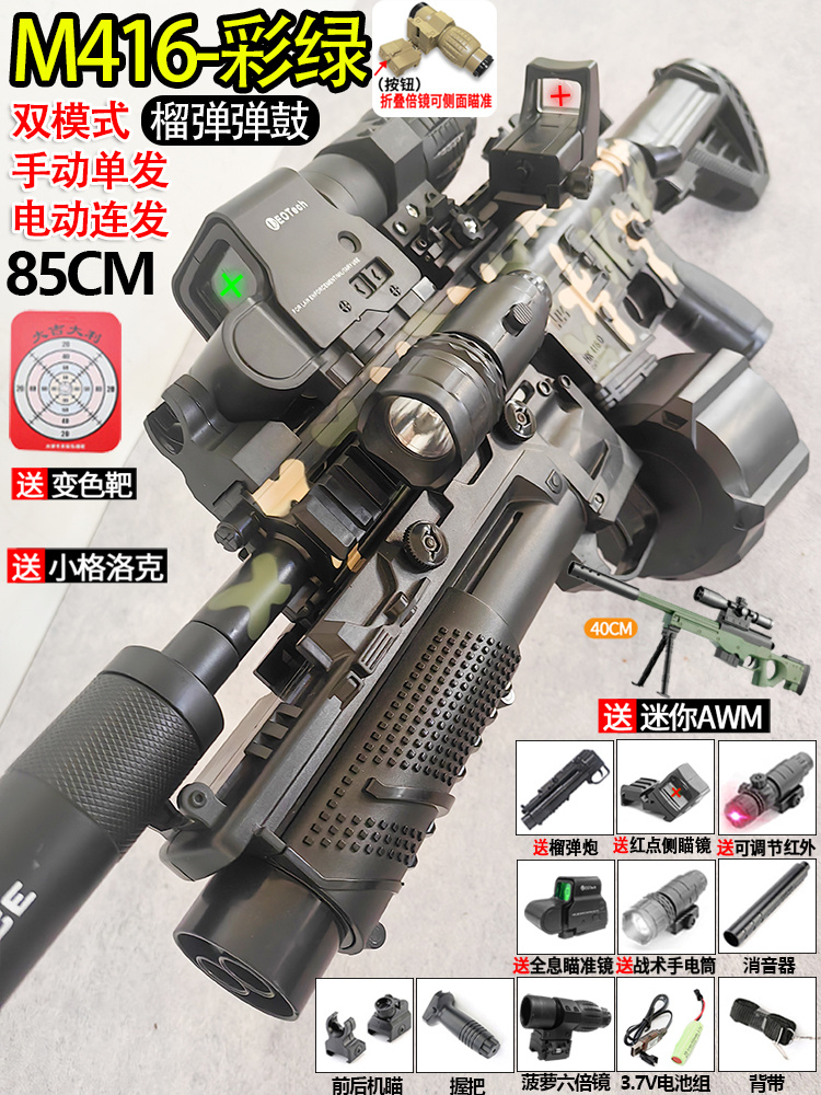 • [완전 구성 + 적외선 손전등 홀로그램 + 드럼] 대형 M416 컬러 그린(조정 가능한 파인애플 돋보기) - 수동 단발/전기 버스트(85cm)