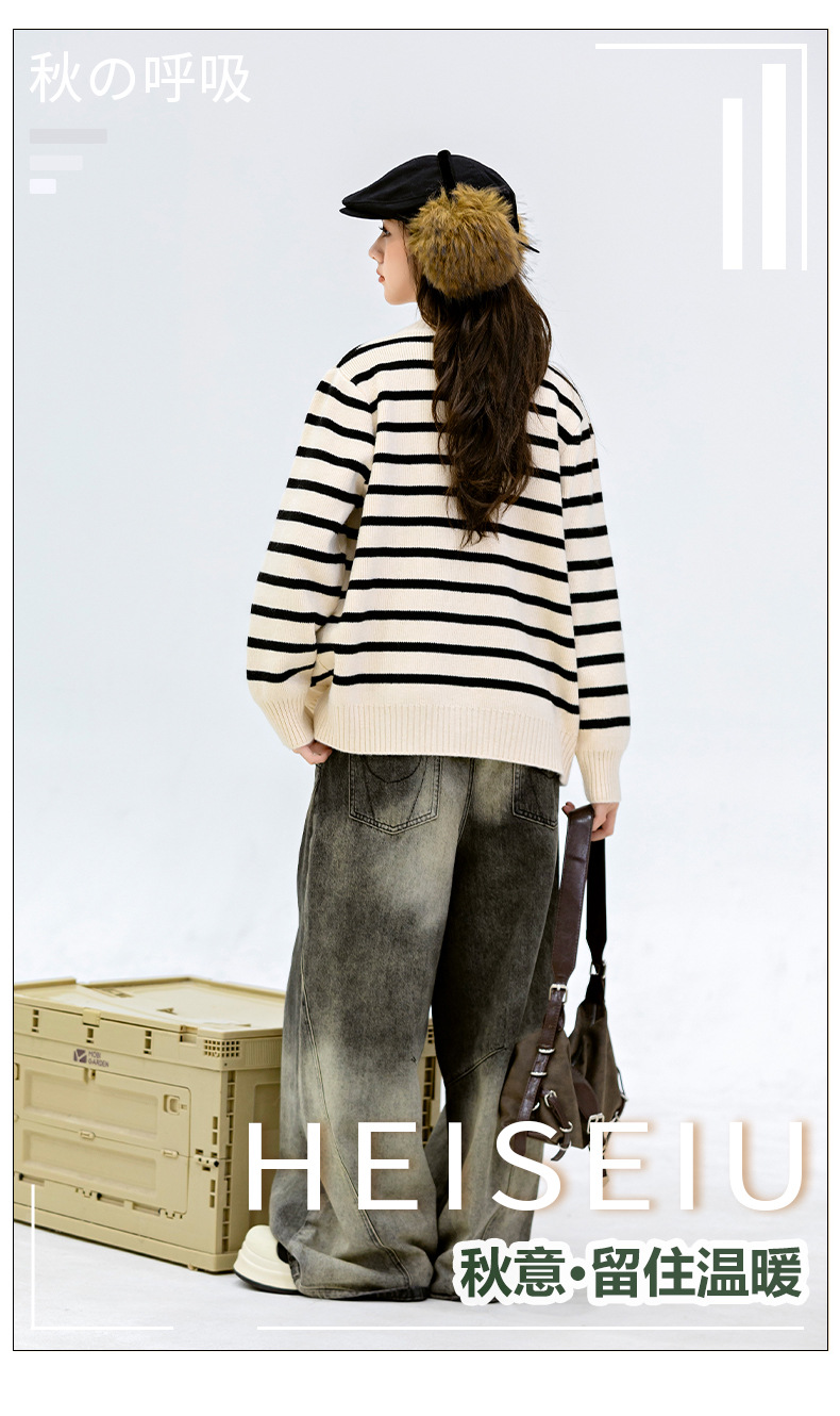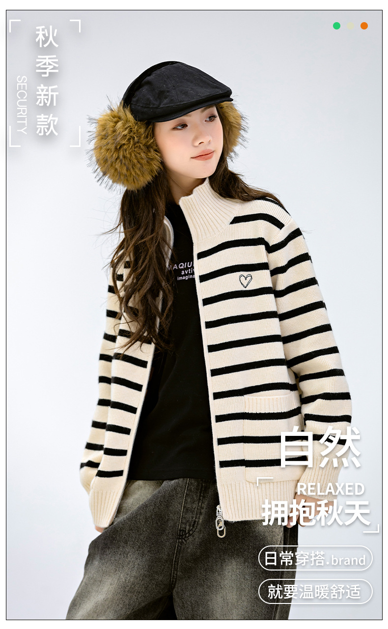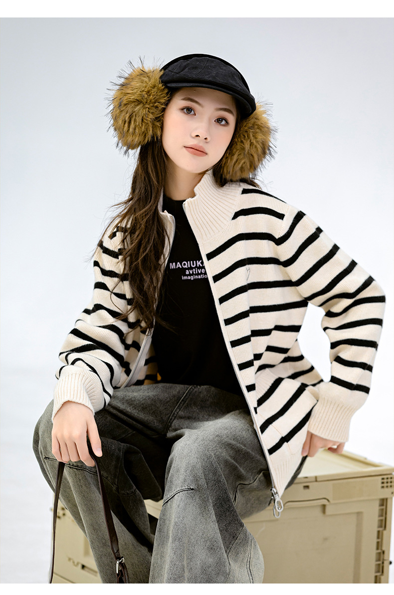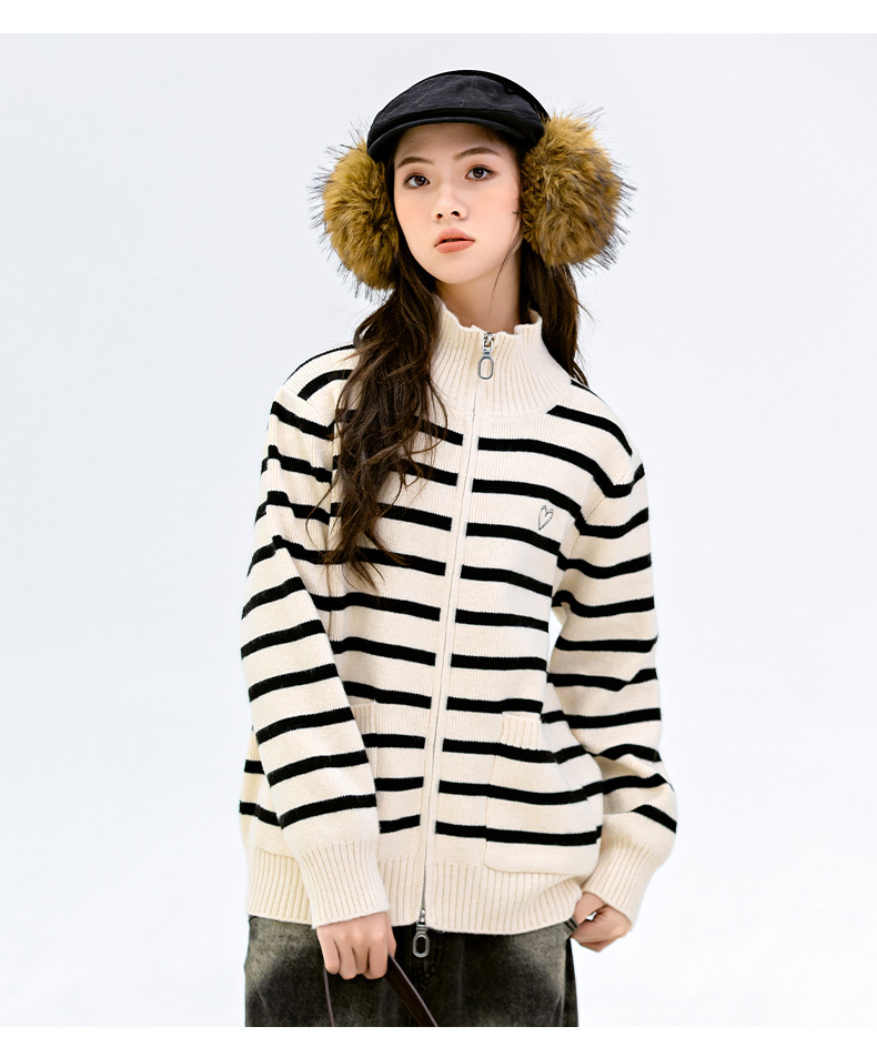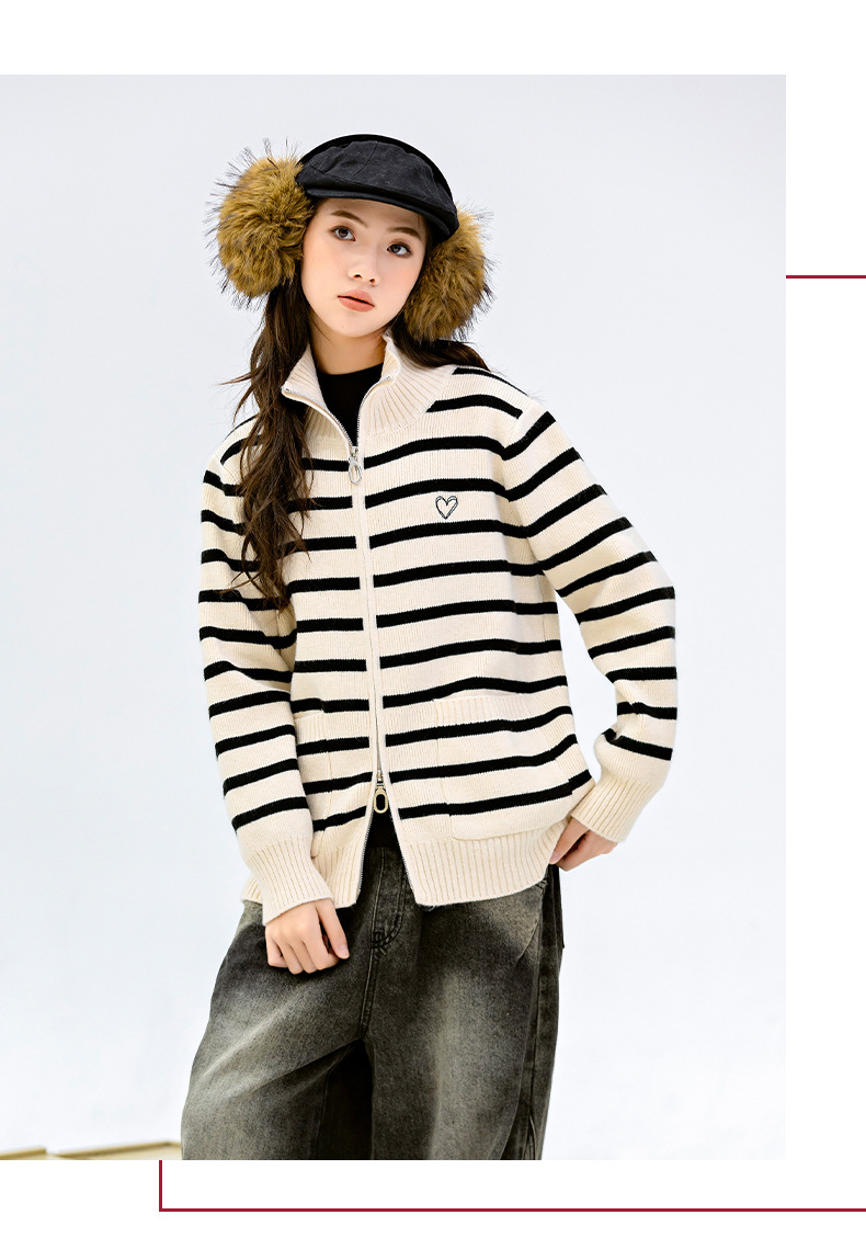 소녀의 큰 소년 더블 지퍼 줄무늬 카디건 스웨터 2024 봄과 가을 새로운 소프트 왁스 레트로 자수 니트 재킷 가을스토어 가기