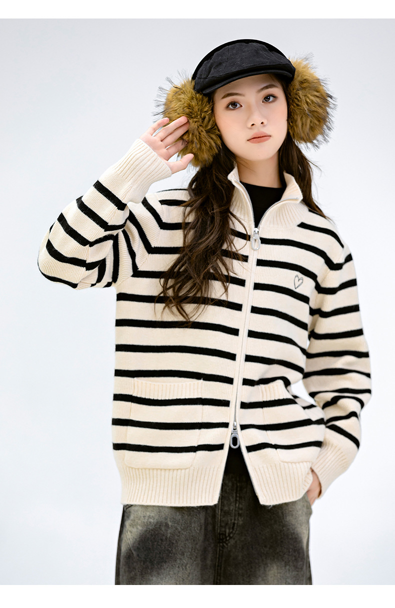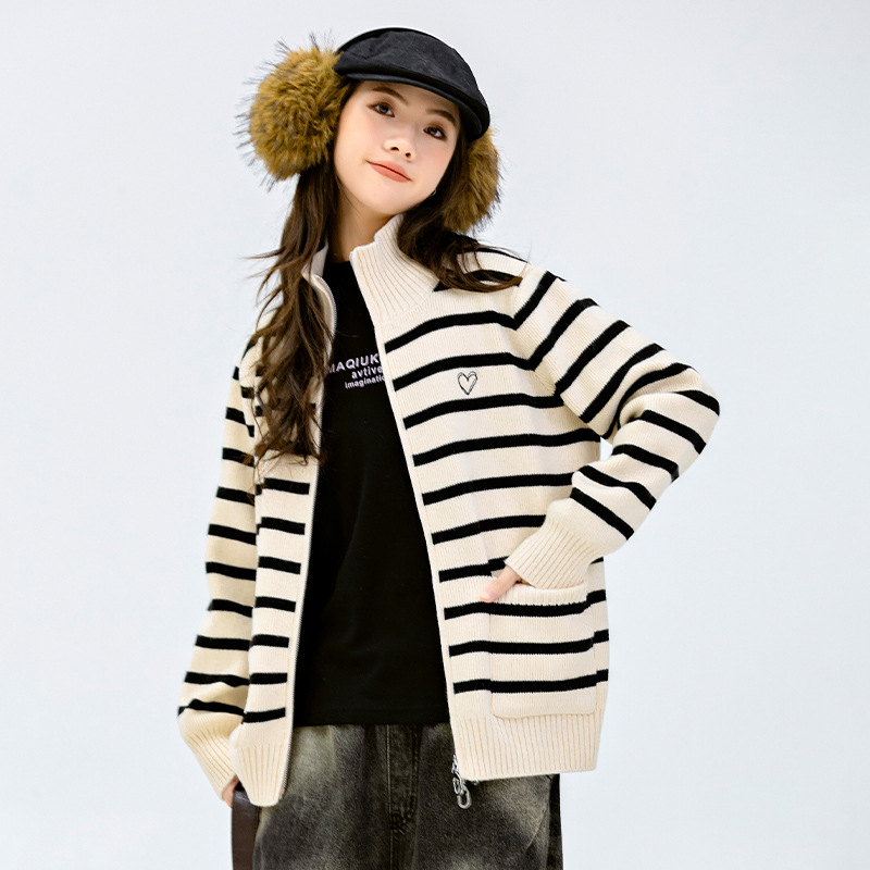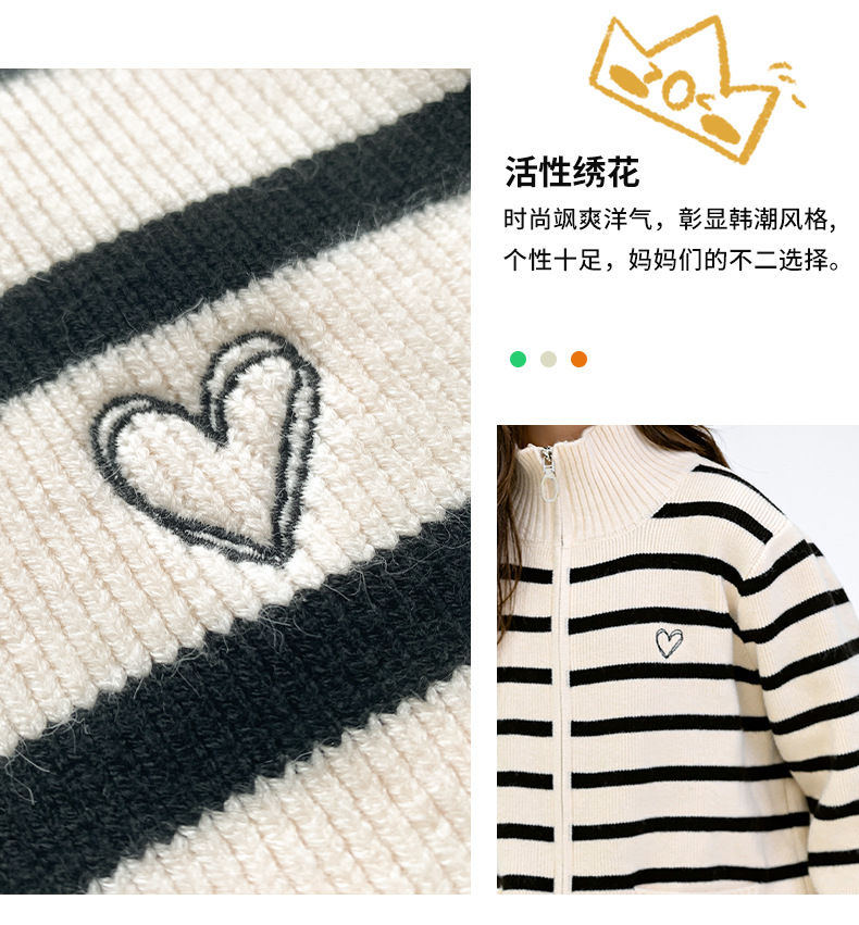 소녀의 큰 소년 더블 지퍼 줄무늬 카디건 스웨터 2024 봄과 가을 새로운 소프트 왁스 레트로 자수 니트 재킷 가을