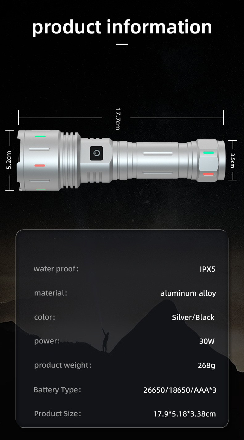 • 30W 형광 백색 레이저 강한 빛 손전등 + 표준 버전 26650 리튬 배터리 + 충전 케이블 + 색상 상자
