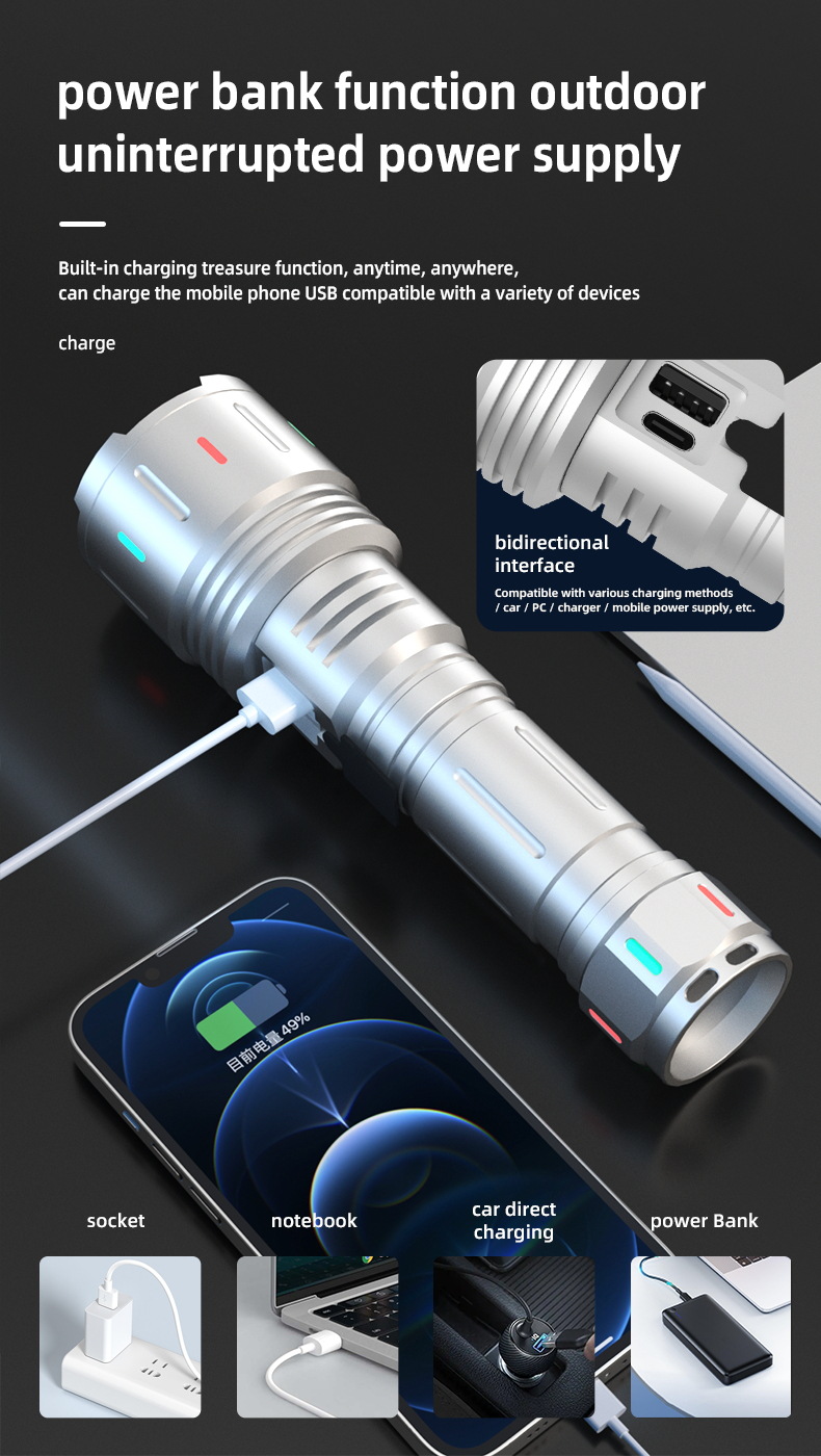 국경 간 뜨거운 판매 형광 강한 빛 조명 알루미늄 손전등 흰색 레이저 전구 야외 모험 USB-C 충전스토어 가기