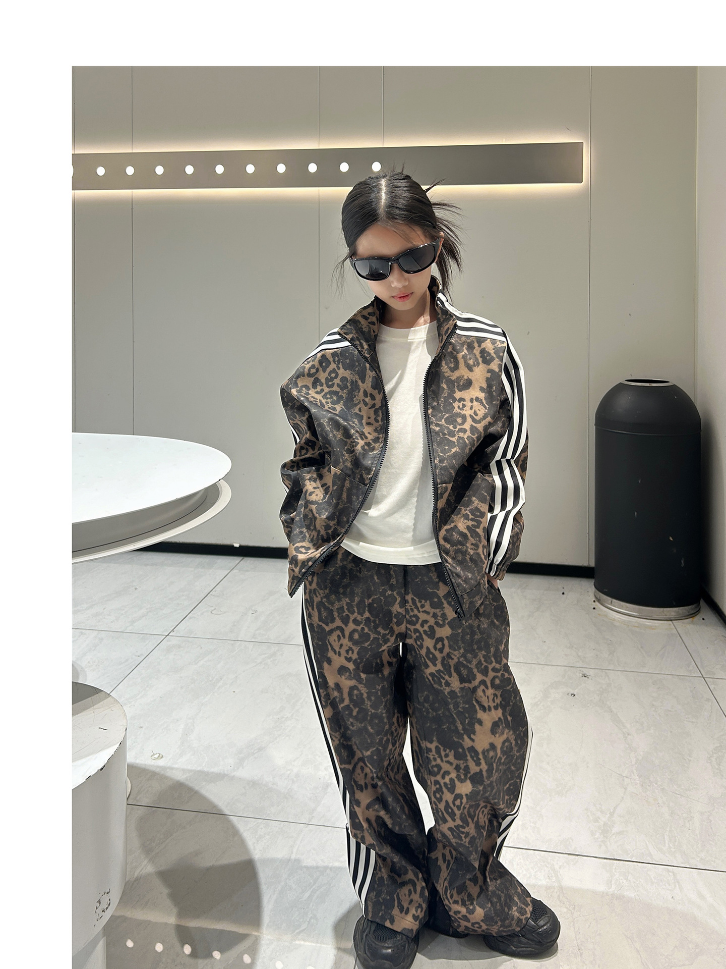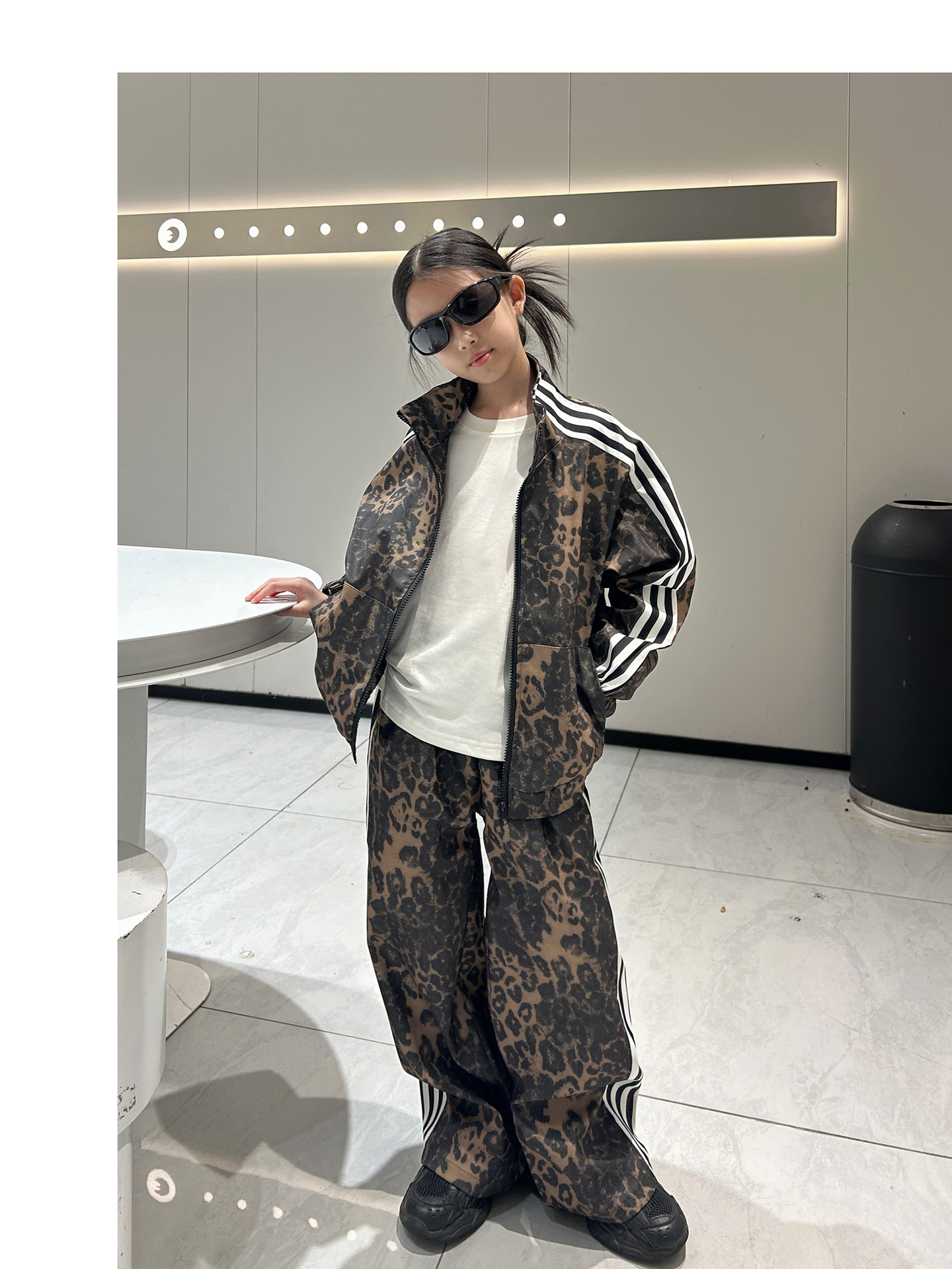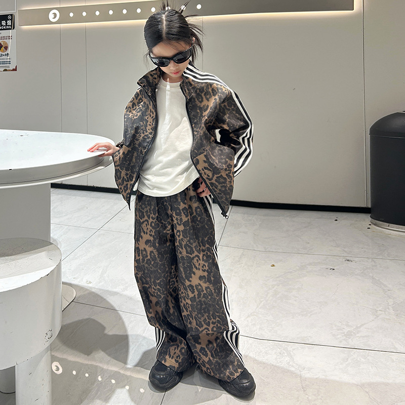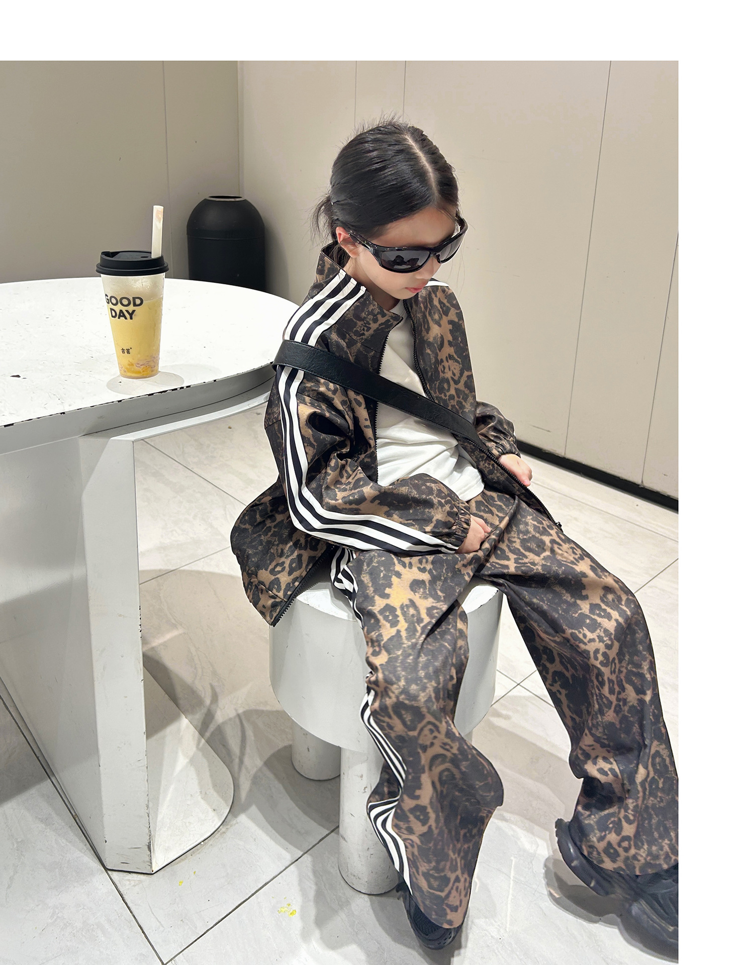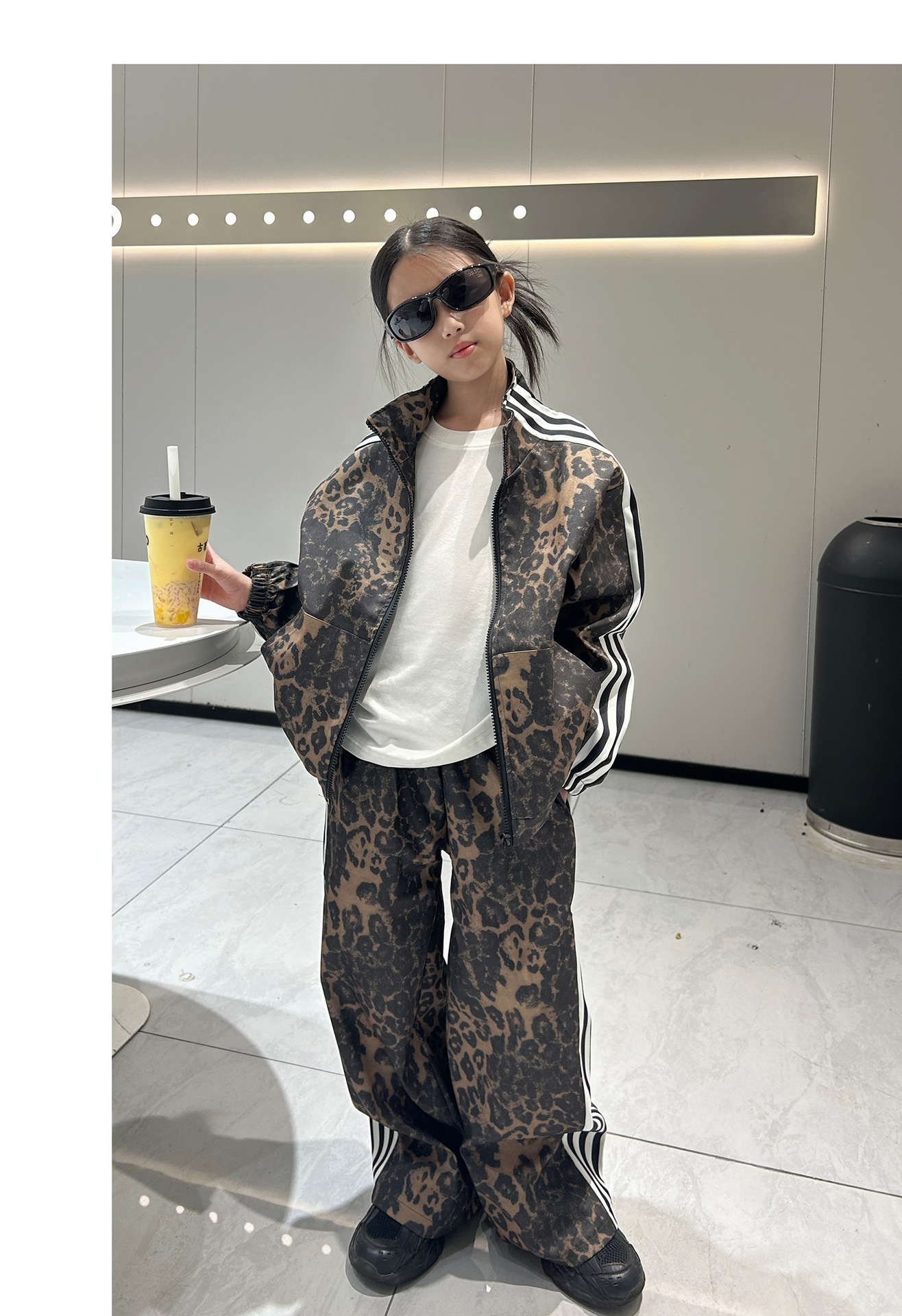 소녀 캐주얼 세트 봄과 가을 2024 새로운 어린이 레오파드 무늬 트렌디 쿨 레트로 느슨한 재킷 코트 넓은 다리 바지스토어 가기