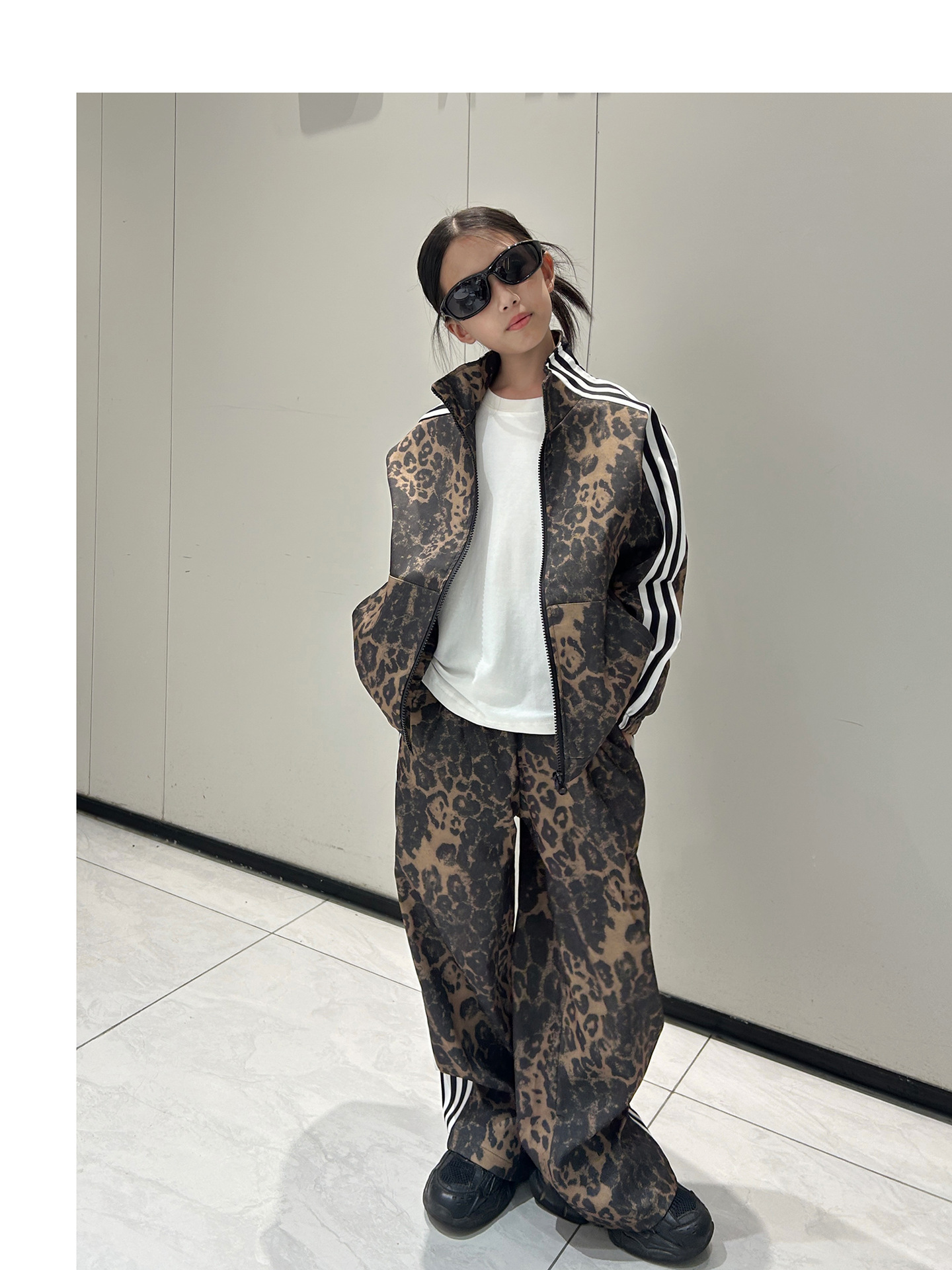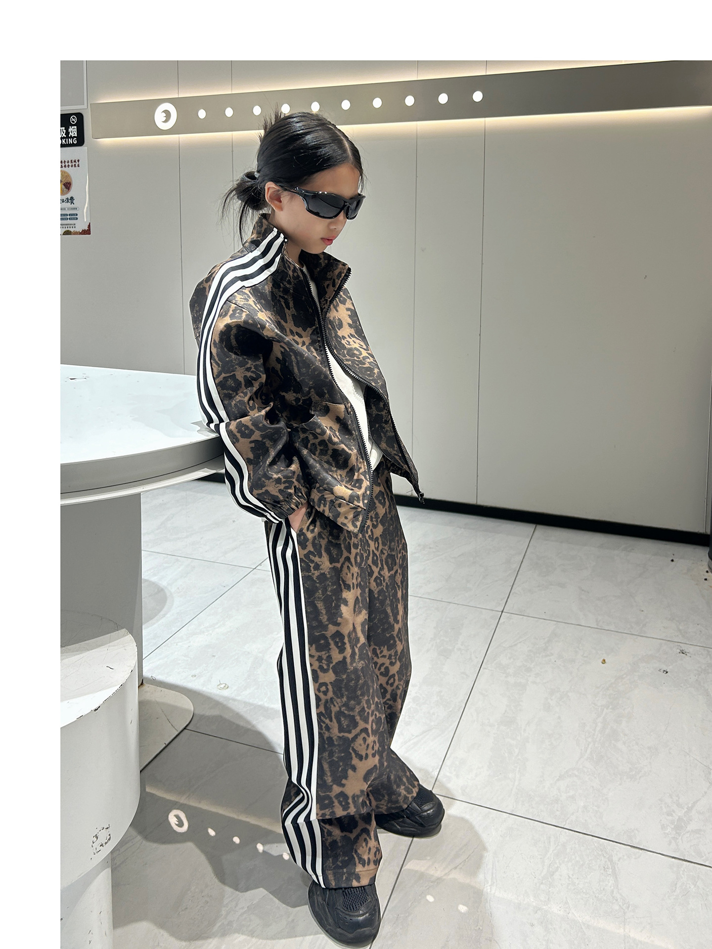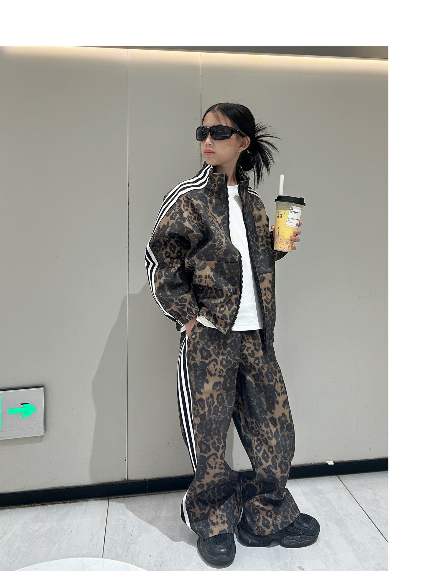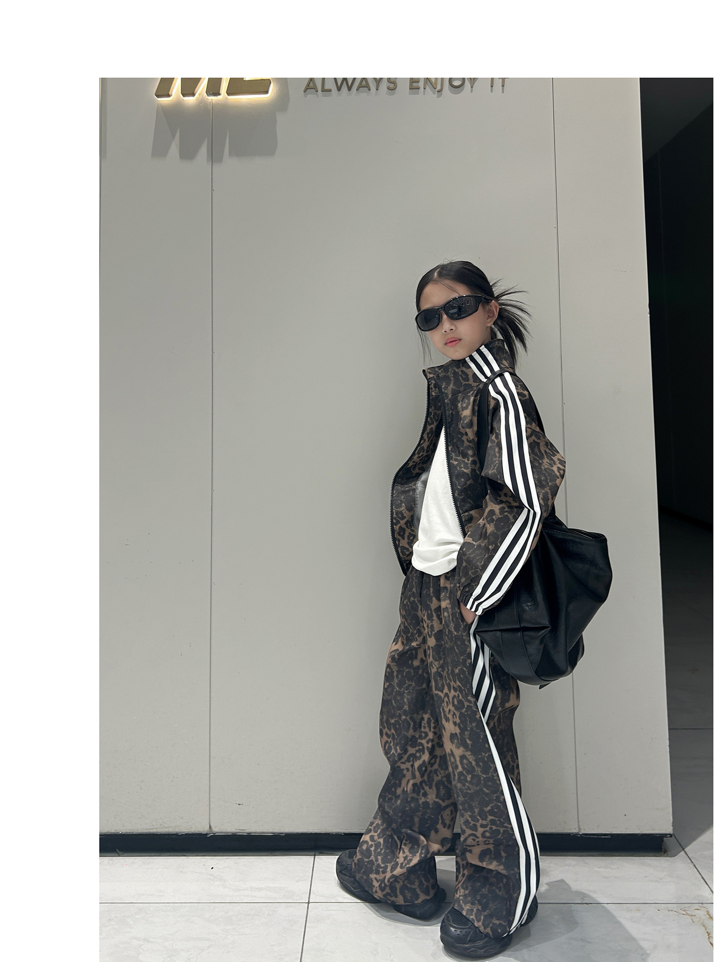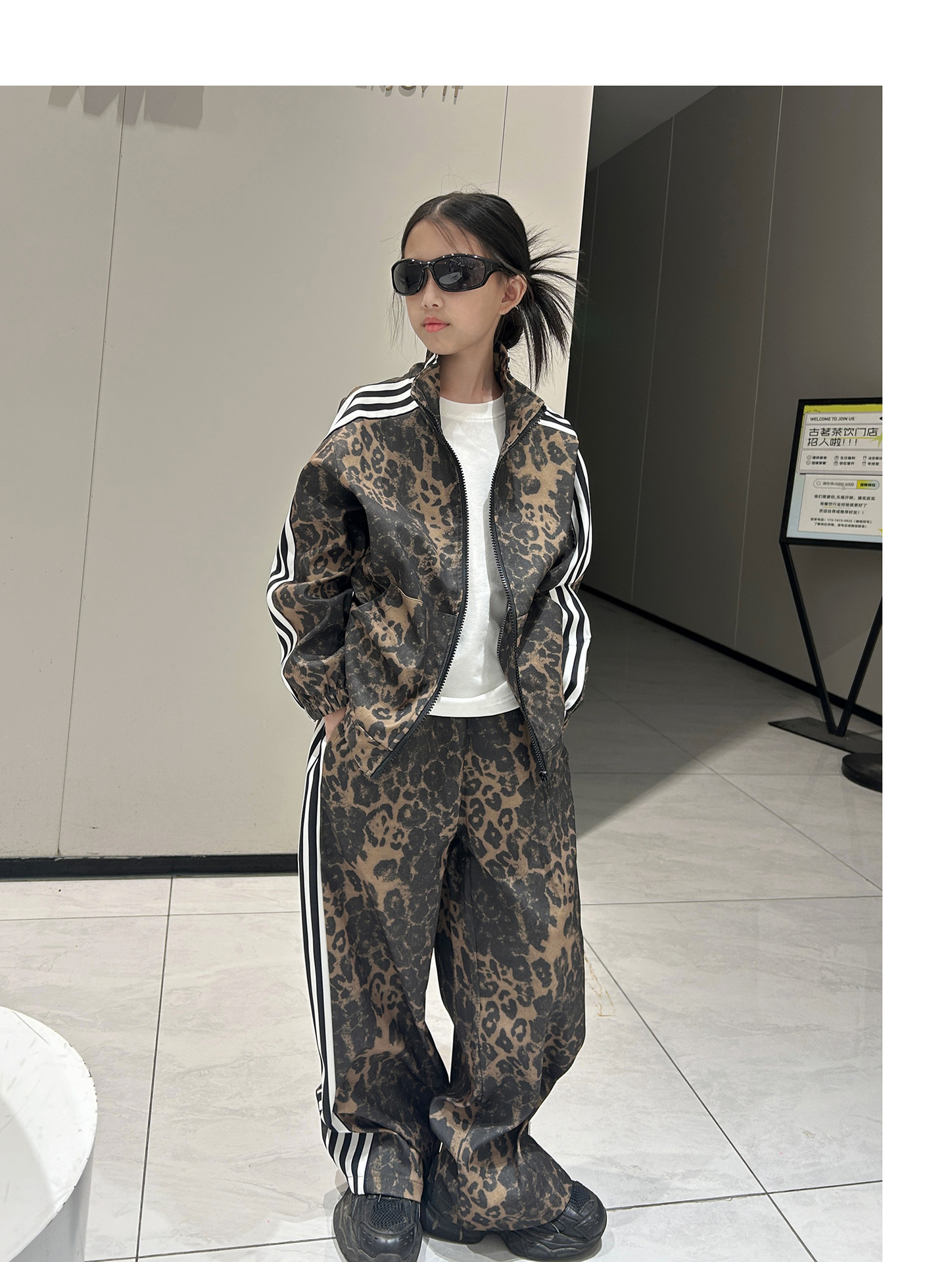 소녀 캐주얼 세트 봄과 가을 2024 새로운 어린이 레오파드 무늬 트렌디 쿨 레트로 느슨한 재킷 코트 넓은 다리 바지스토어 가기