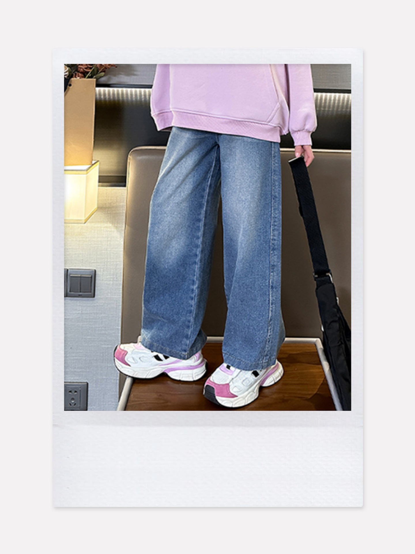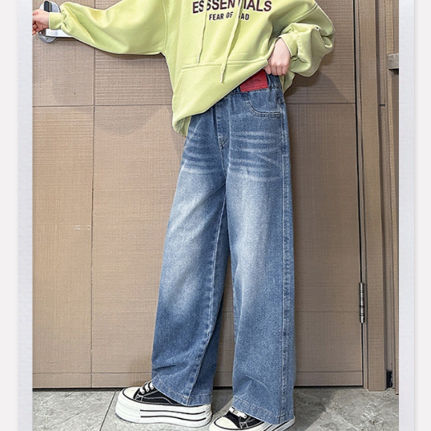 소녀의 넓은 다리 청바지 2024 가을 새로운 도착 서양 스타일 큰 어린이 외부 착용 바지 어린이 가을 느슨한 스트레이트 바지