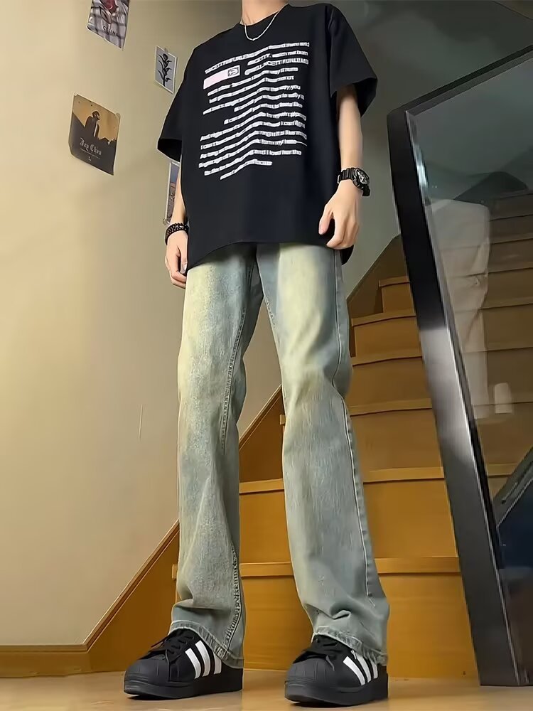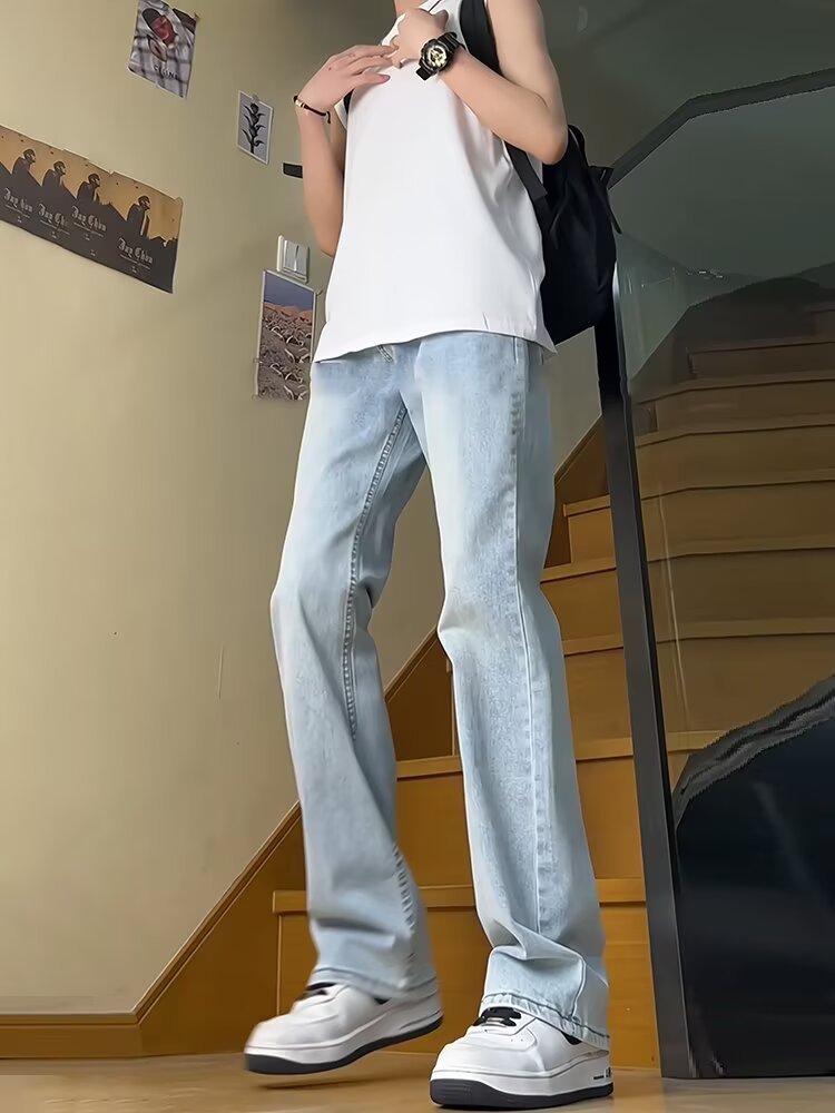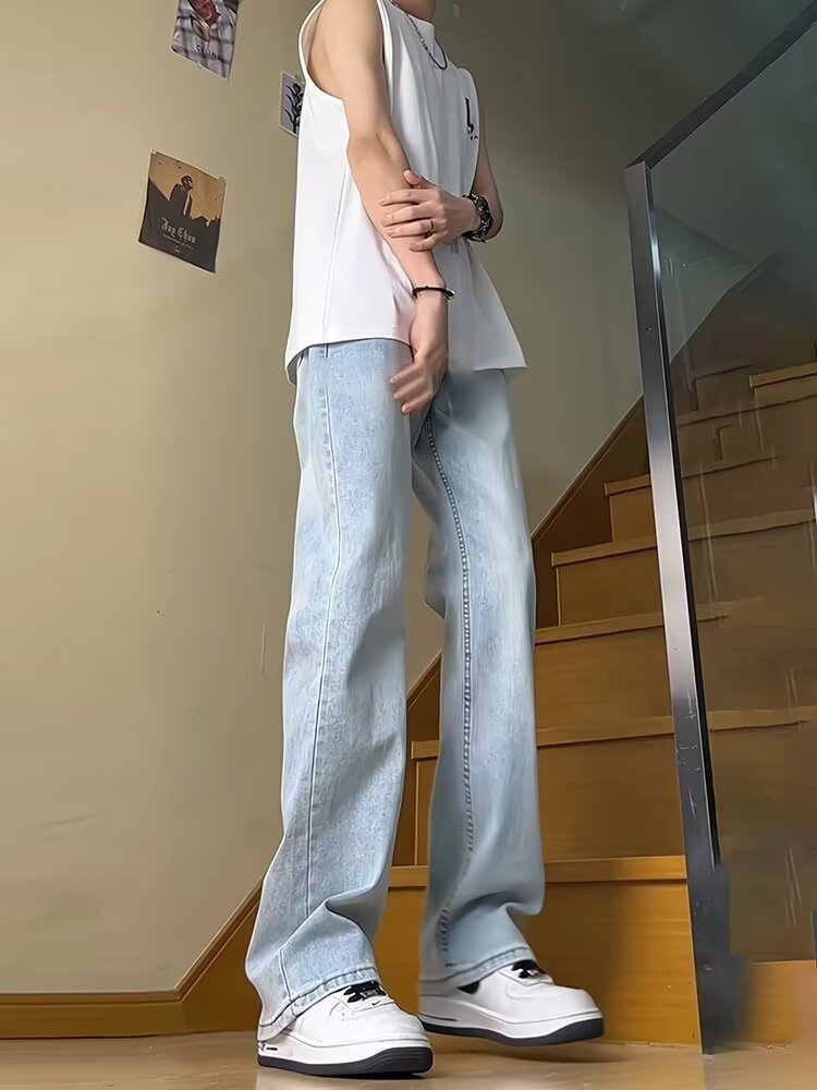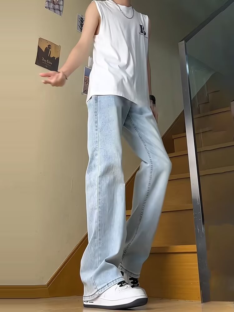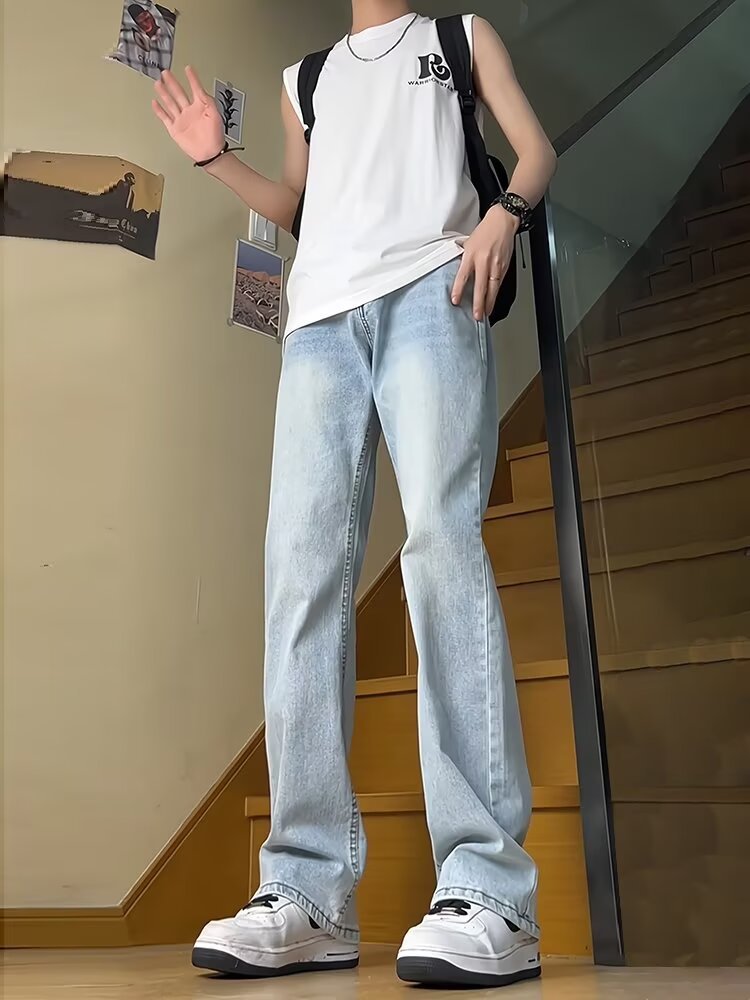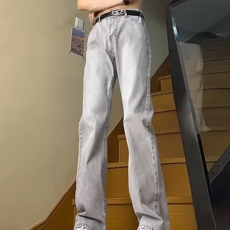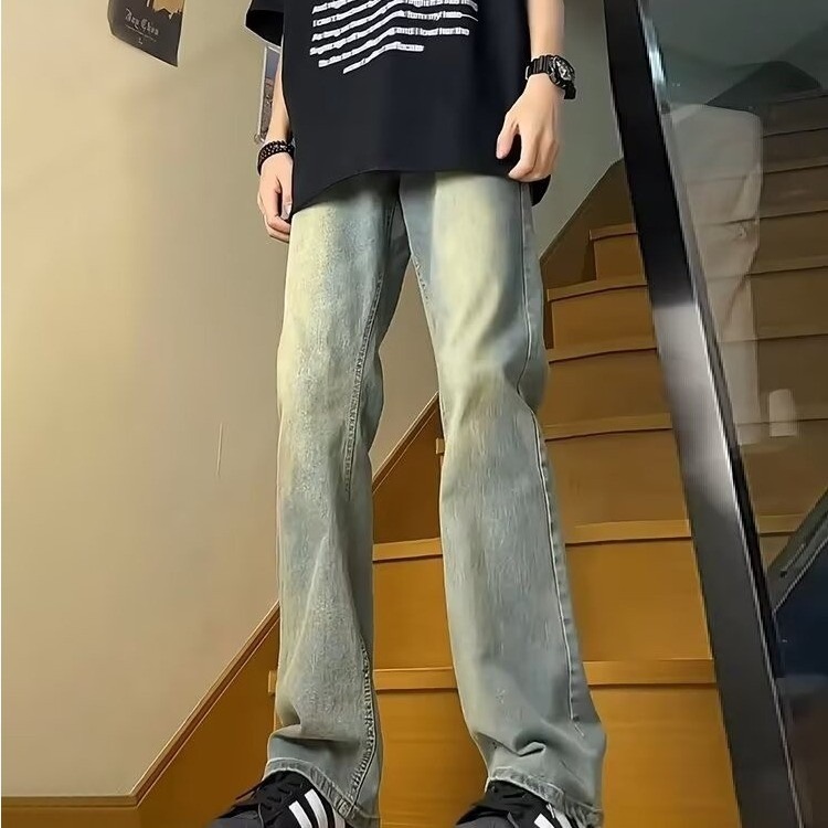 라이트 블루 레트로 아메리칸 청바지 남성 봄과 가을 새로운 하이 스트리트 빈티지 스트레이트 슬림 룩 롱 바지스토어 가기