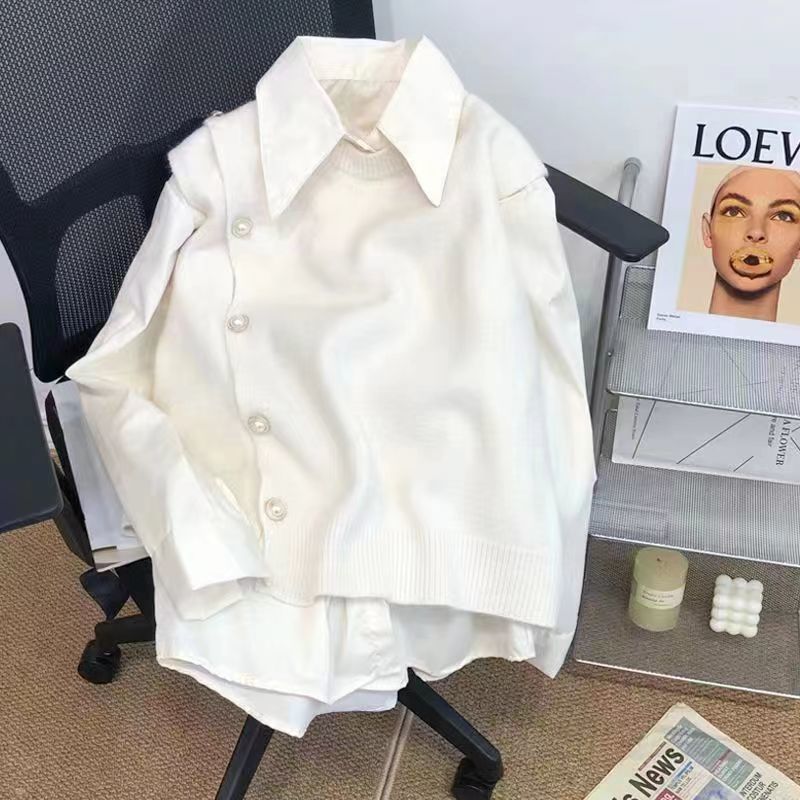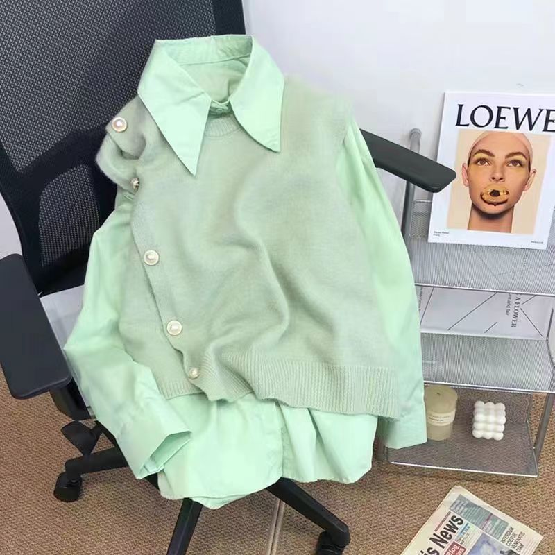 세트 여자 2024 봄과 가을 새로운 일본 스타일 부드러운 느슨한 부드러운 왁스 니트 조끼 우아한 올 매치 긴팔 셔츠