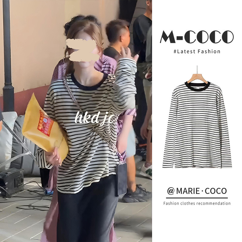 패션 스트라이프 티셔츠 여성의 2024 년 초가을 새로운 느슨한 라운드 넥 풀오버 롱 슬리브 탑 티셔츠스토어 가기