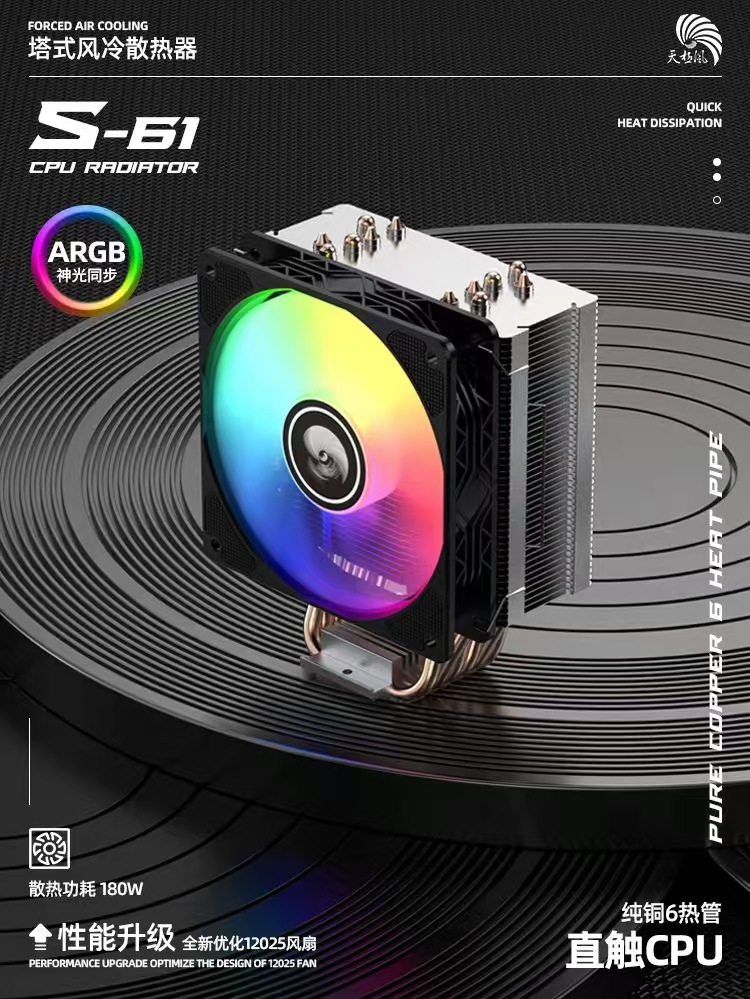 Tianji 바람 S61 컴퓨터 CPU 라디에이터 6 구리 튜브 다채로운 조명 데스크탑 컴퓨터 음소거 라디에이터