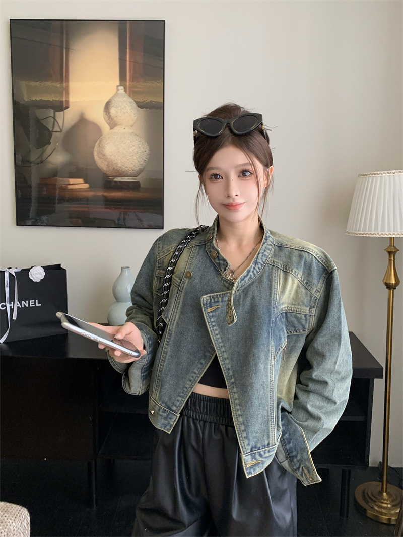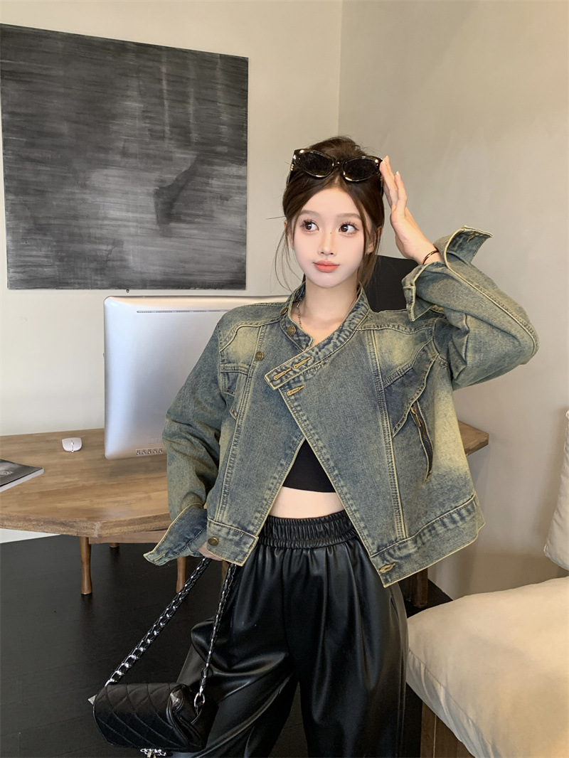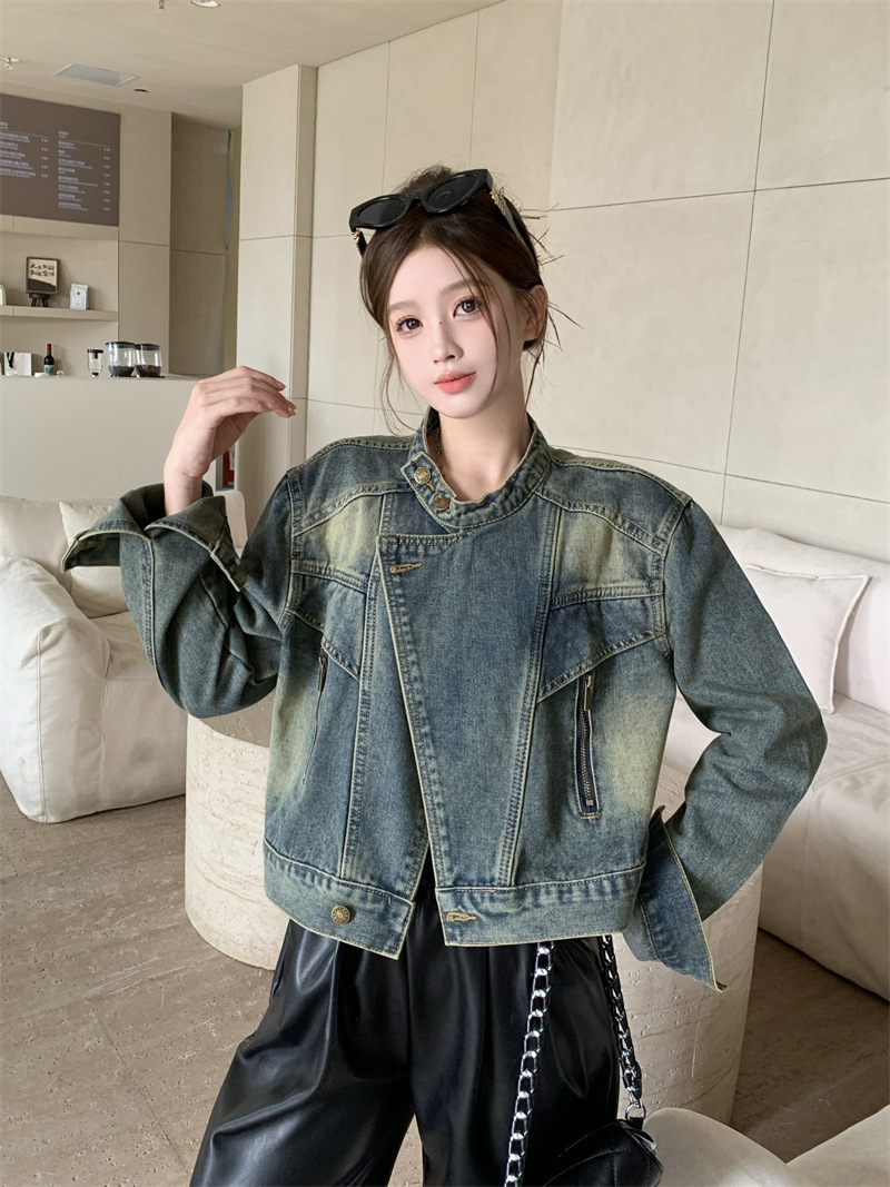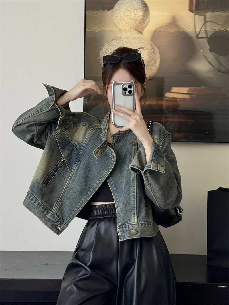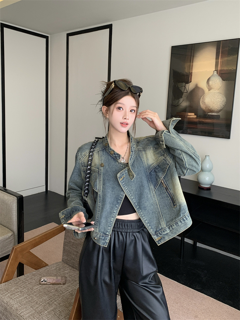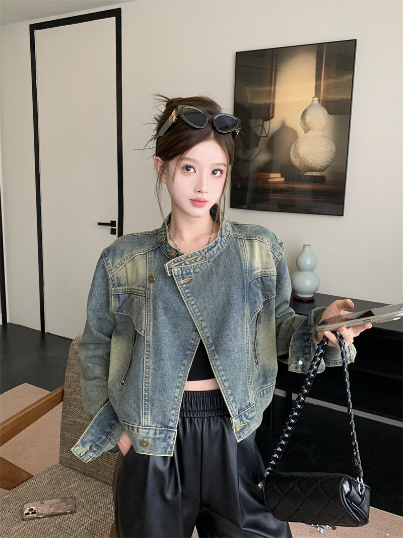 홍콩 스타일 빈티지 칼라 데님 재킷 여성의 봄과 가을 새로운 디자인 센스 하이 엔드 웨스턴 스타일 루즈 재킷 트렌디 탑스토어 가기