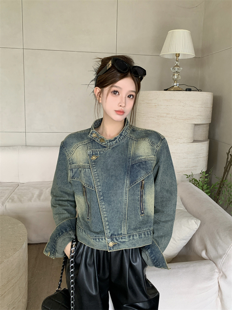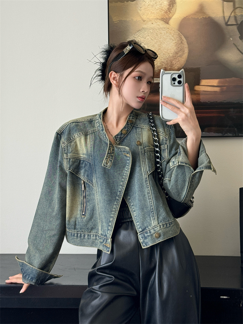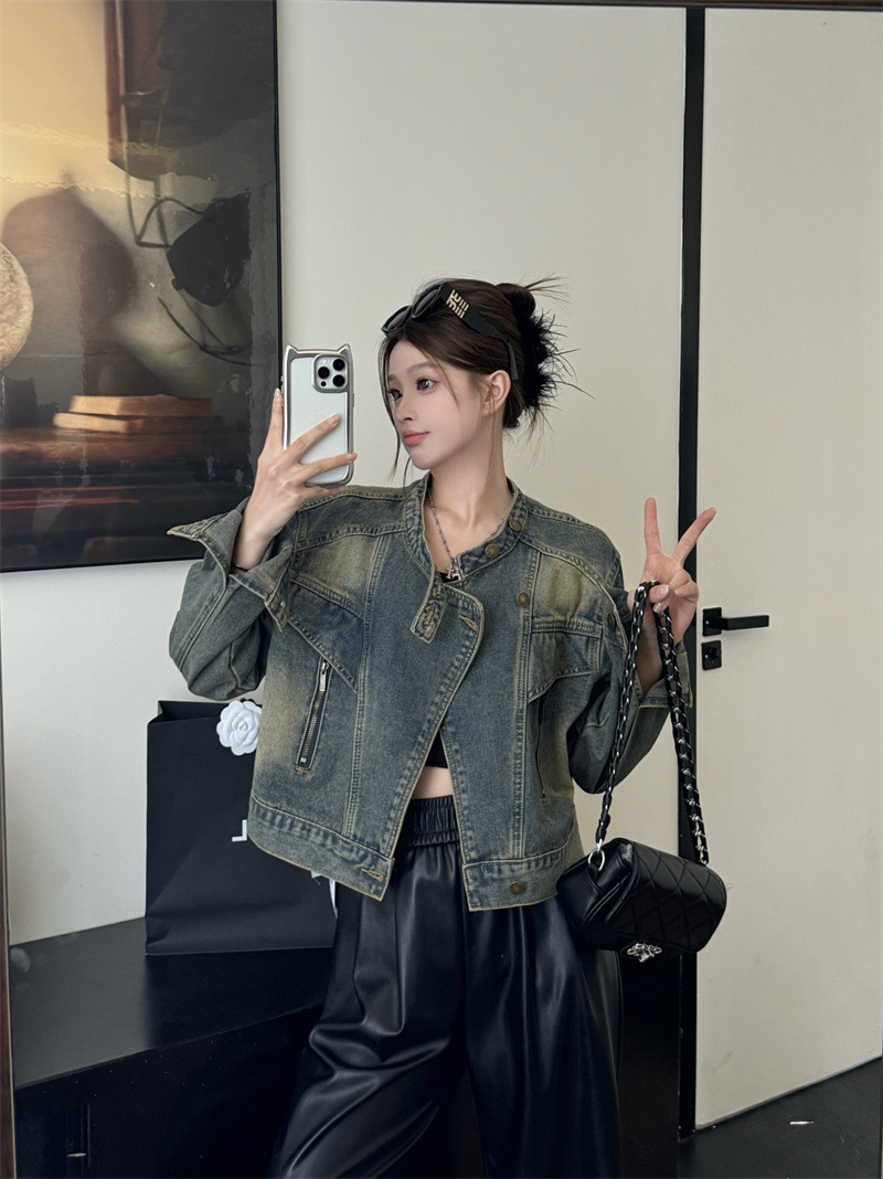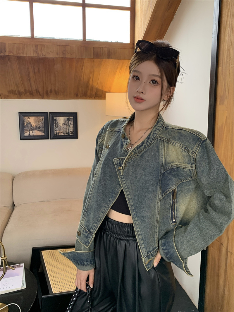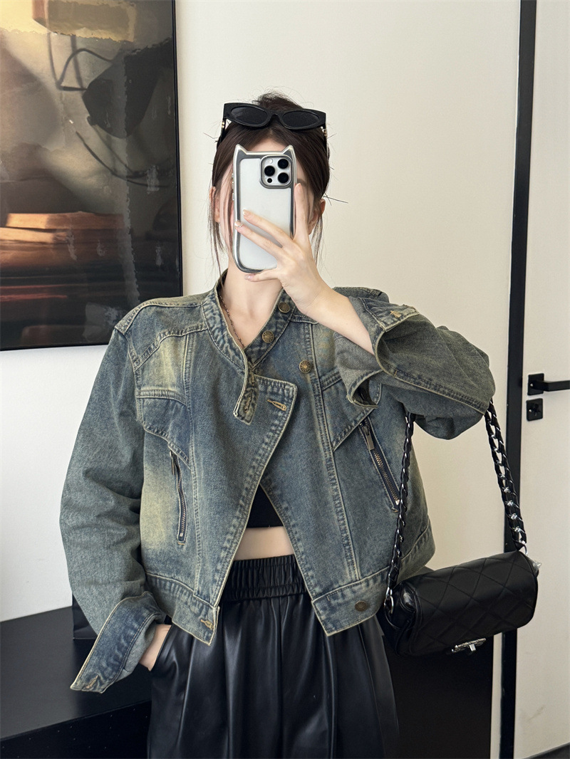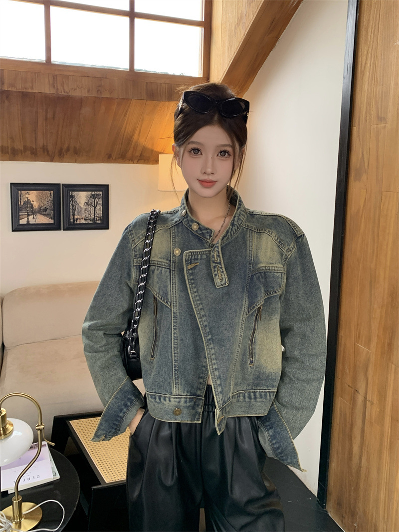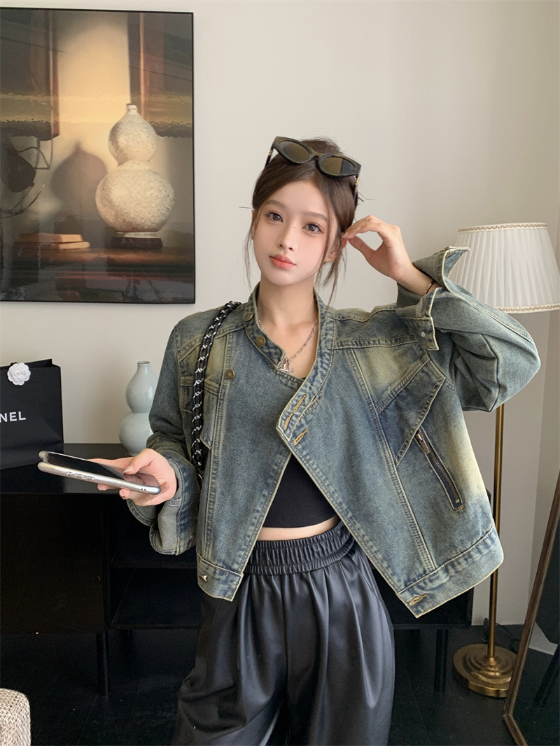 홍콩 스타일 빈티지 칼라 데님 재킷 여성의 봄과 가을 새로운 디자인 센스 하이 엔드 웨스턴 스타일 루즈 재킷 트렌디 탑스토어 가기