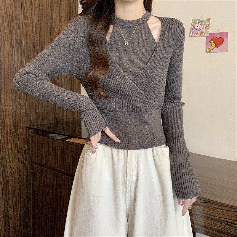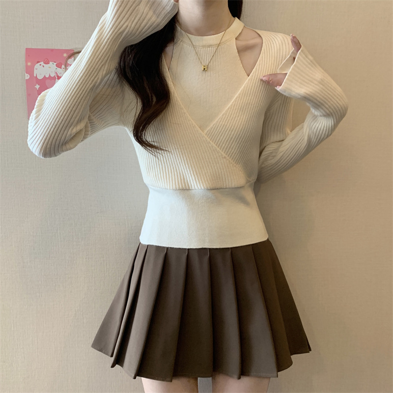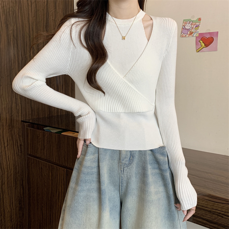 2024 새로운 가을 원피스 디자인 틈새 중공 니트웨어 여성용 가짜 2 피스 슬림 핏 스웨터베이스 레이어 셔츠 탑스토어 가기