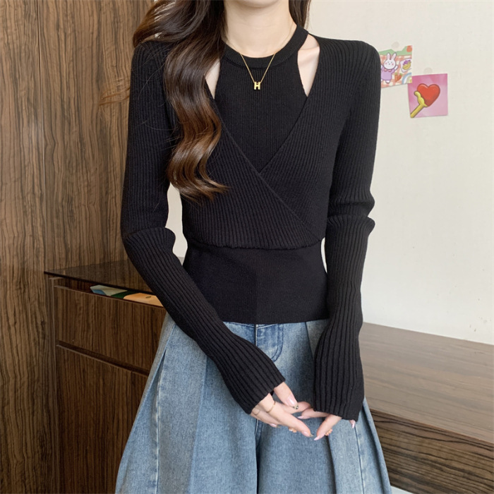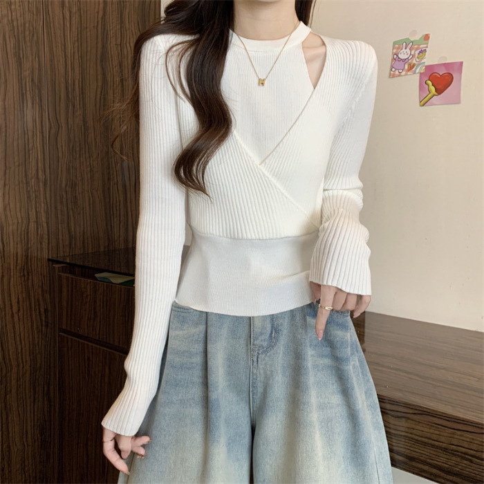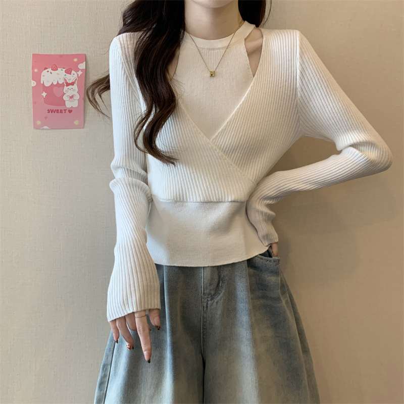 2024 새로운 가을 원피스 디자인 틈새 중공 니트웨어 여성용 가짜 2 피스 슬림 핏 스웨터베이스 레이어 셔츠 탑