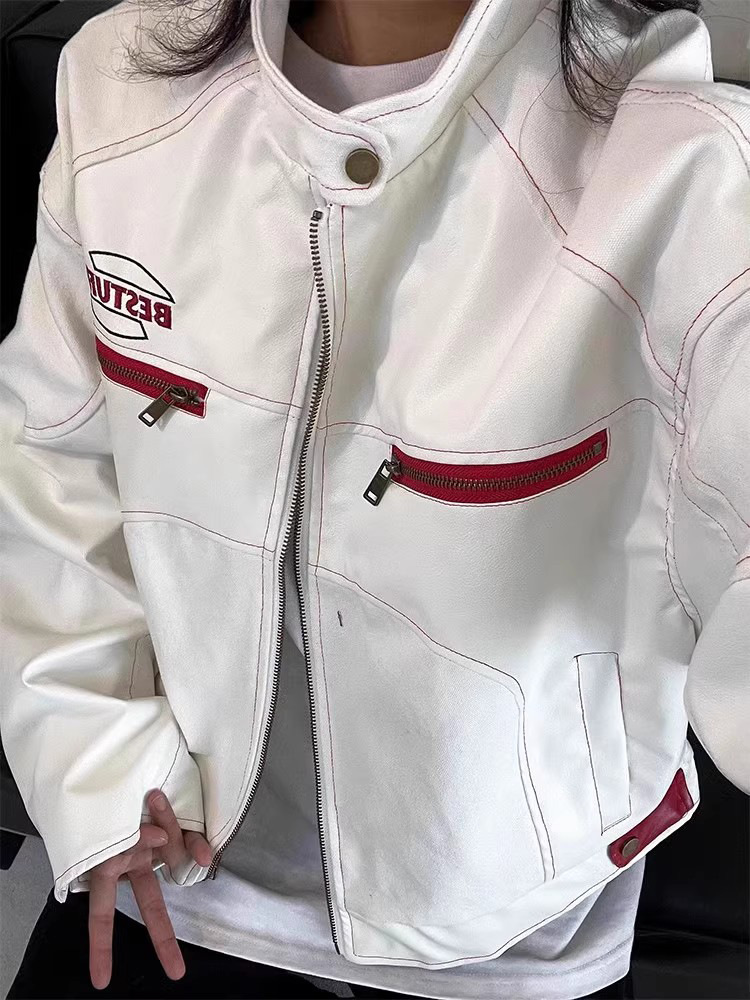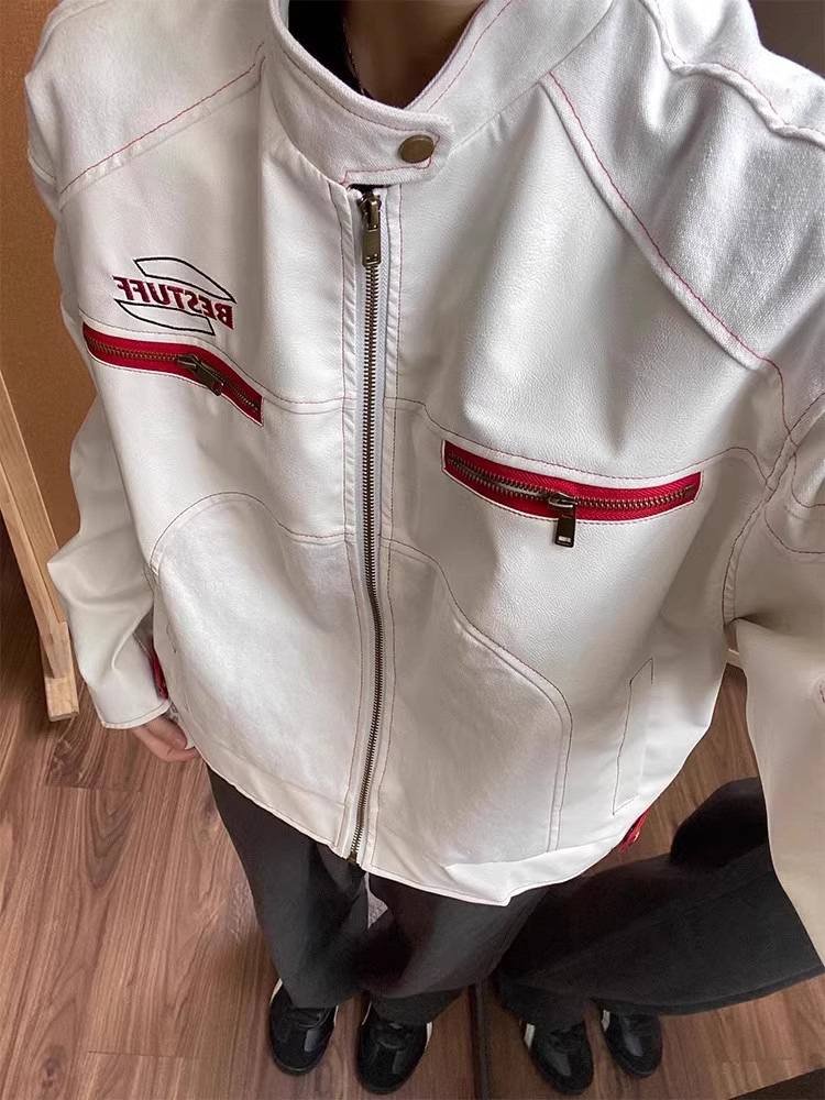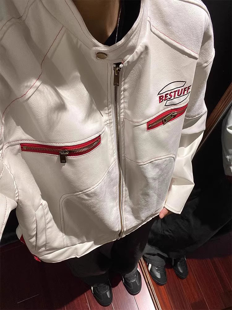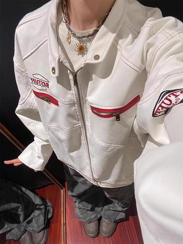 흰색 짧은 가죽 자켓 남자의 가을과 겨울 미국 스타일 하이 스트리트 베어러 세트 패션 브랜드 하이 엔드 스타일 수직 칼라 자수 재킷스토어 가기