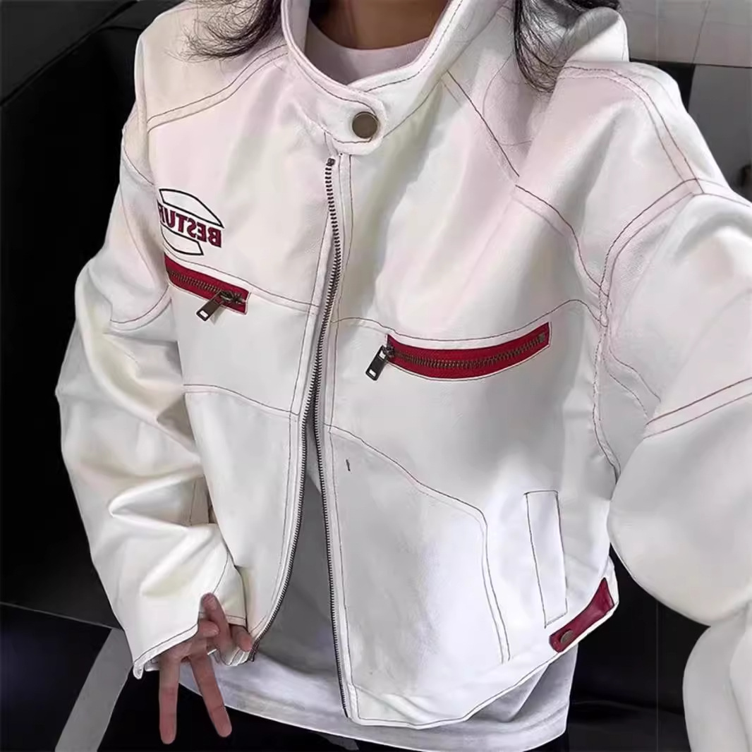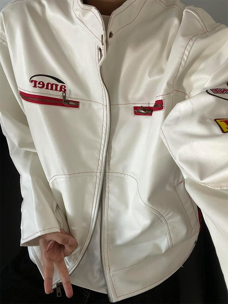 흰색 짧은 가죽 자켓 남자의 가을과 겨울 미국 스타일 하이 스트리트 베어러 세트 패션 브랜드 하이 엔드 스타일 수직 칼라 자수 재킷