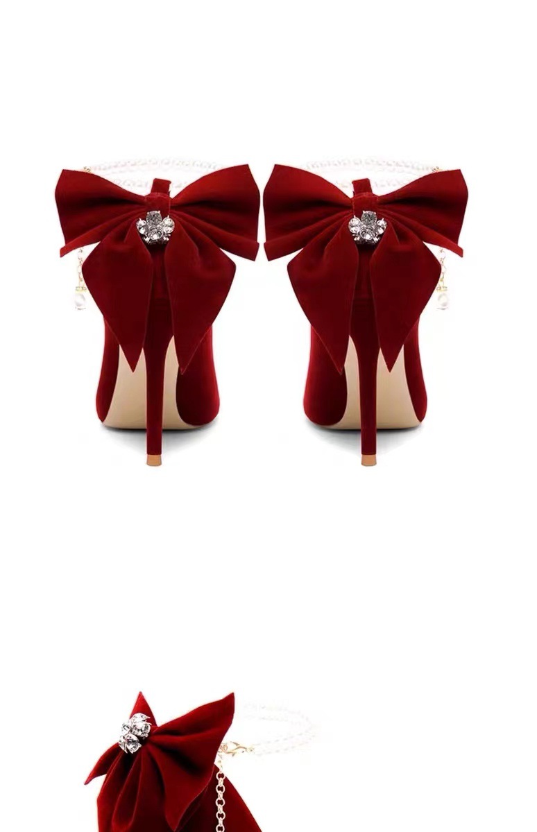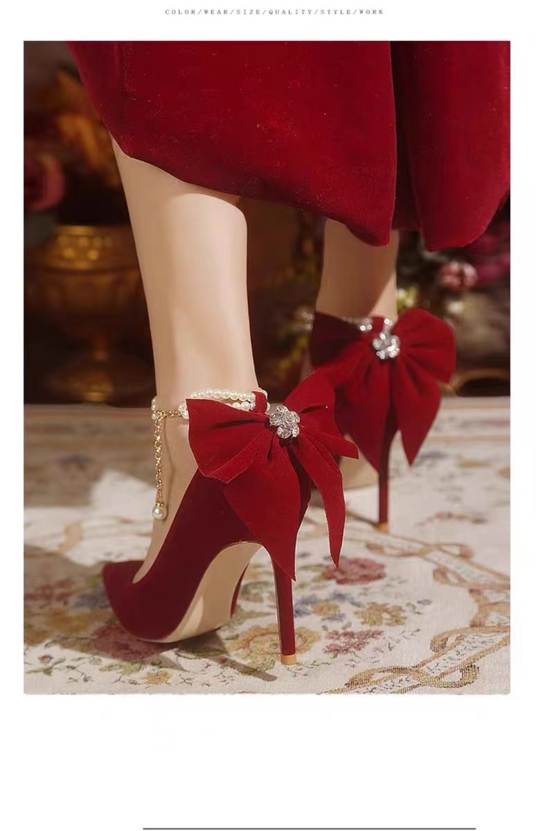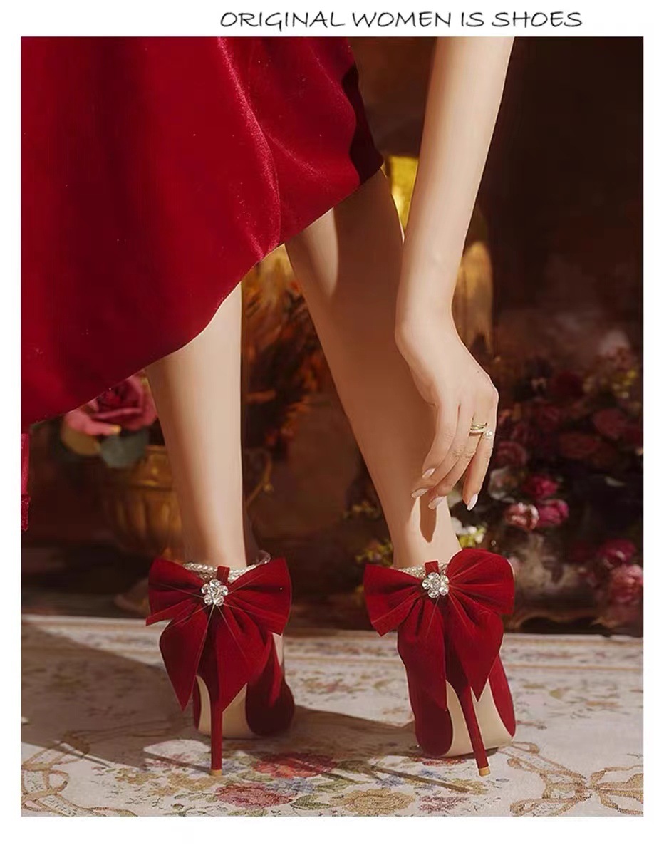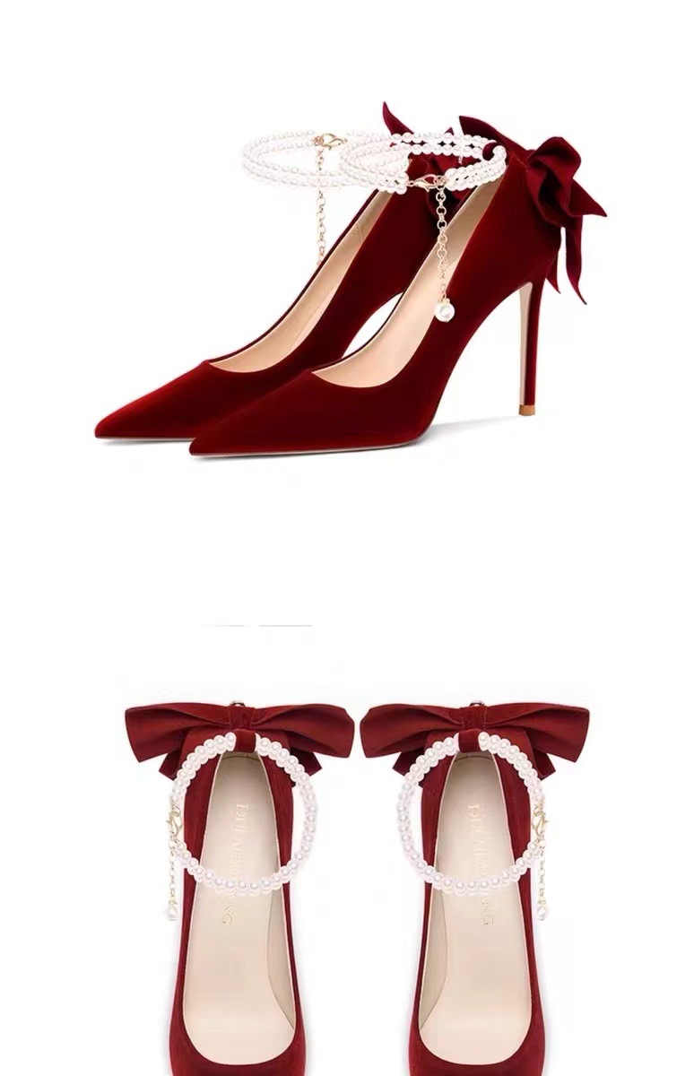신부 신부 들러리 웨딩 웨딩 스틸레토 힐 뾰족한 뒤꿈치 여성용 스웨이드 레드 펄 싱글 레이어 신발스토어 가기