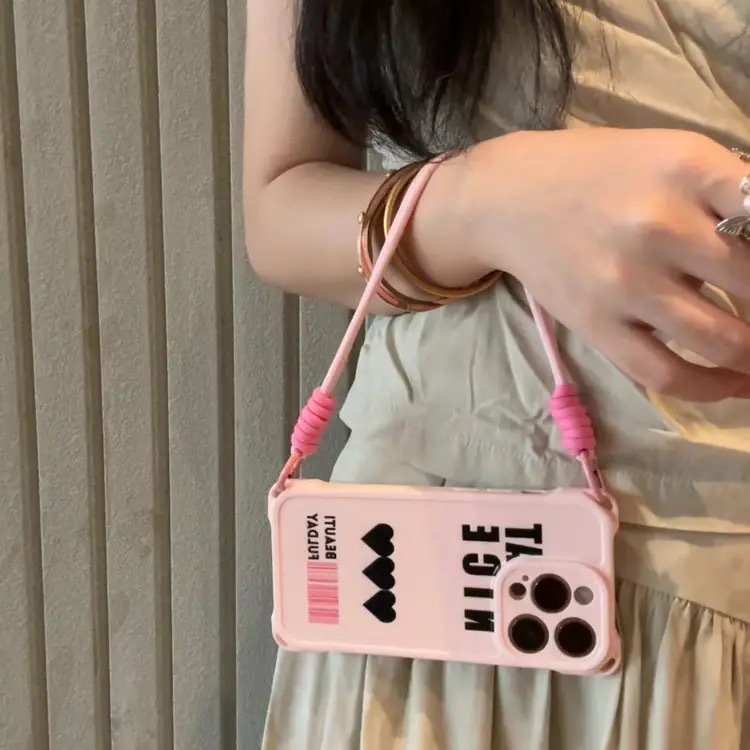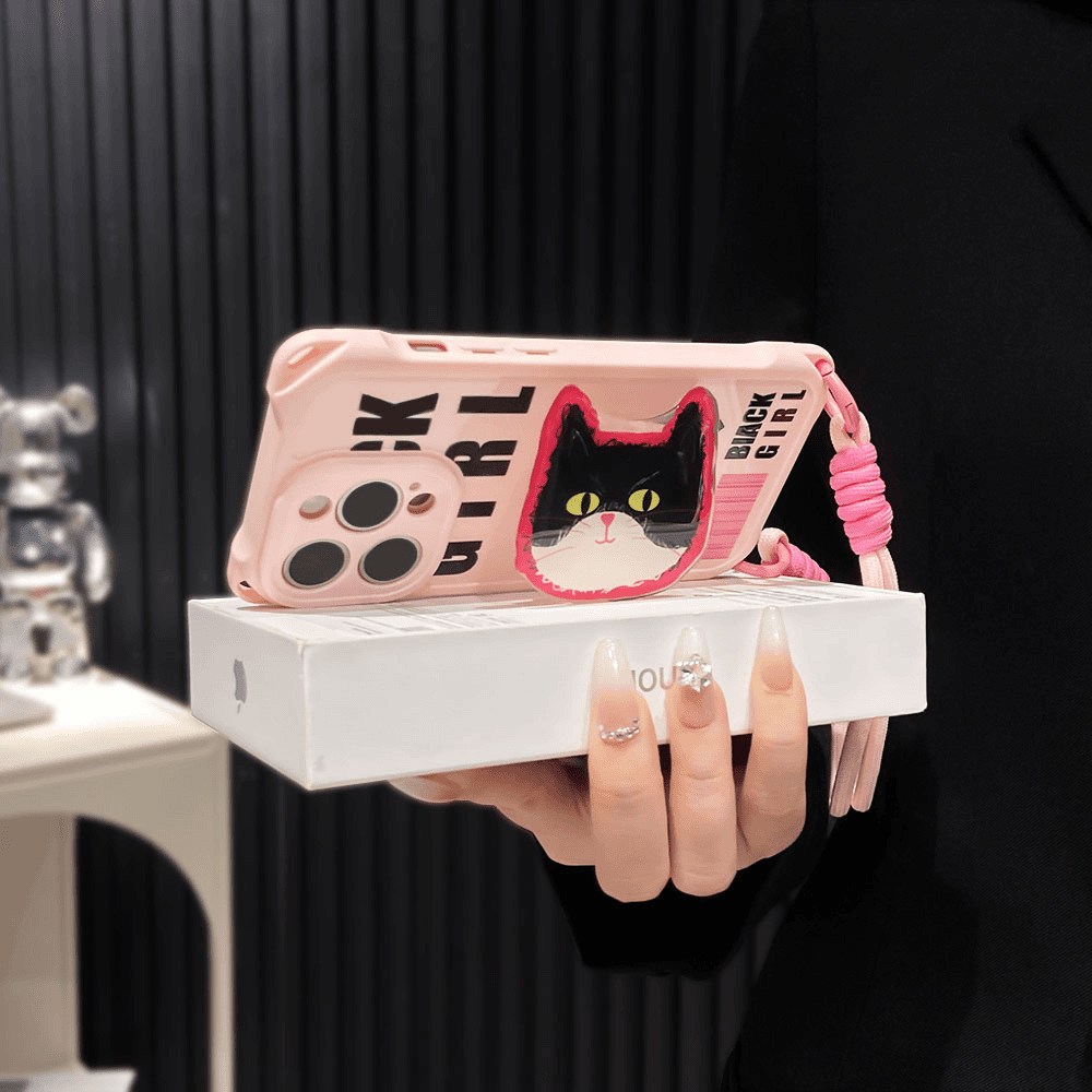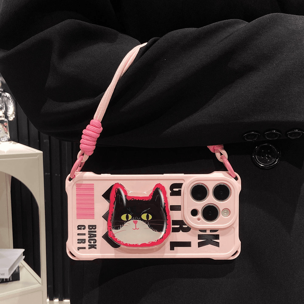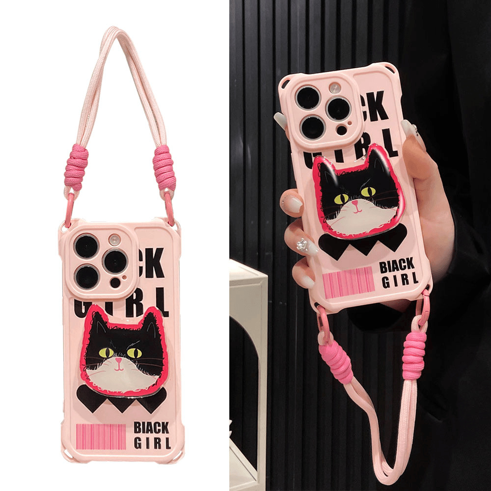 Ins Black Cat 새로운 Apple 16promax 전화 케이스 15 IP13 Four Corner Hole Lanyard Case xsmax