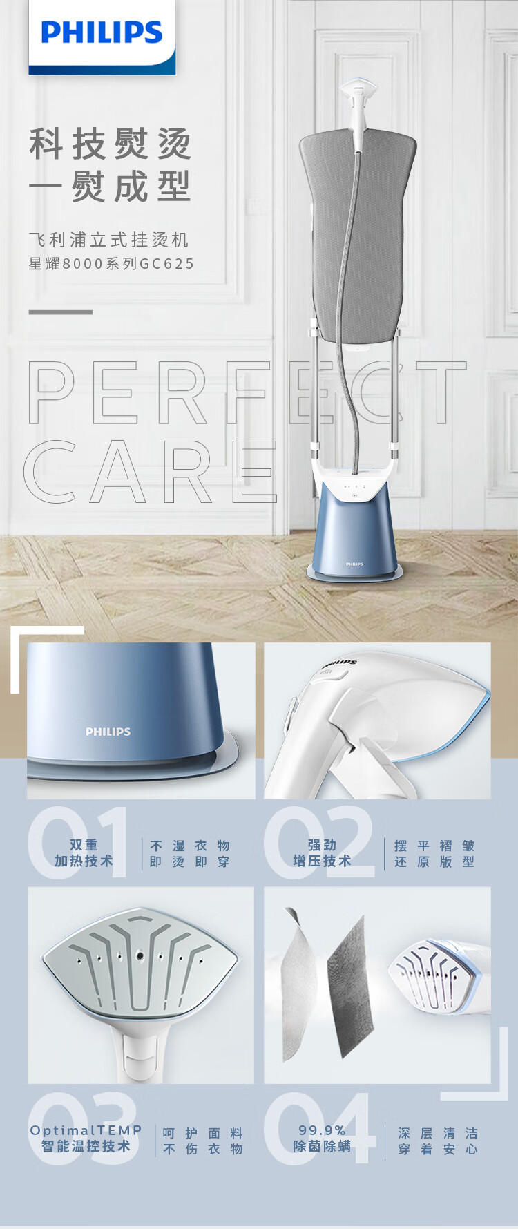 필립스 매달려 다림질 기계 GC625 가압 증기 다림질 기계 가정용 살균 및 진드기 제거 더블 로드 수직 지능형 온도 제어