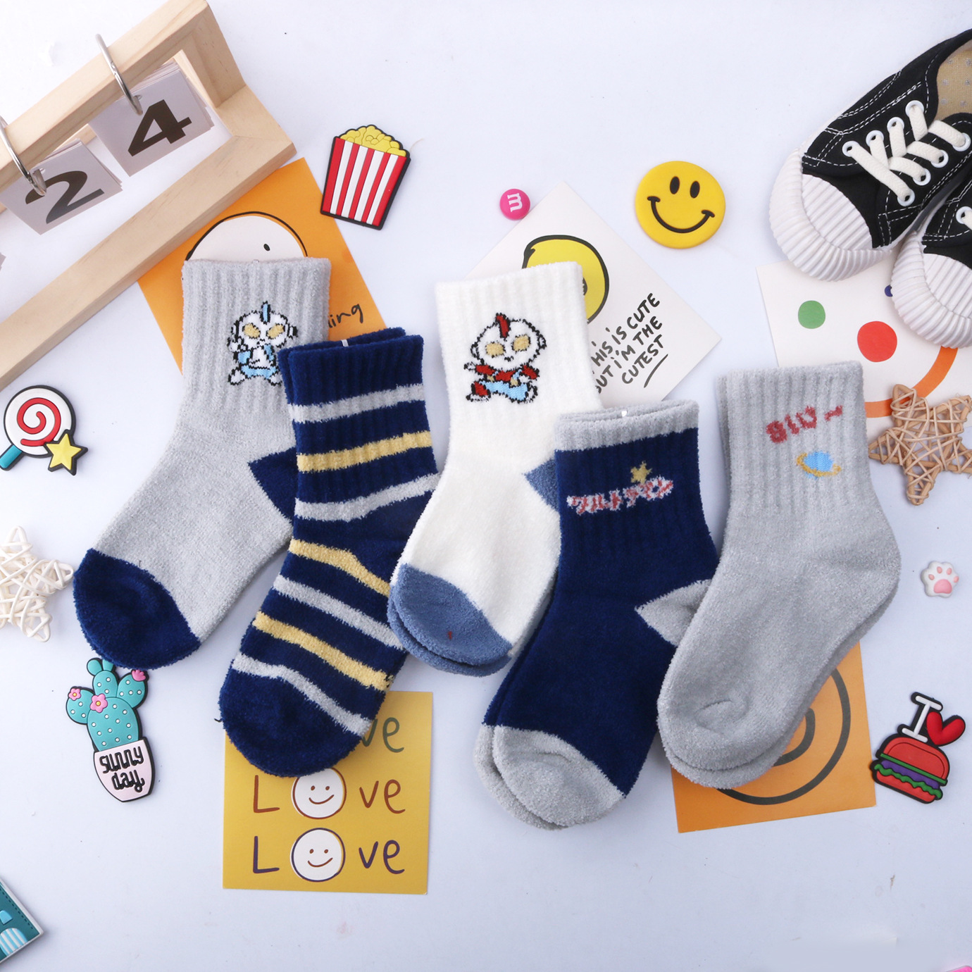 어린이 양말 겨울 기모 두꺼운 양면 벨벳 스타킹 소년 귀여운 만화 따뜻한 양말 수면 양말