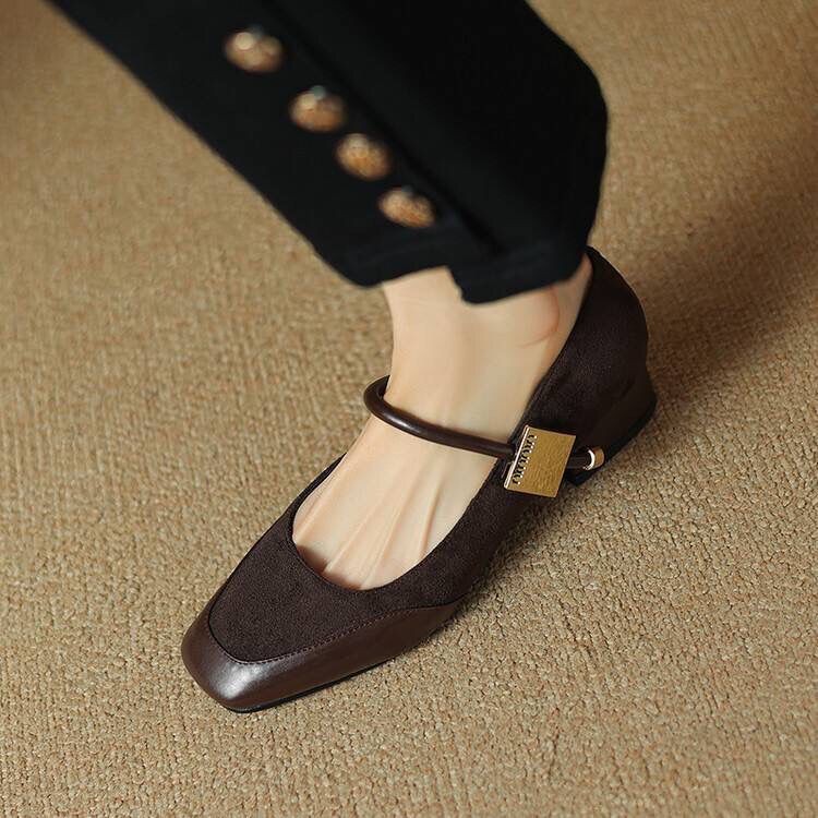 프랑스 미드 힐 뉴 메리 제인 신발 여성용 빈티지 버건디 얕은 입 스퀘어 발가락 싱글 레이어 신발 금속 버클 두꺼운 힐 하이힐 신발