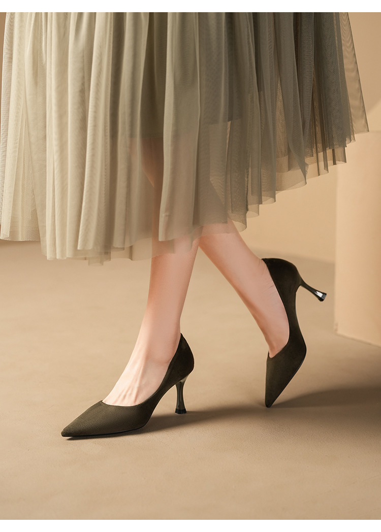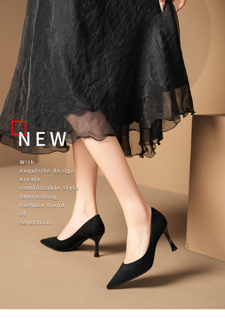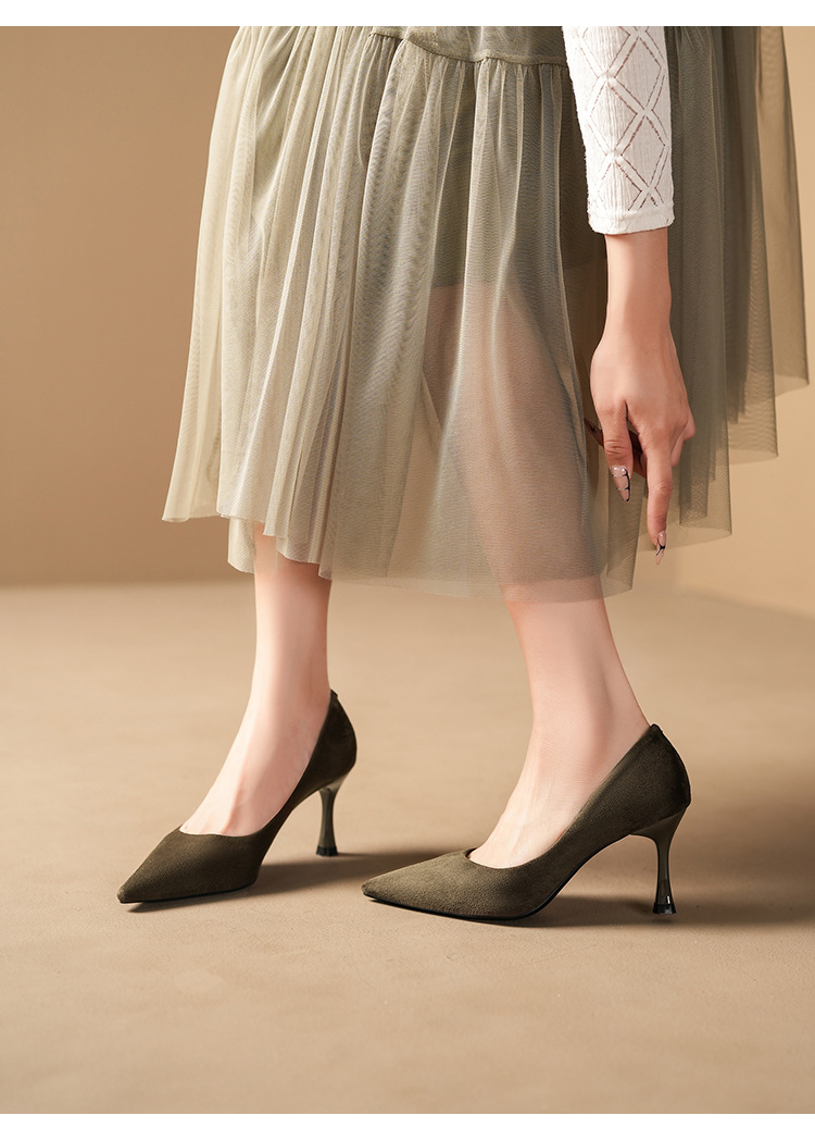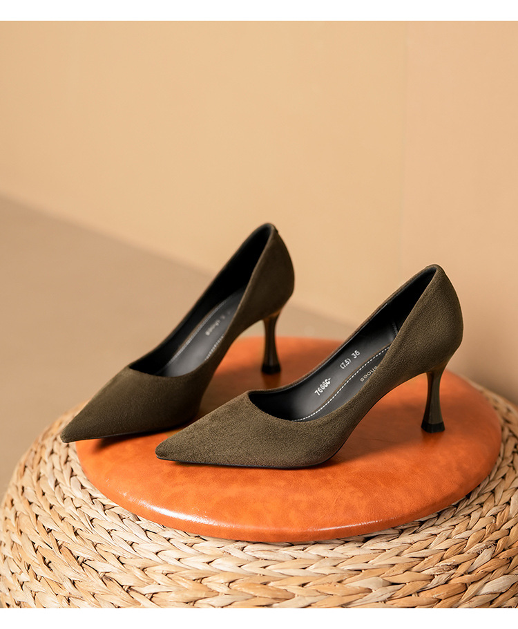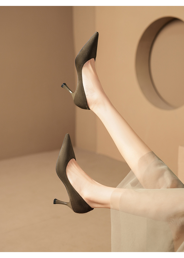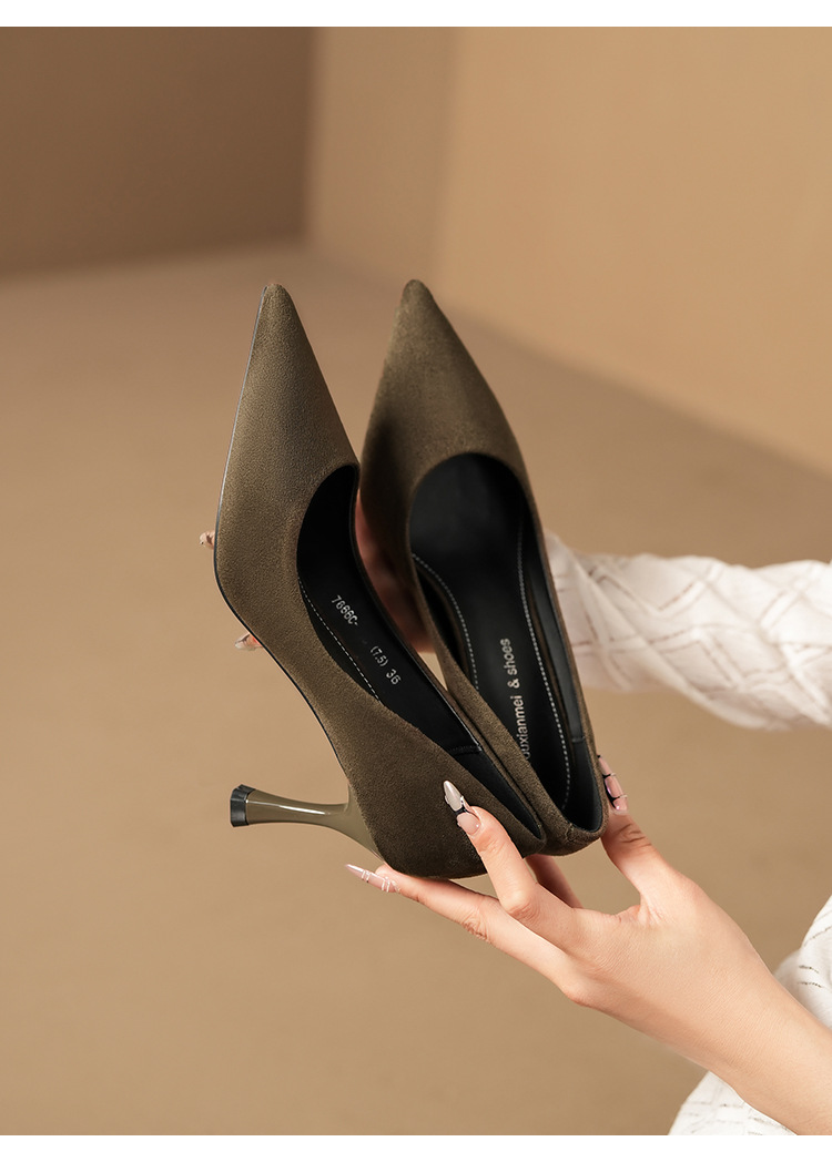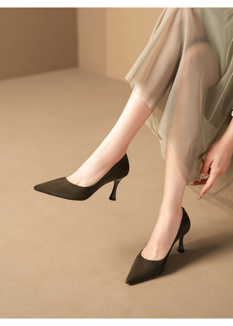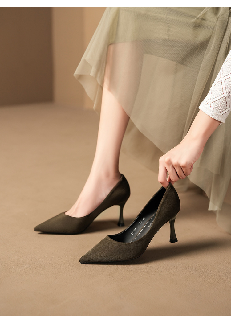 7666C 스웨이드 뾰족한 스틸레토 힐 간단한 기질 여성 신발 피곤하지 않은 발 통근 전문 신발 패션 하이힐