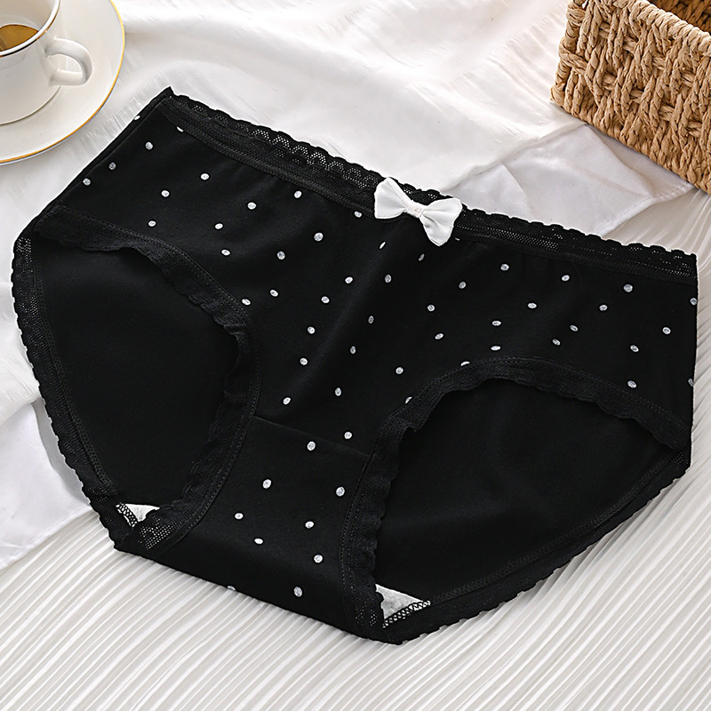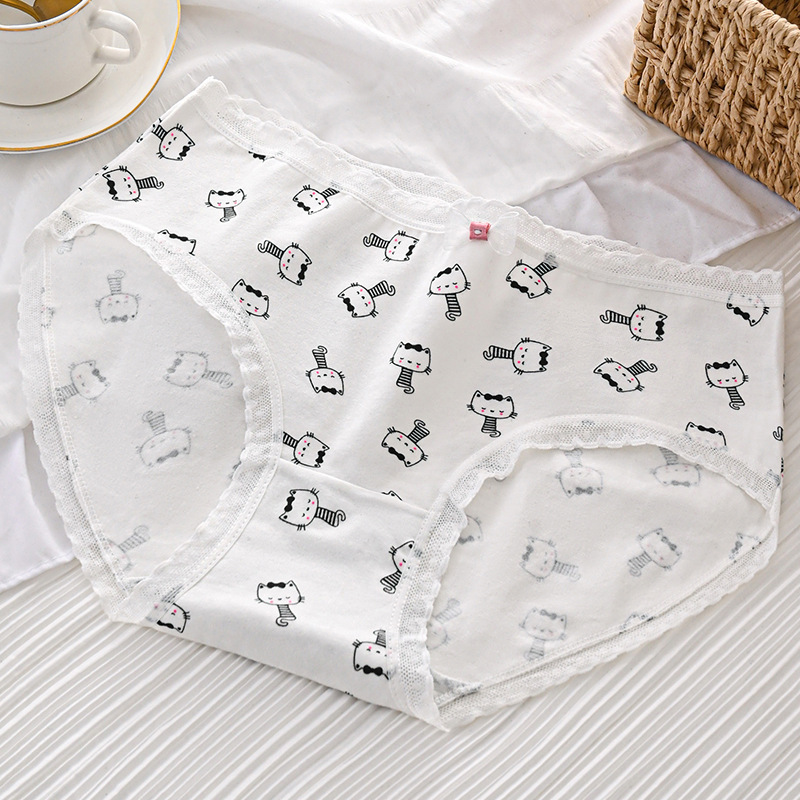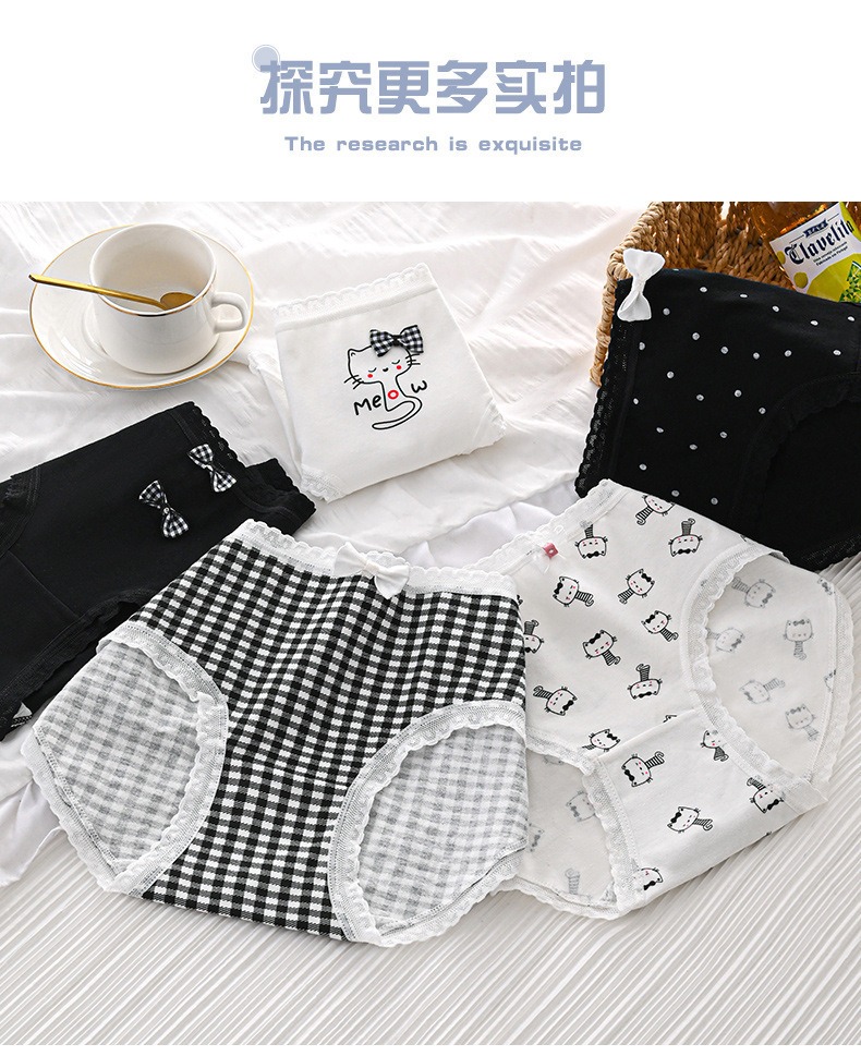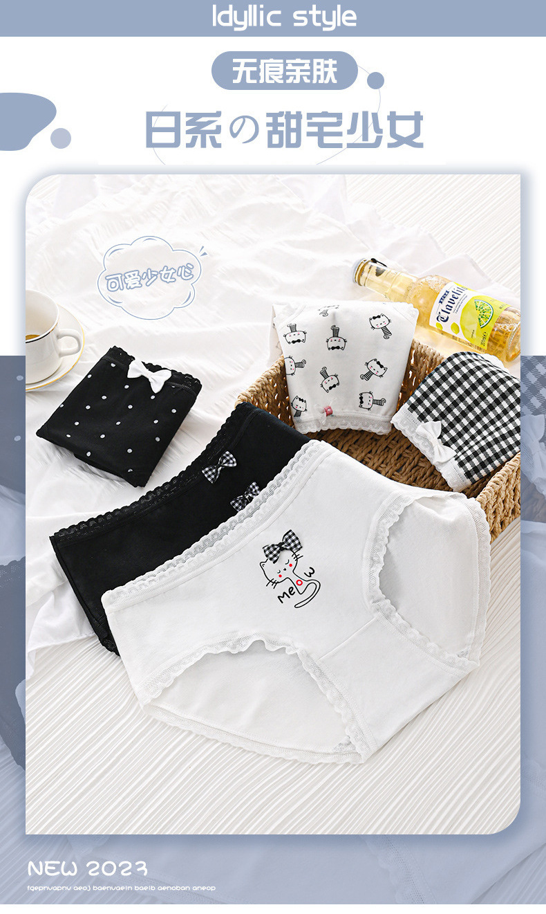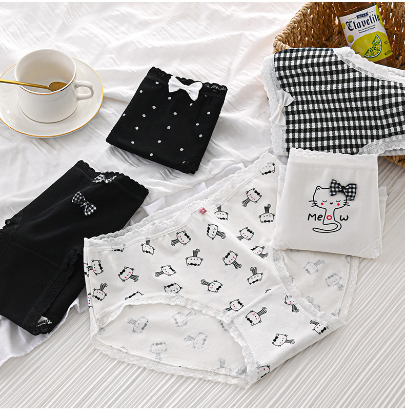 일본식 소녀 속옷 여성 더블 레이어 내부 크로 치 간단한 흑백 고양이 인쇄 귀여운 가방 엉덩이 중간 허리 학생의 브리프스토어 가기