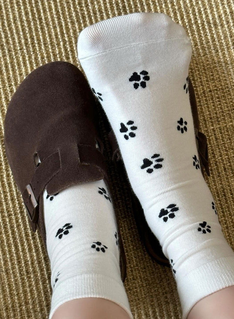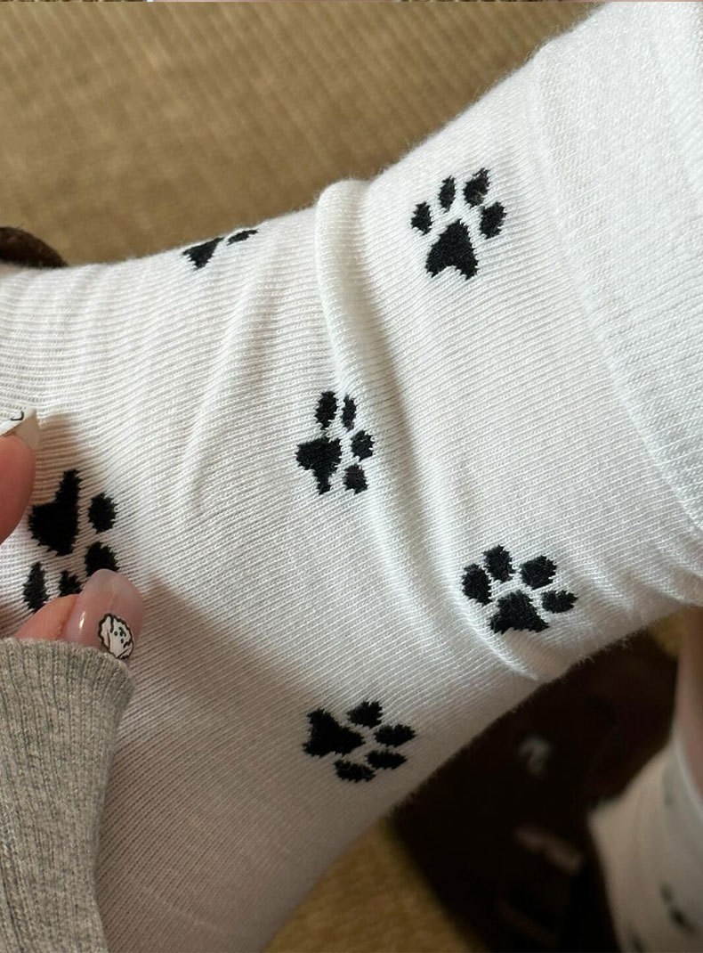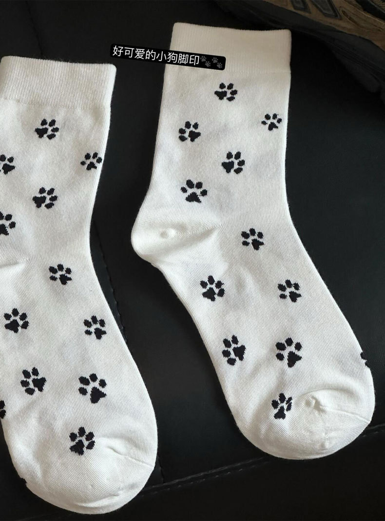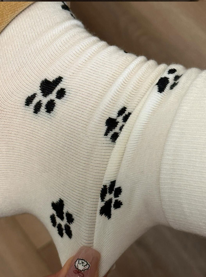 한국 스타일 s 스타일 귀여운 강아지 발 인쇄 양말 여성의 중간 튜브 양말 흑백 회색 틈새 디자인 순수한면 쌓인 양말
