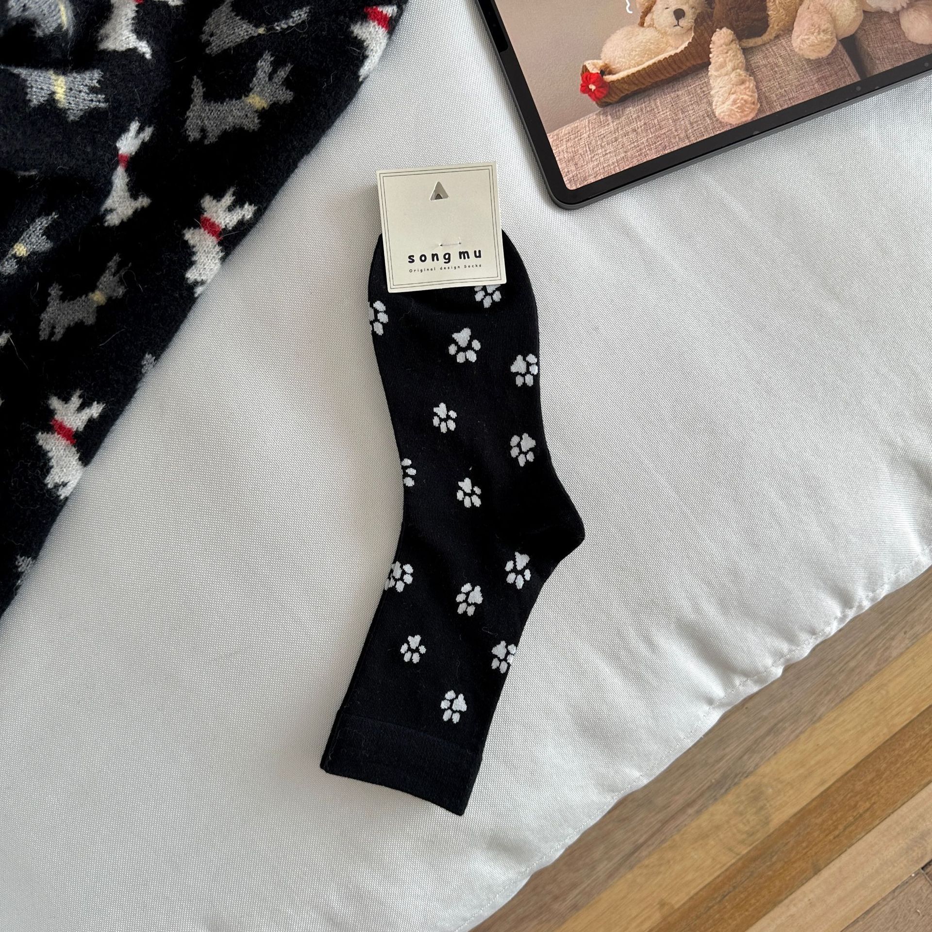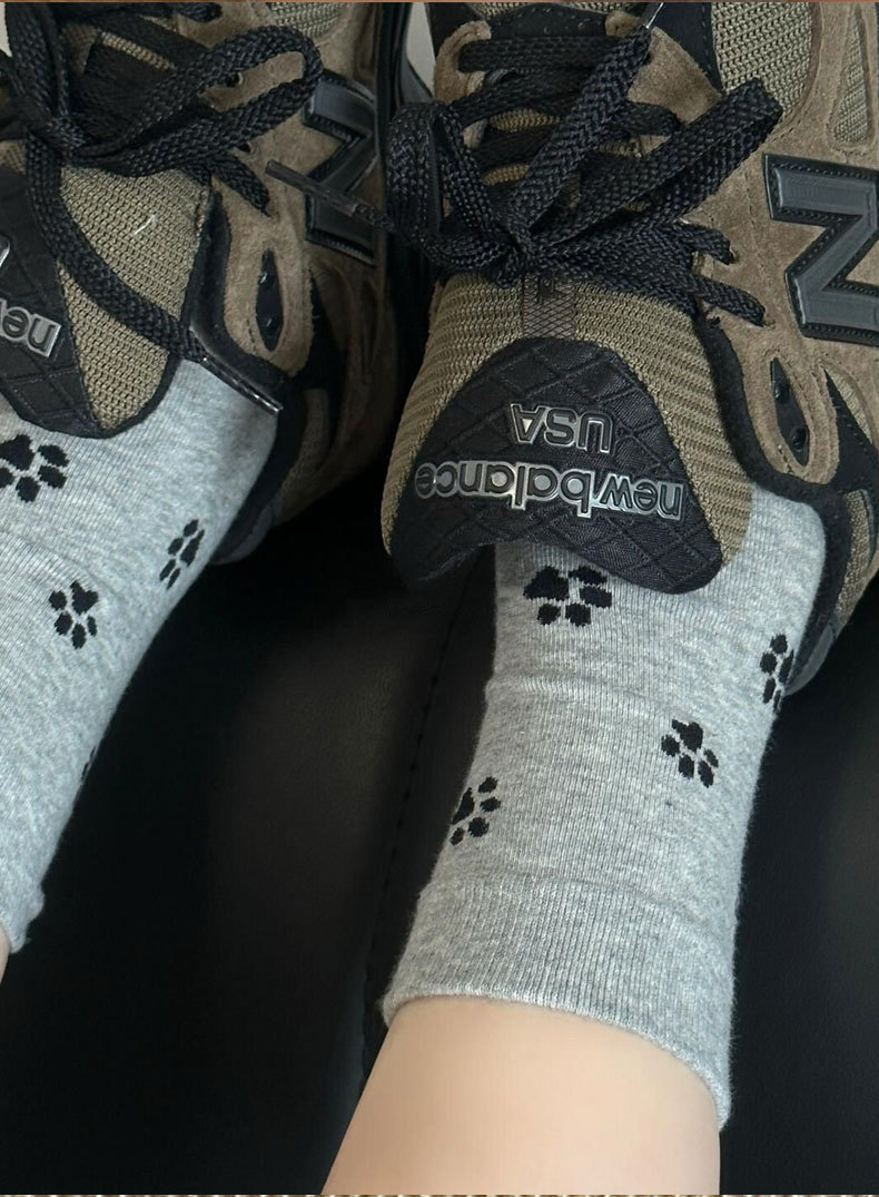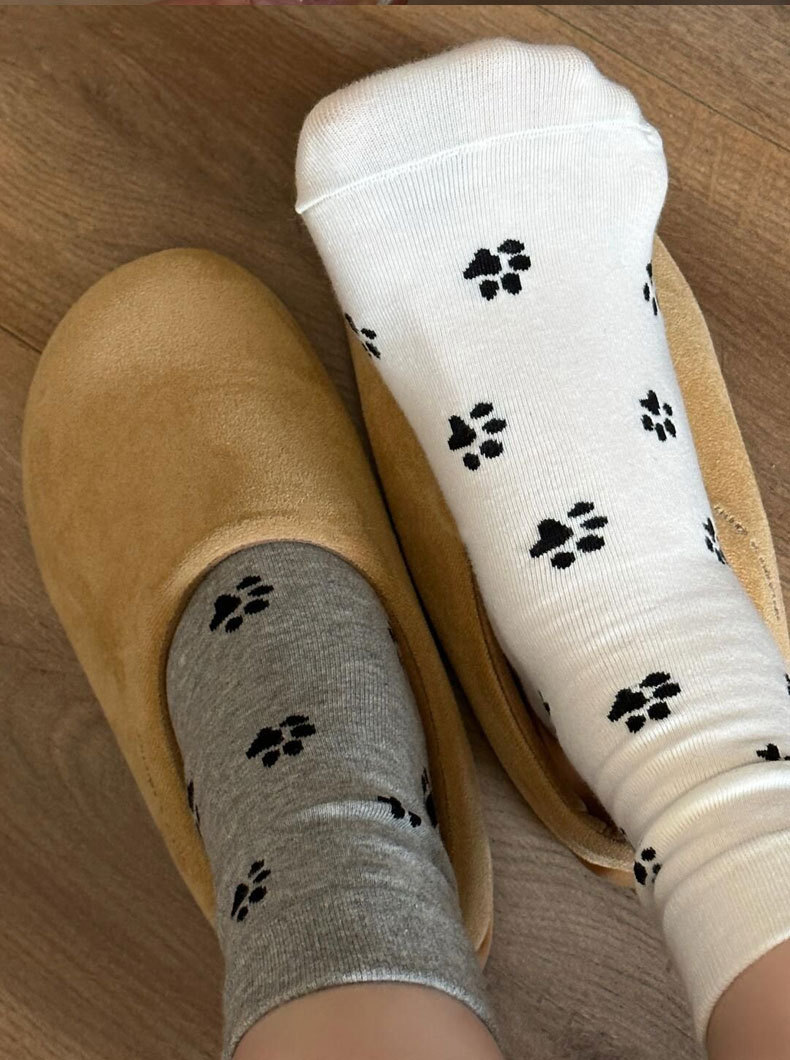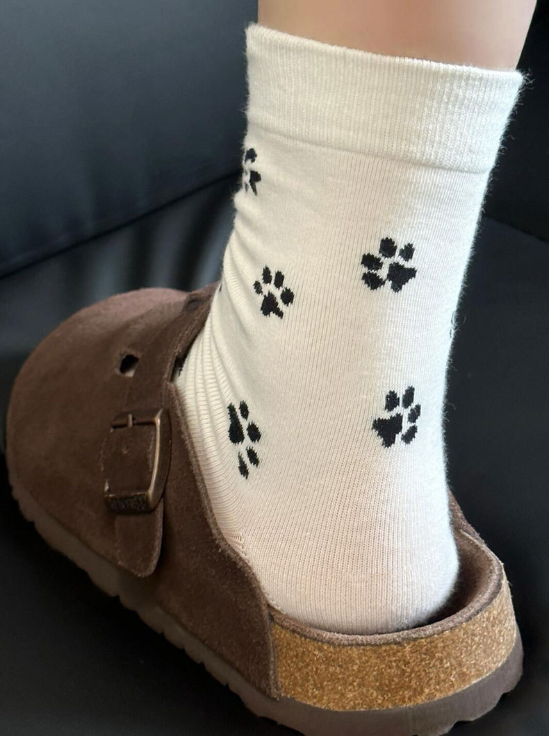 한국 스타일 s 스타일 귀여운 강아지 발 인쇄 양말 여성의 중간 튜브 양말 흑백 회색 틈새 디자인 순수한면 쌓인 양말
